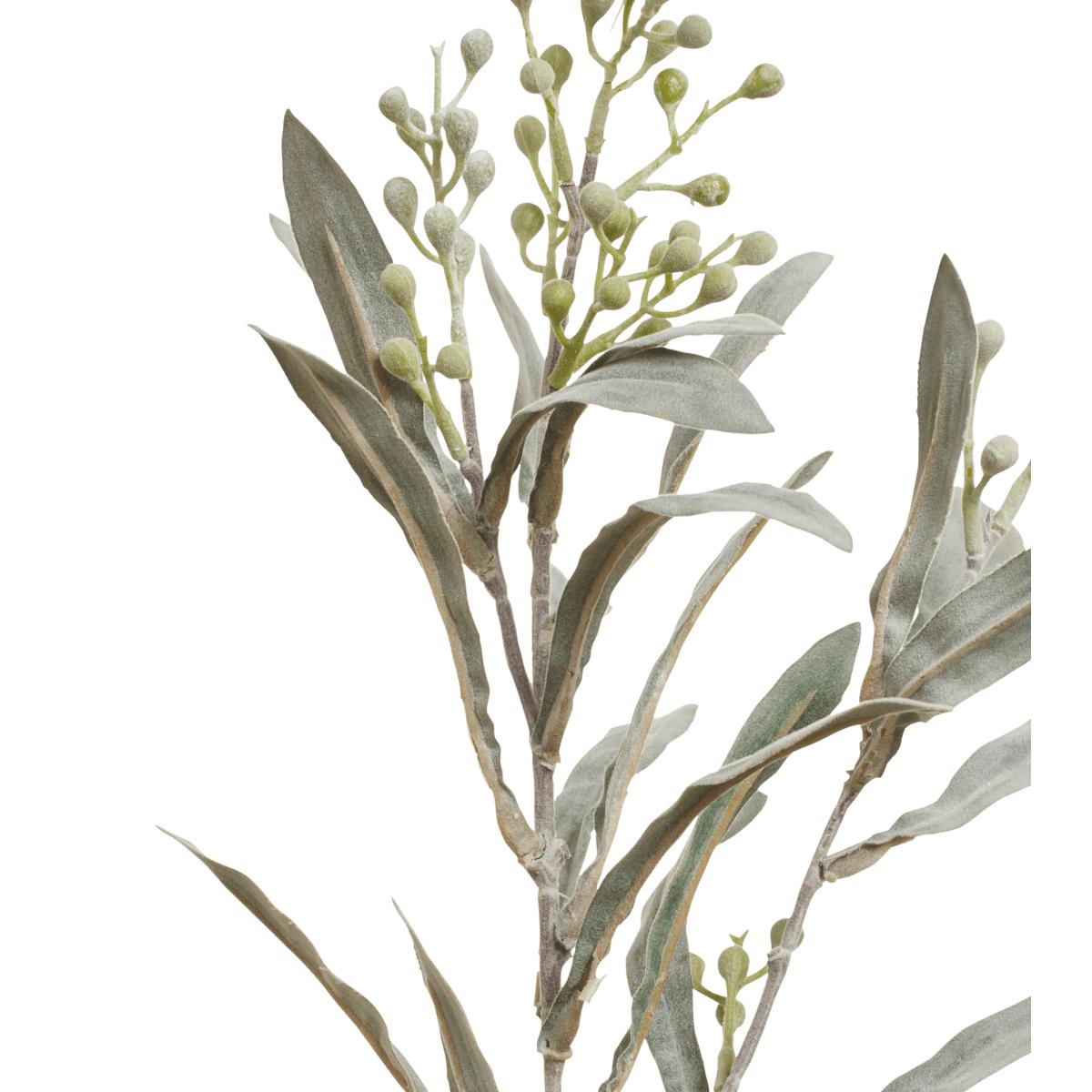 This artificial stem, featuring fresh green leaves and highly textured buds, is based on ready-to-blossom seeded eucalyptus. Stems such as this work well as filler greenery to add volume and tonal variation a colourful bouquet, but they also complement other variants of eucalyptus.