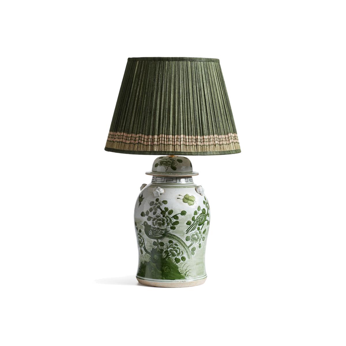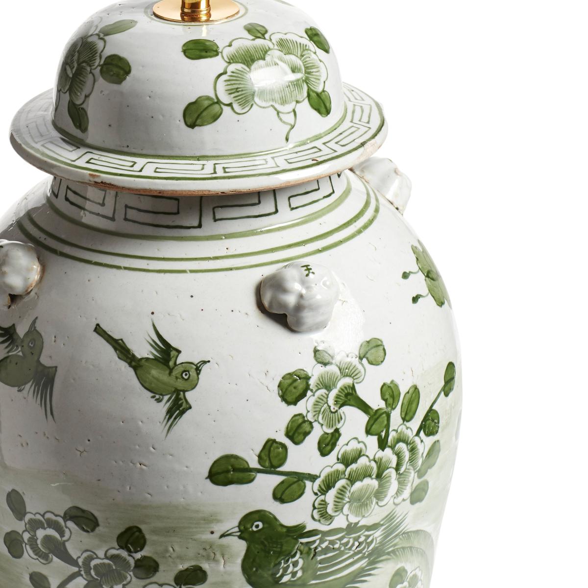 This beautiful ceramic lamp is inspired by the traditional ginger jar. It is hand-decorated with gargoyles and birds in a classic Chinese landscape scene. The hand-painted jade green birds have a mythical quality about them, which is why we named it after the immortal birds in Chinese mythology that reigned over all others. A purposefully distressed finish makes the Fenghuang look antique.
