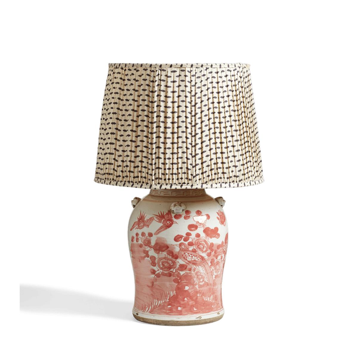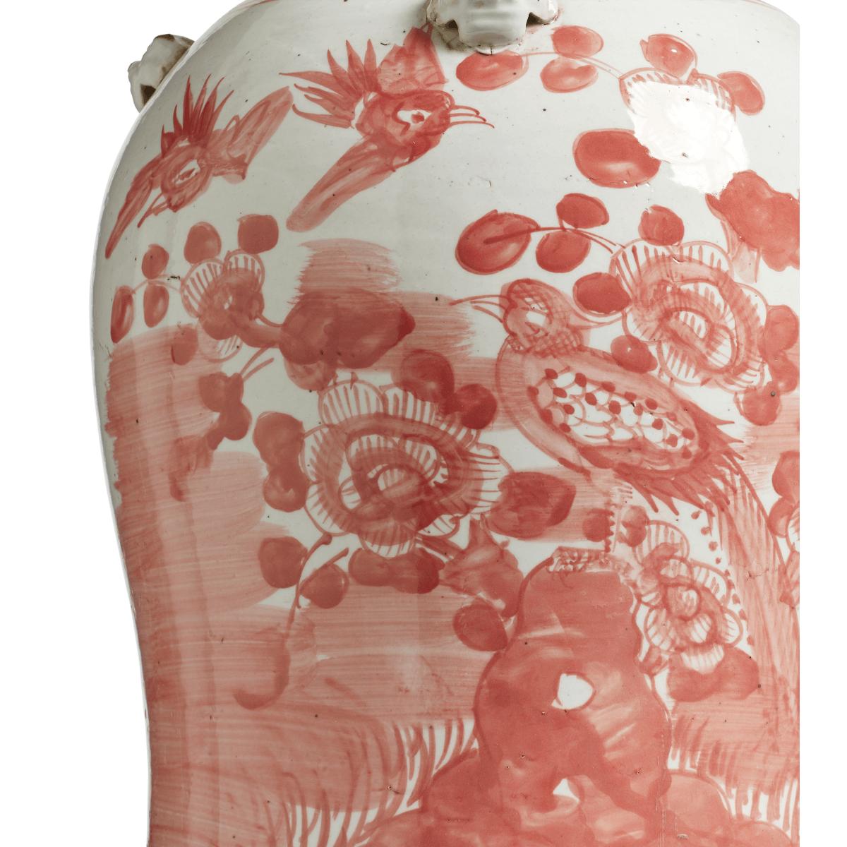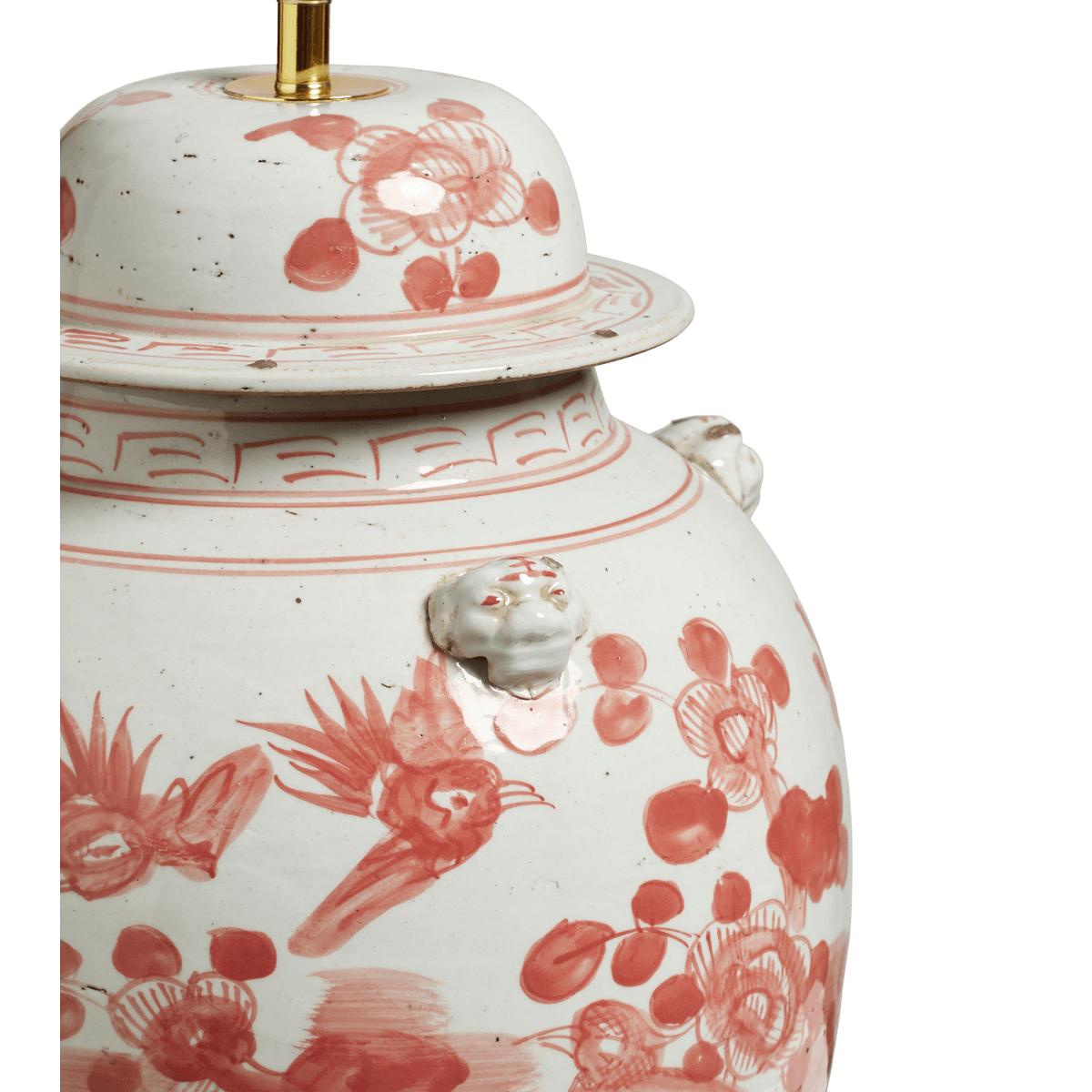 This beautiful ceramic lamp is inspired by the traditional ginger jar. It is hand-decorated with gargoyles and birds in a classic chinoiserie landscape scene. The hand-painted red birds have a mythical quality about them, which is why we named it after the immortal birds in Chinese mythology that reigned over all others. A purposefully distressed finish makes the Fenghuang look antique.