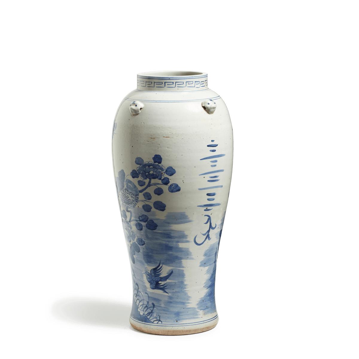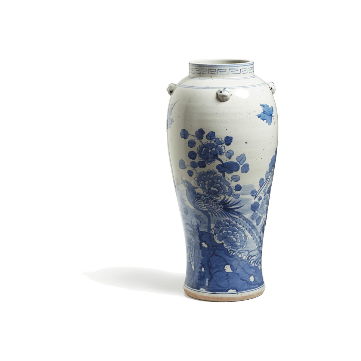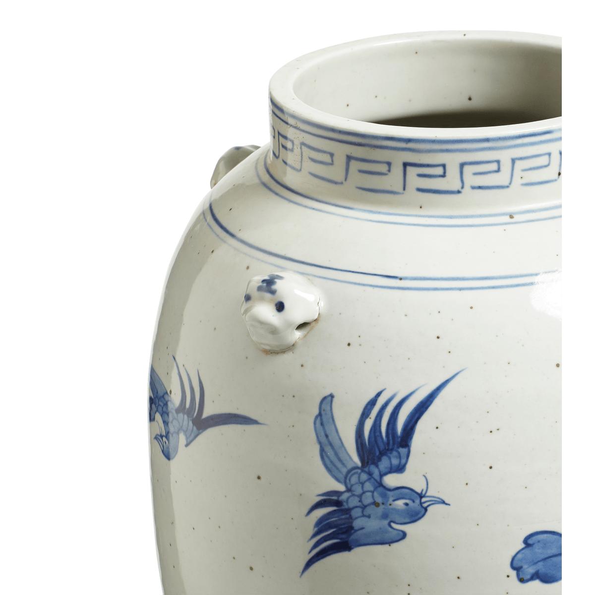 This beautiful ceramic umbrella stand matches our Fenghuang Table Lamp, inspired by traditional ginger jars. It is hand decorated with gargoyles and birds in a classic Chinese landscape scene. The hand-painted birds have a mythical quality about them, which is why we named it after the immortal birds in Chinese mythology that reigned over all others. A purposefully distressed finish makes the Fenghuang look antique.