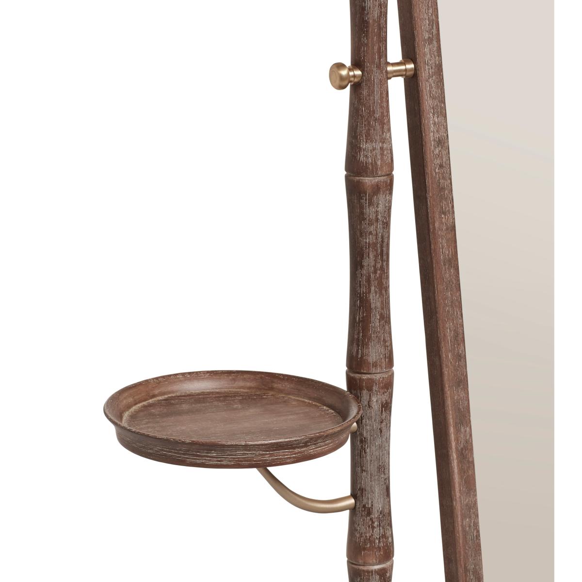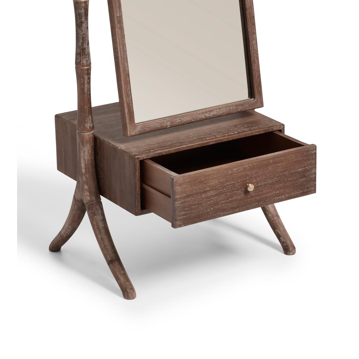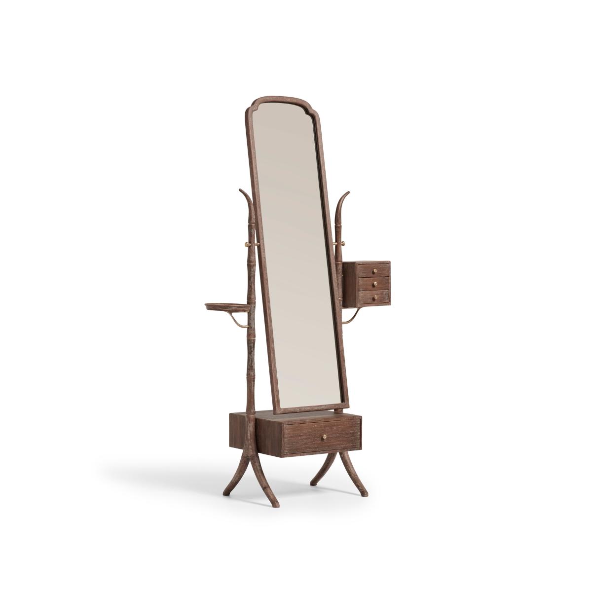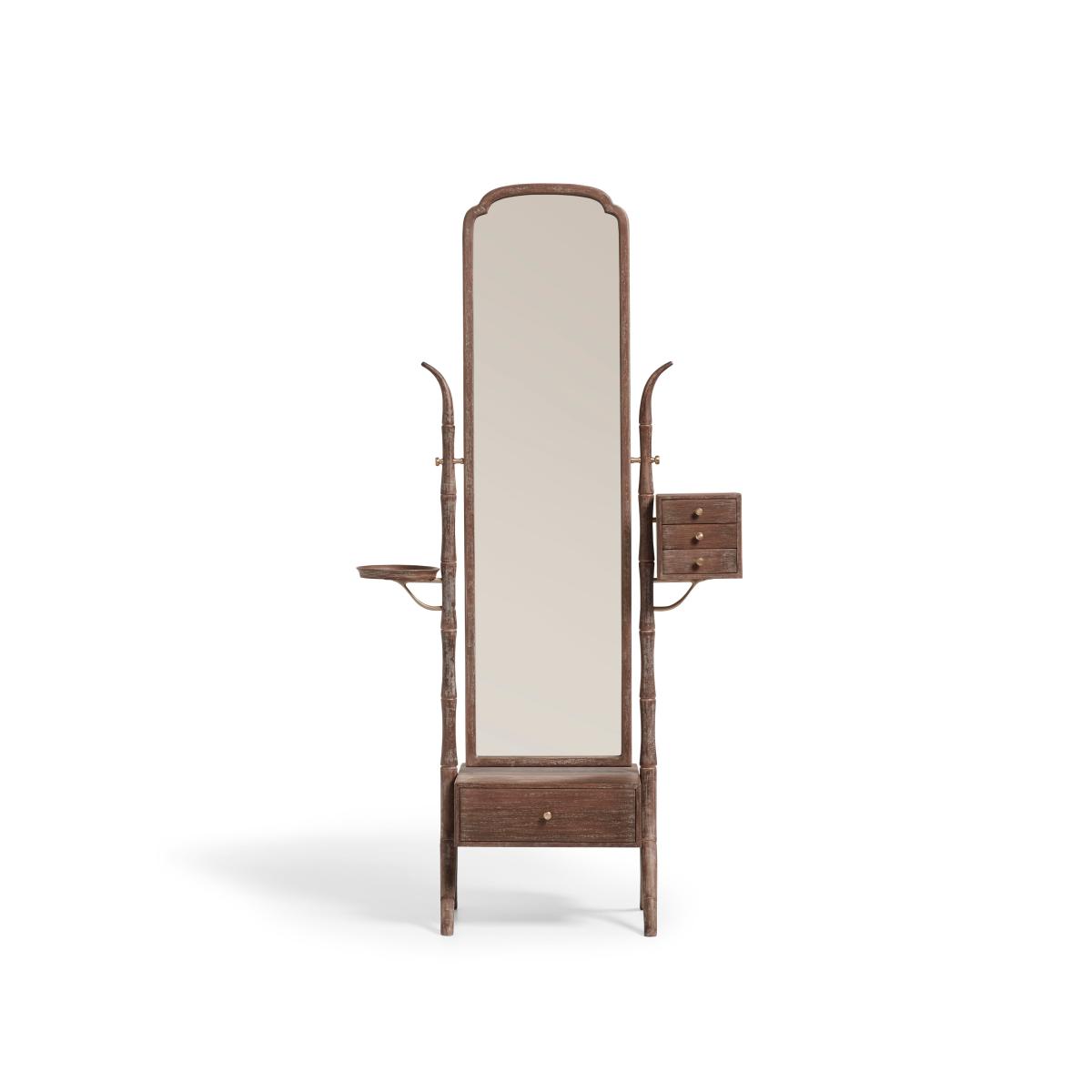 Our Fiorella Floor-Standing Mirror is handcrafted from solid beech wood and features a stylish bamboo-inspired frame that comprises a singular tray and a trio of small drawers at one side together with a large drawer at the base. An OKA signature, the burnt-oak finish is hand-applied, meaning no two pieces are ever the same, while antique-brass details complete the look.
