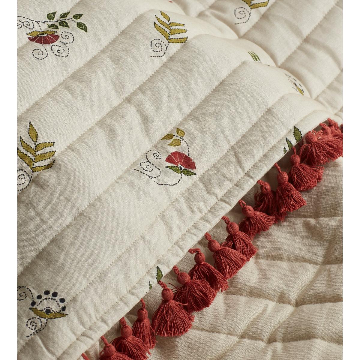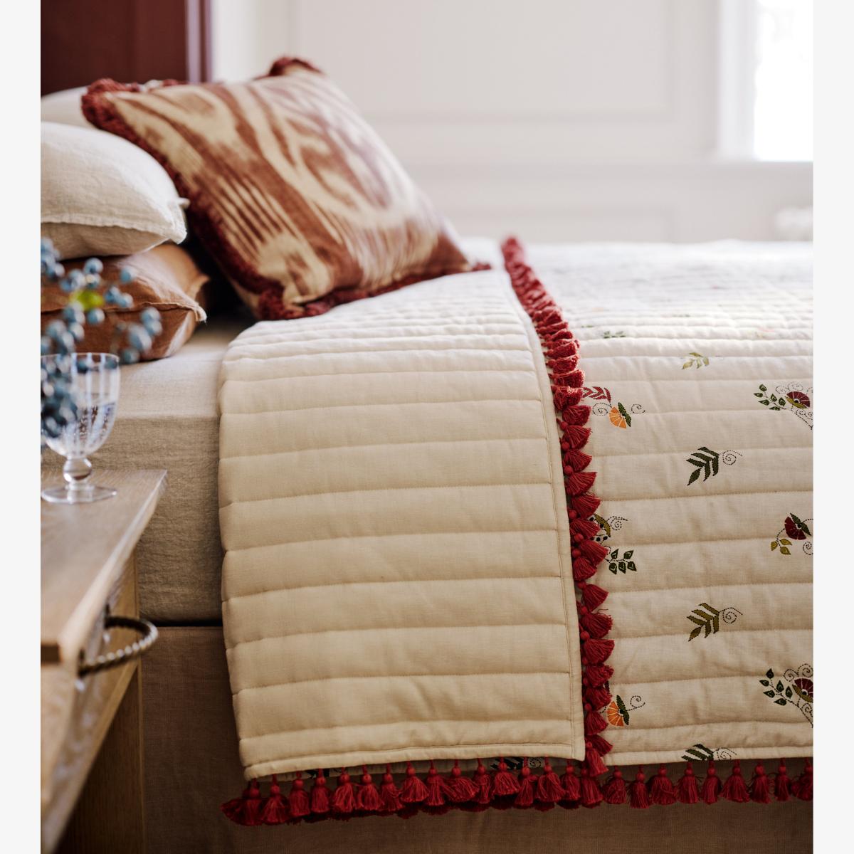 The Floralis Quilt features an intricate floral print on one side – inspired by an antique Indian Kantha swatch – that’s embroidered using a hand-guided technique onto dyed linen fabric. The embroidered decorative border and tassel fringes around the edges add decorative finishing touches.