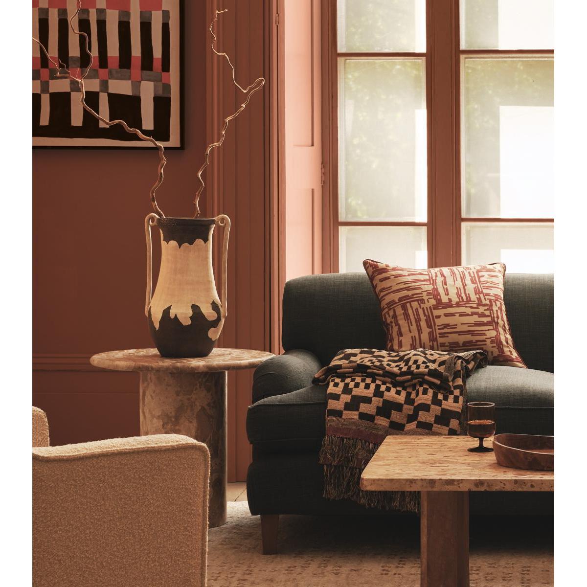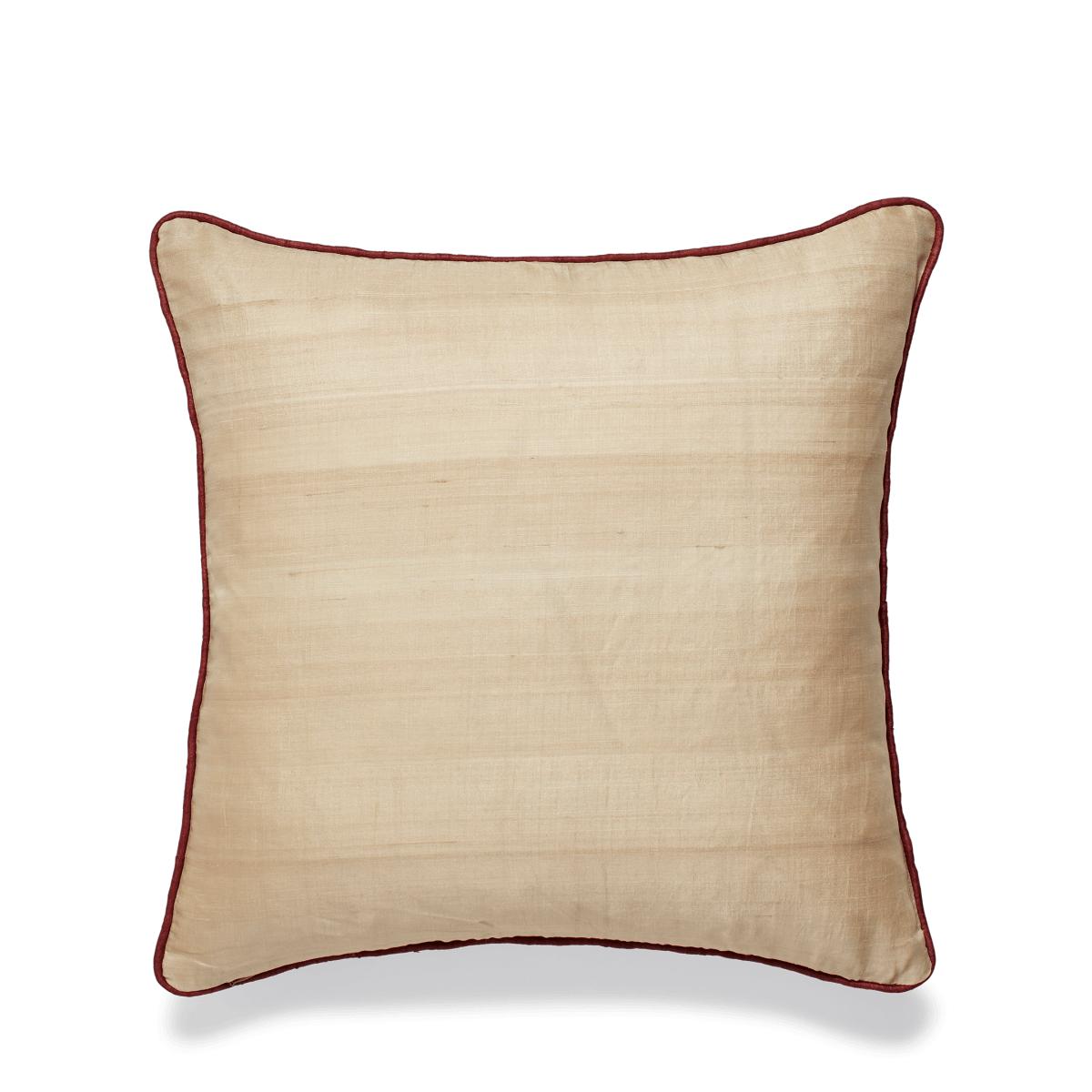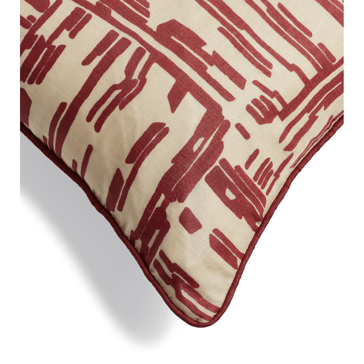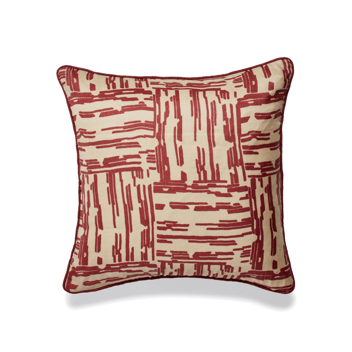 Bring some contemporary edge to your cushion collection with the abstract-striped Francis Cushion Cover. Handwoven from 100% natural tussar silk, cultivated in the forests of India’s Bastar and Assam, the cover has a pleasing irregularity to its texture. The front of the cushion is hand block printed with red dye, an ancient technique that uses carved wooden blocks to create the pattern. Due to the natural materials and artisanal techniques used, each piece will have individual characteristics that add to their charm.
