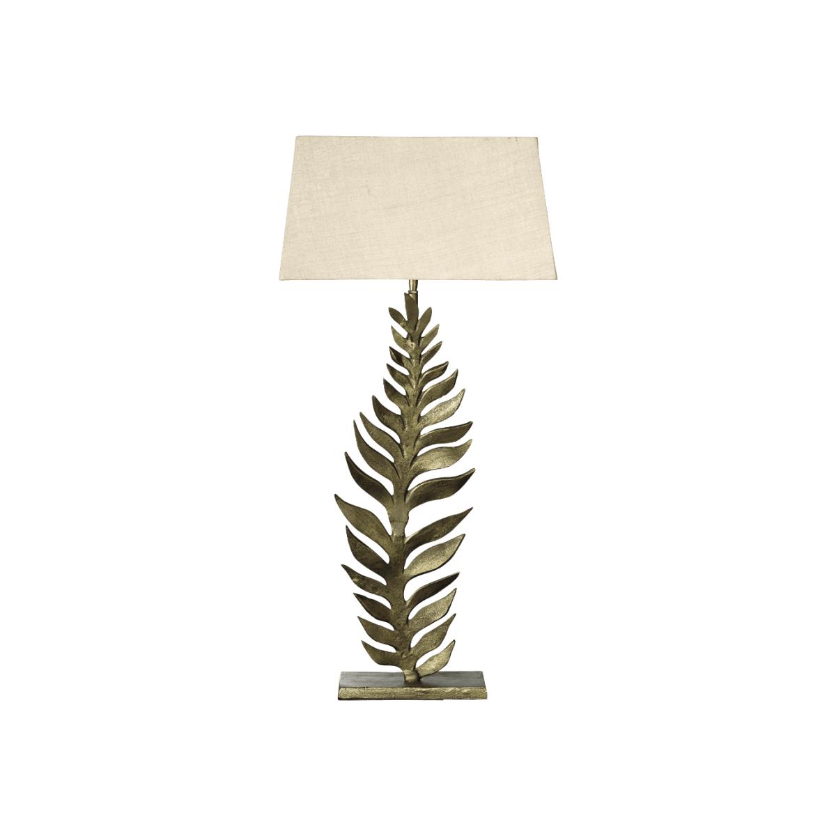 An unique and unusual lamp with an antique-gold finish, this design takes the form of a pinnate leaf. Sitting on a rectangular base, its narrow profile and elegant appearance make it an excellent choice for a dressing room or bedside table. We recommend using a rectangular lampshade to complement the shape of the base.