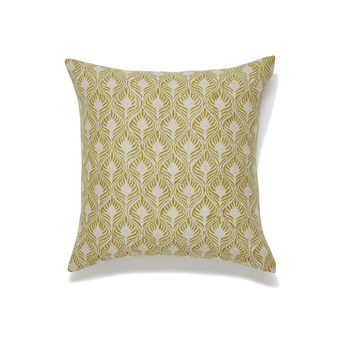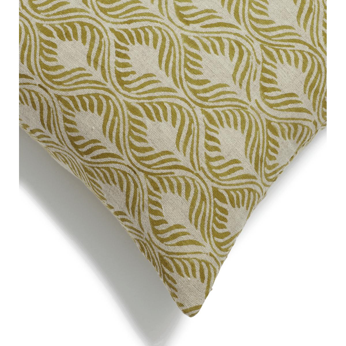 Our Ghini Cushion Covers draw inspiration from the tropical plants, flowers and birds found in a botanical garden. Choose between the artisanal hand block-printed patterns of flowers and fronds (available in two different sizes) or opt for leaves and feathers (available in our larger size only). The original patterns are printed in vivid blues and reds, but the natural-coloured linen cools the designs down, along with the painterly technique in which they are applied – this version is a pleasing limey green. Due to the nature of the fabric and the artisanal processes that shape these cushion covers, there may be some colour and pattern variation between each piece – it’s all part of their charm.