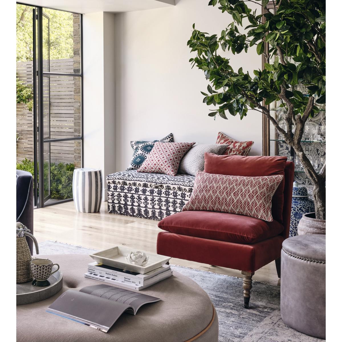 The OKA Gini Fronds Cushion Cover in red is a versatile piece that adds a pop of colour and texture to both traditional and contemporary interiors. I love how its bold, leafy pattern can bring warmth and visual interest to a neutral sofa or armchair. Perfect for layering, it works well with other patterned cushions or plain upholsteries, creating a curated and inviting look. Practical styling tips would be to combine it with muted accessories to let the vibrant hue stand out, or pair it with natural fibres and rattan for a relaxed yet polished vibe. Its colour and pattern make it an easy update that can refresh the look of any living space without needing a full redesign.