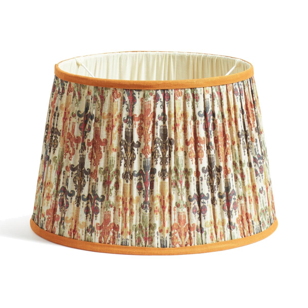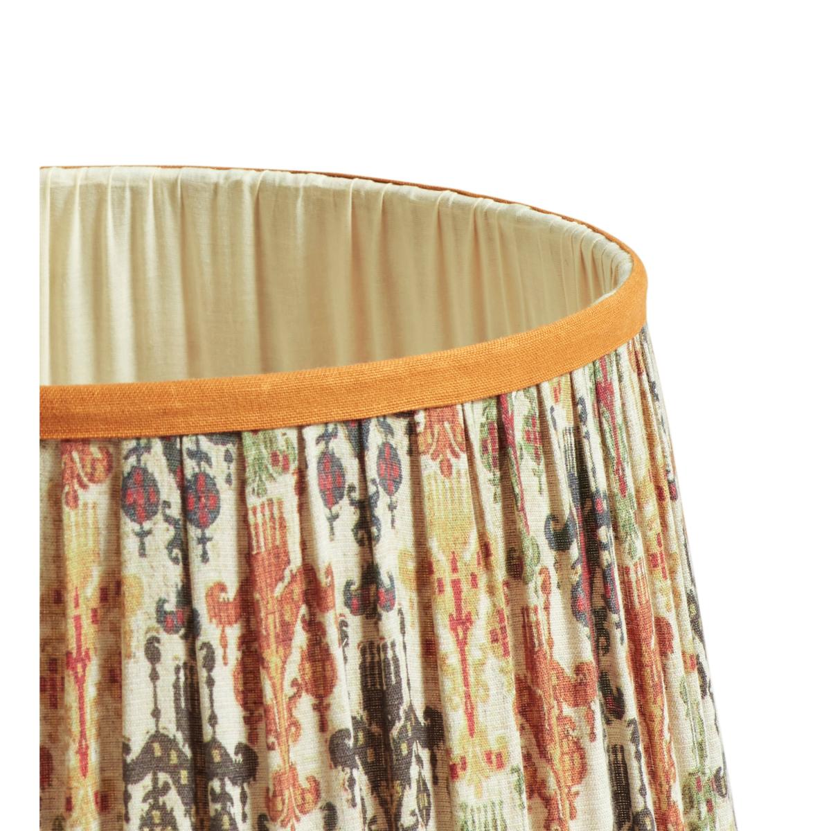 Our Girandole design originally decorated our cushion covers; this season, we thought we'd extend the range to pretty pleated lampshades. The elegant pattern is reconfigured to a smaller scale and digitally printed onto natural linen before being lined with cotton. The neutral backdrop allows the colourful pattern to sing, complemented by the yellow piping that lines its edges. This is the smaller of the two sizes.