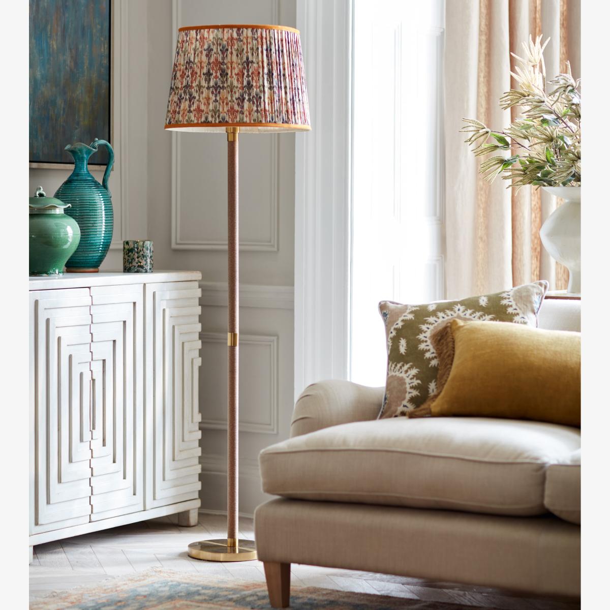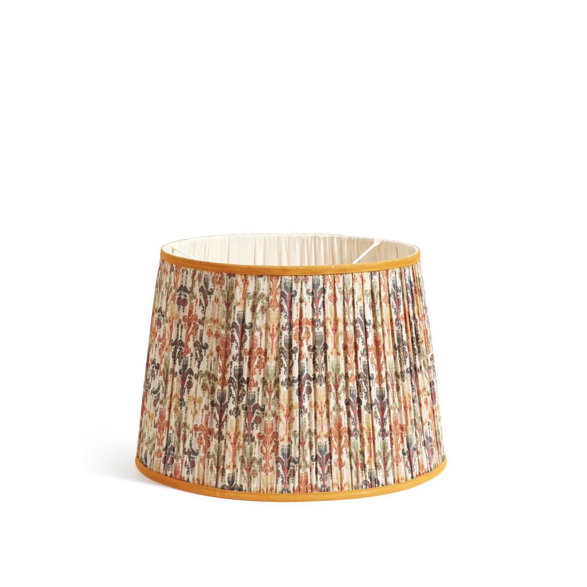 Our Girandole design originally decorated our cushion covers; this season, we thought we'd extend the range to pretty pleated lampshades. The elegant pattern is reconfigured to a smaller scale and digitally printed onto natural linen before being lined with cotton. The neutral backdrop allows the colourful pattern to sing, complemented by the yellow piping that lines its edges. This is the larger of the two sizes.