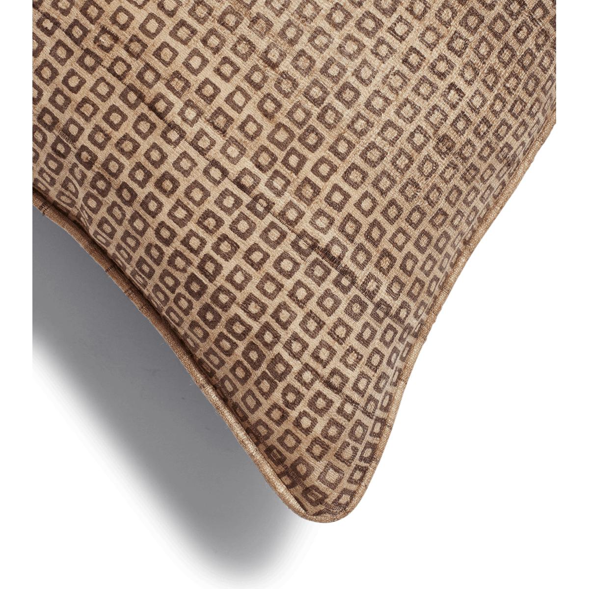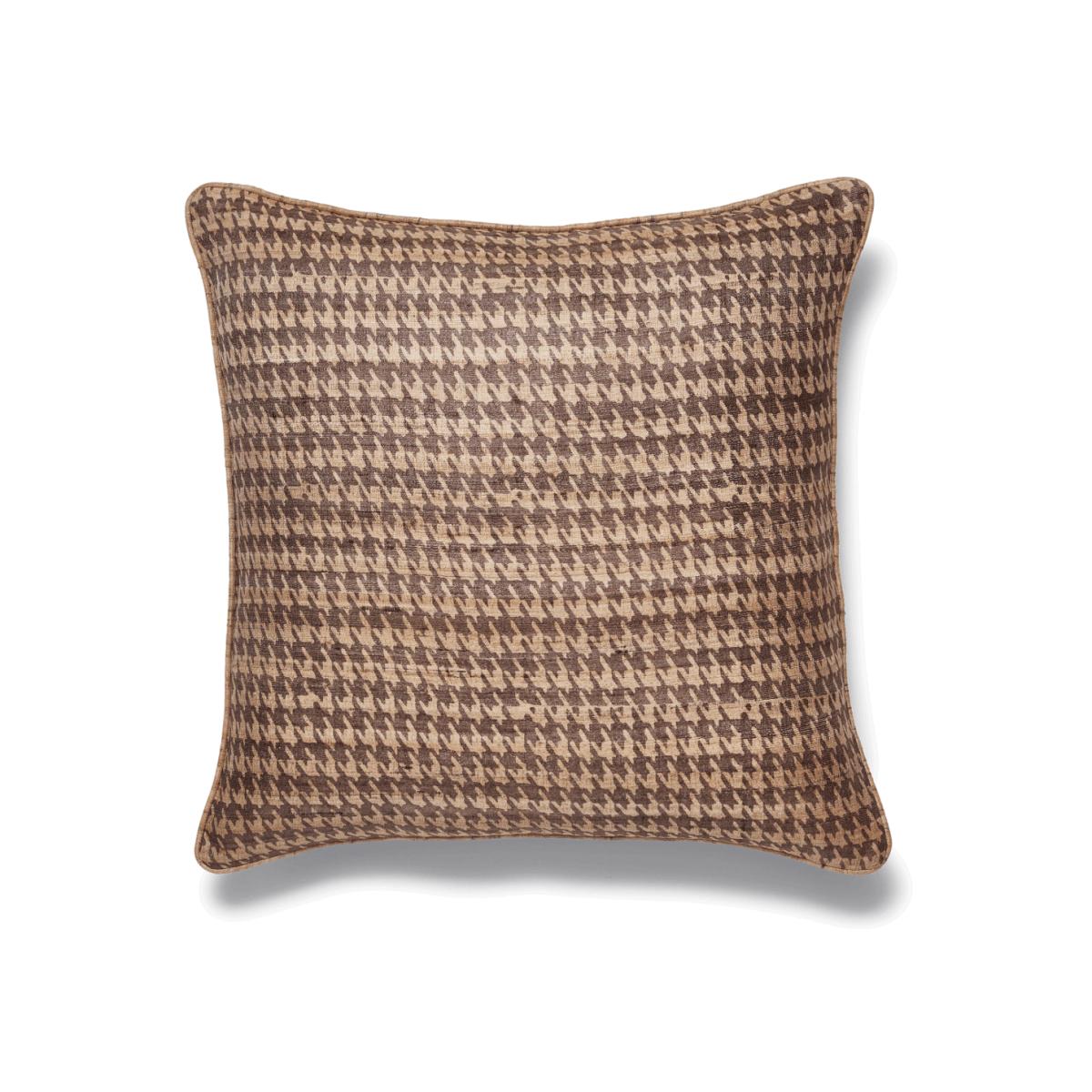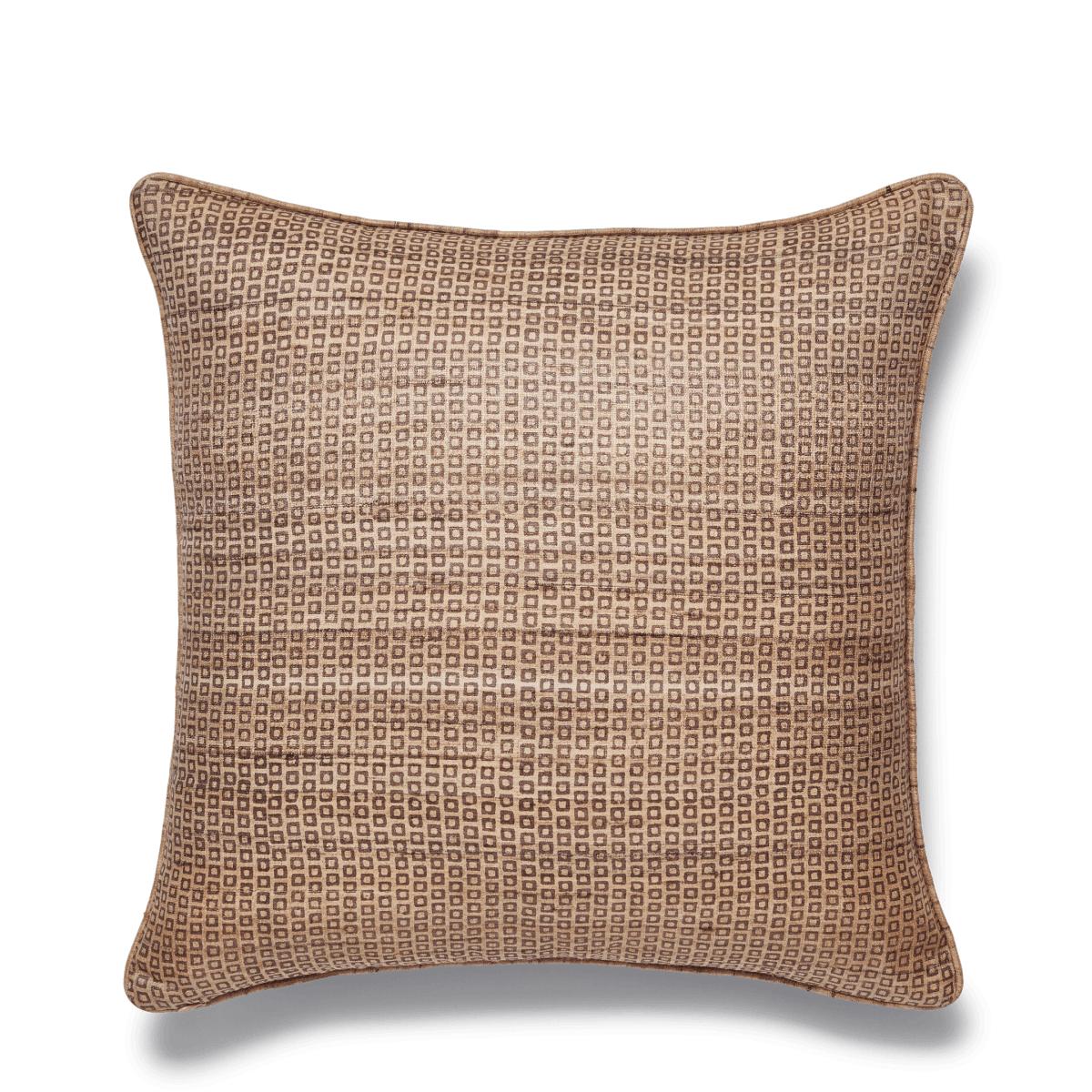 This bold range focuses on craftsmanship and pattern. The handwoven fabric is made from natural tussar silk, cultivated in the Indian states that have been producing the yarn for centuries. The yarn is then hand spun, hand dyed, and hand block printed with a houndstooth pattern on one side, and a small square pattern on the reverse. This iteration, in the Grey print, can blend seamlessly into a variety of cushion collections, thanks to its neutral backdrop.