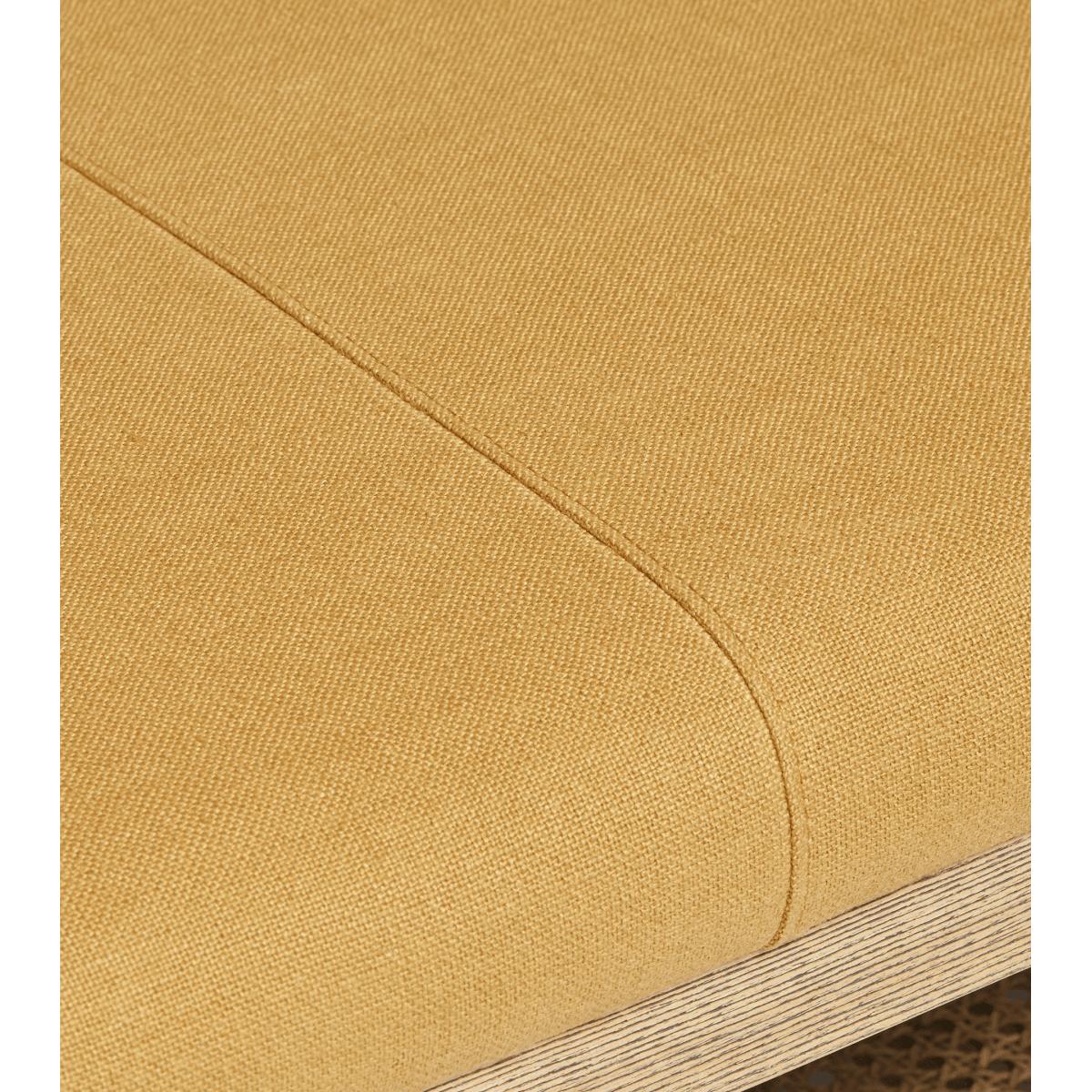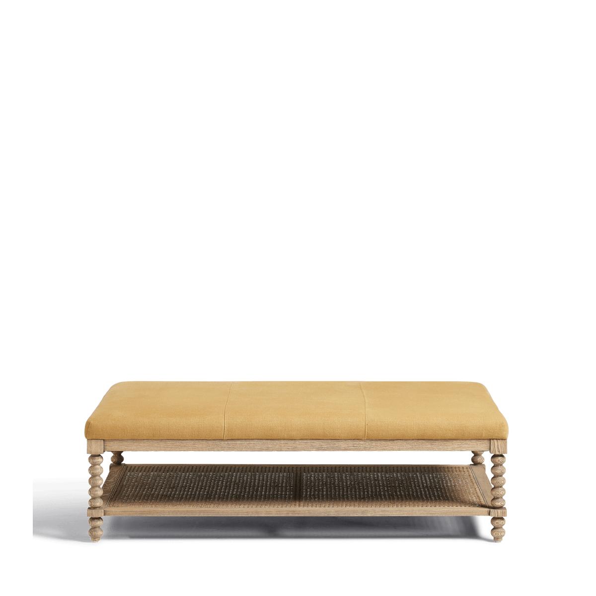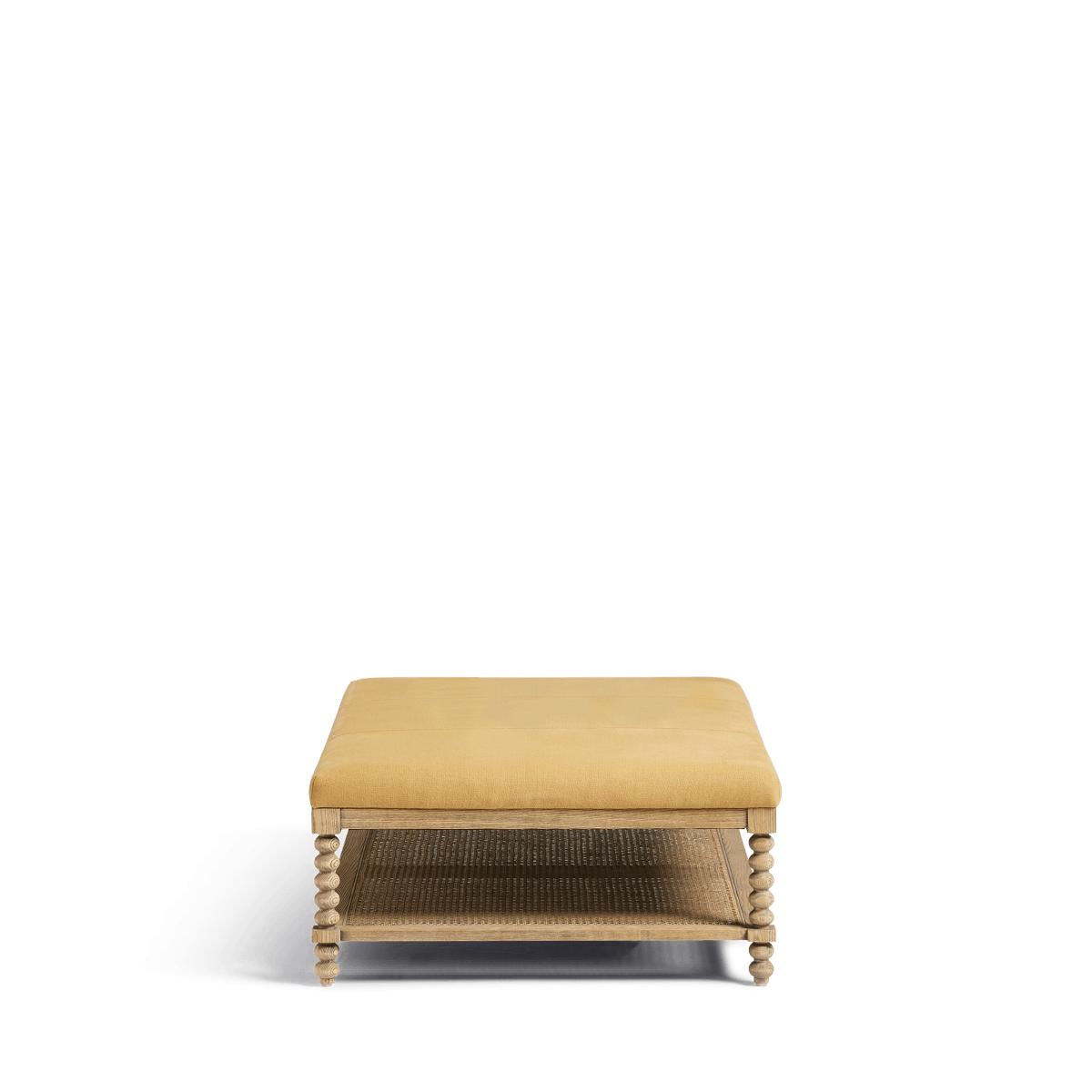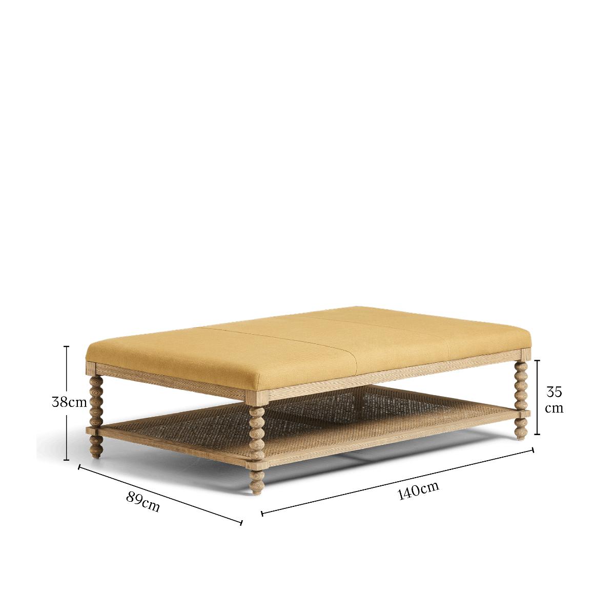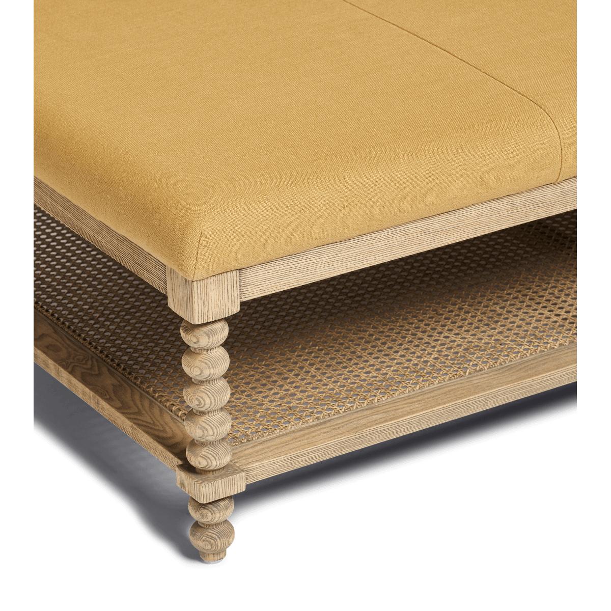 The spherical turned legs of the Gwendolen are inspired by the popular bobbin furniture movement – otherwise known as spool furniture – of the late 17th century. This style had legs that were generally lathe-turned into ornamental shapes in order to make a feature of them. The padded top of the Gwendolen is upholstered in muted Dijon yellow linen, which enables it to be used as an extra seat as well as a surface. The bottom shelf features woven cane for added interest.