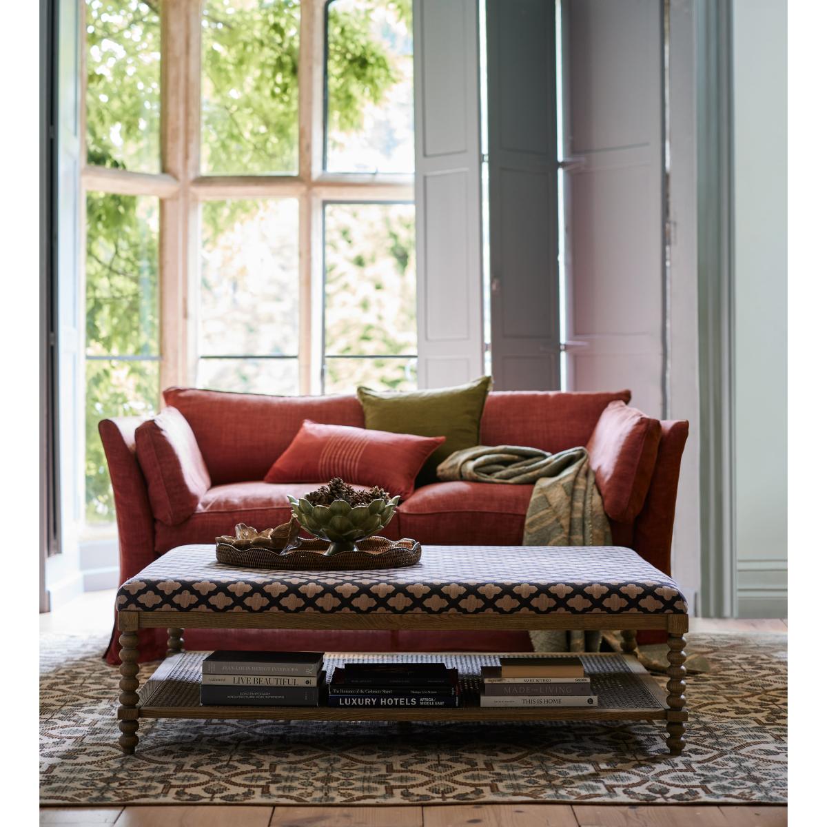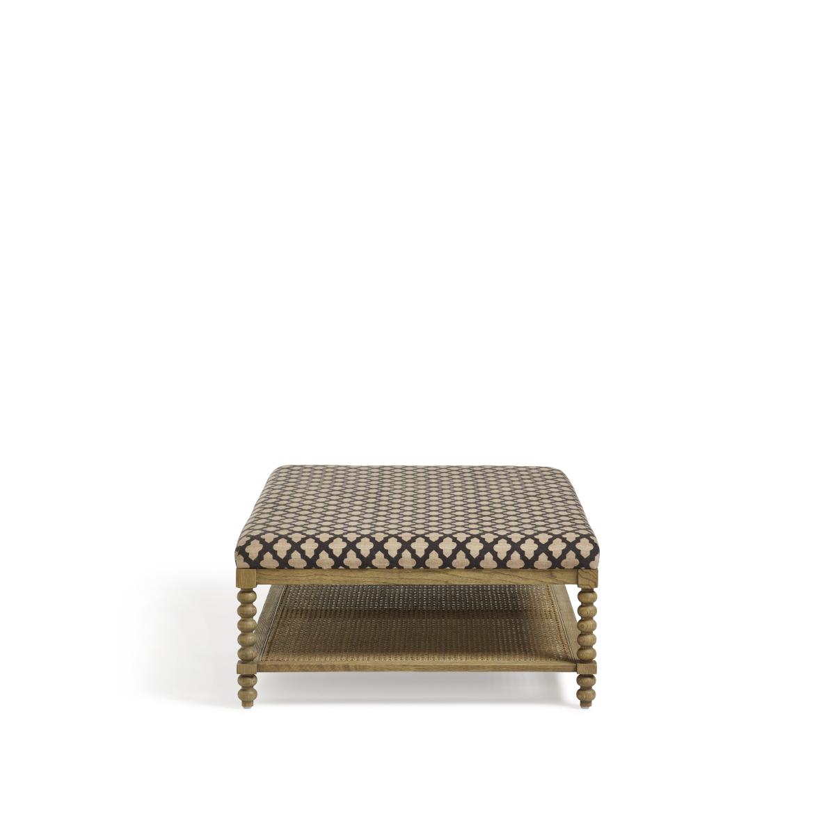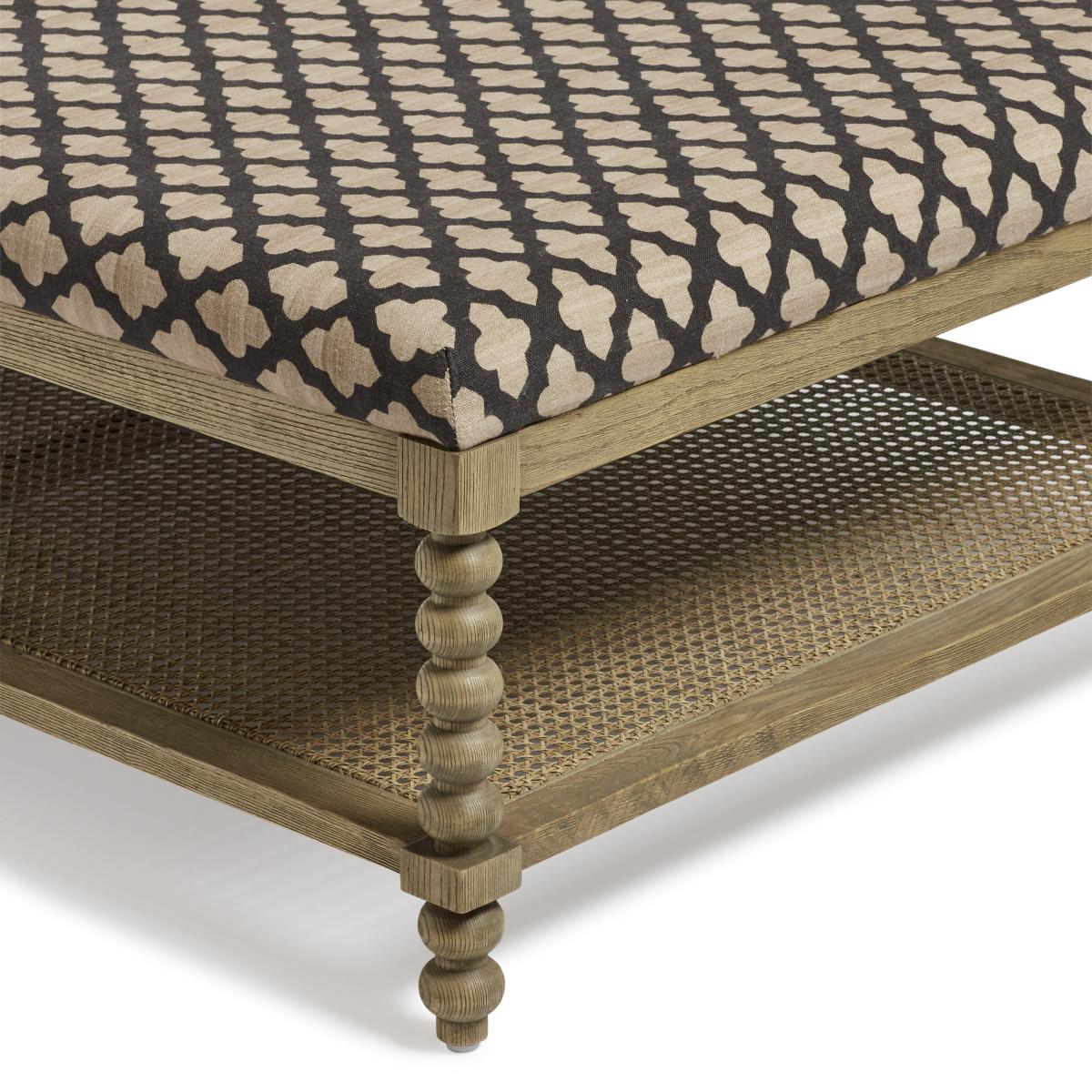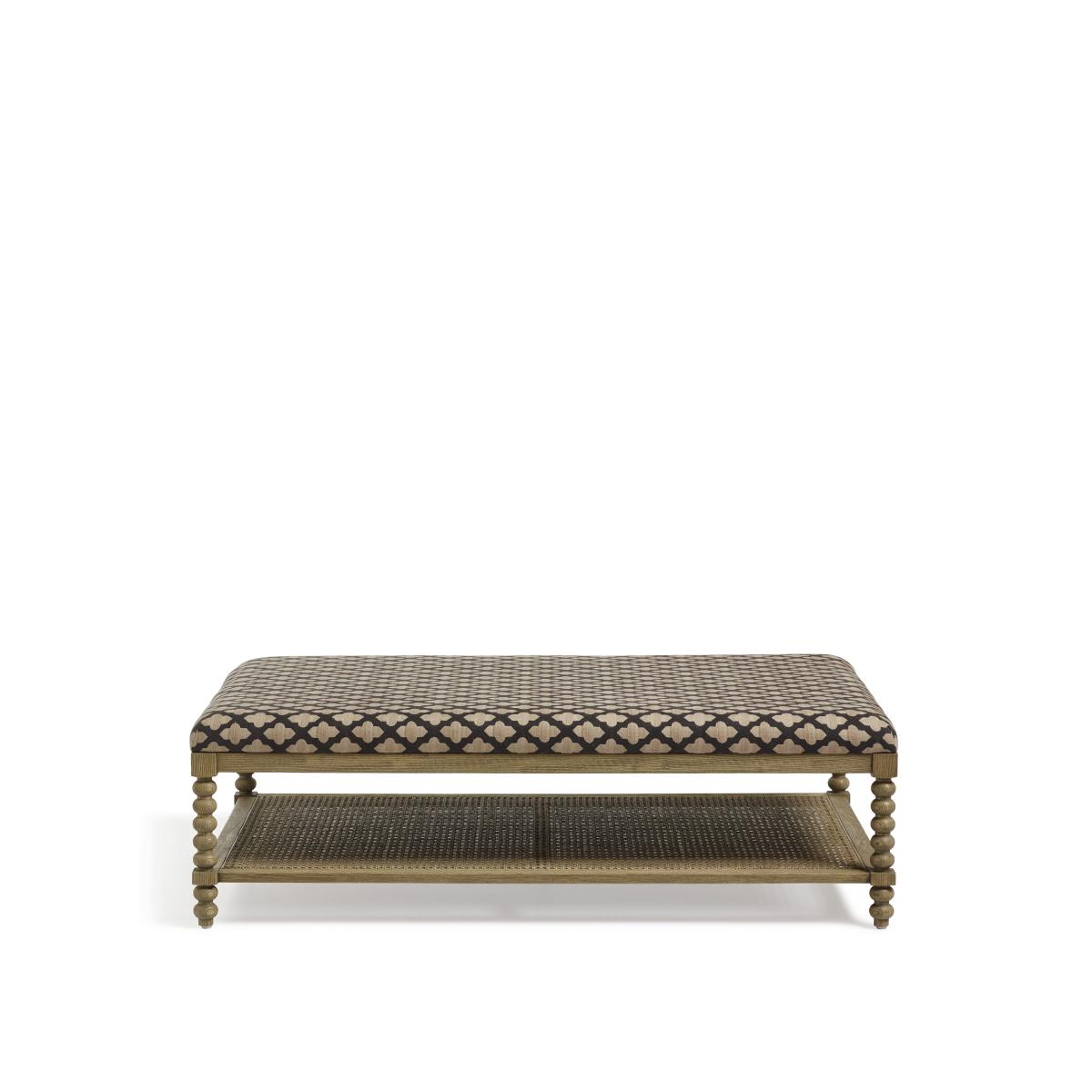 The spherical turned legs of the Gwendolen are inspired by the popular bobbin furniture movement - otherwise known as spool furniture - of the late 17th century. This style had legs that were generally lathe-turned into ornamental shapes in order to make a feature of them. The padded top of the Gwendolen is upholstered in linen featuring our black and white Serigraph print, which enables it to be used as an extra seat as well as a surface. The bottom shelf features woven cane for added interest.