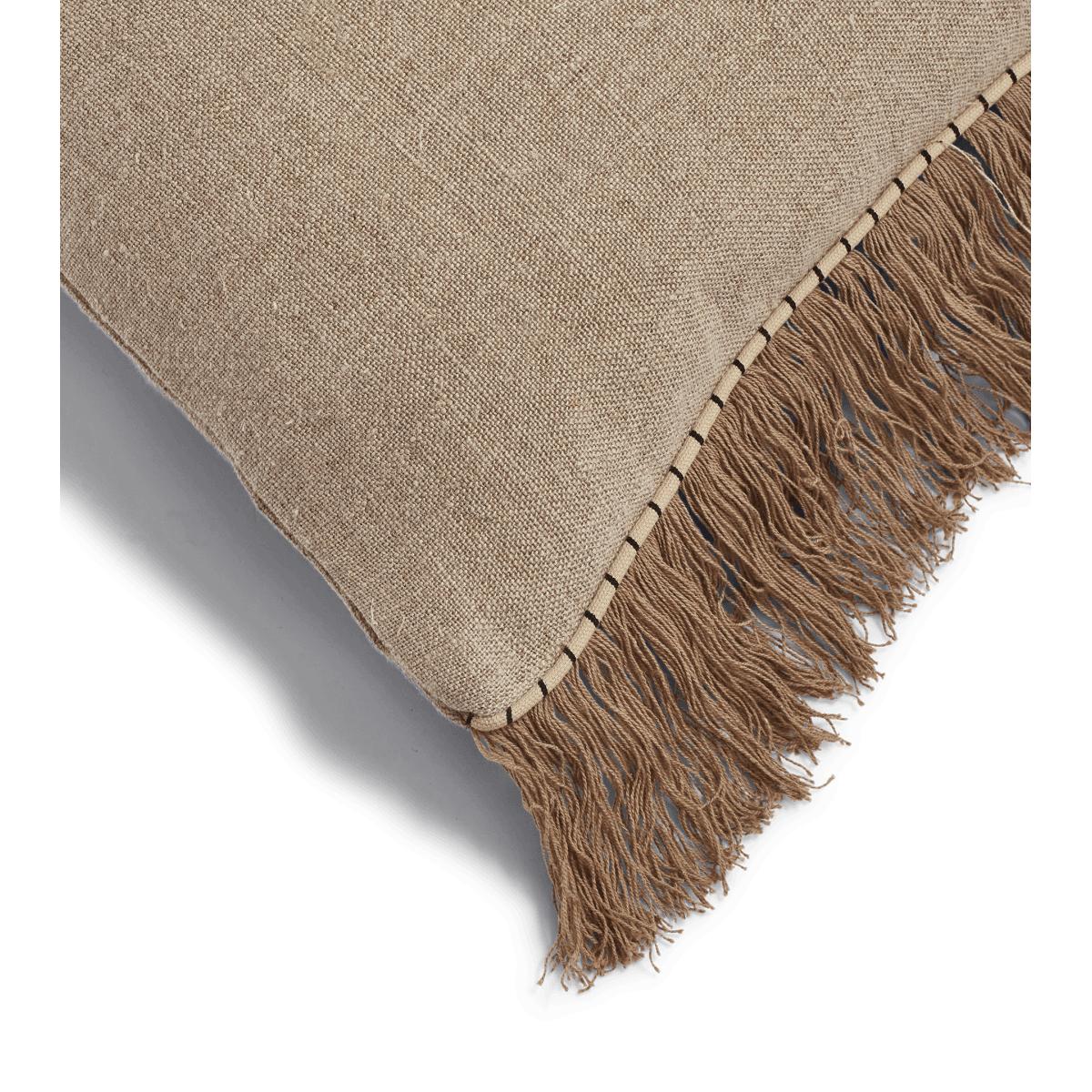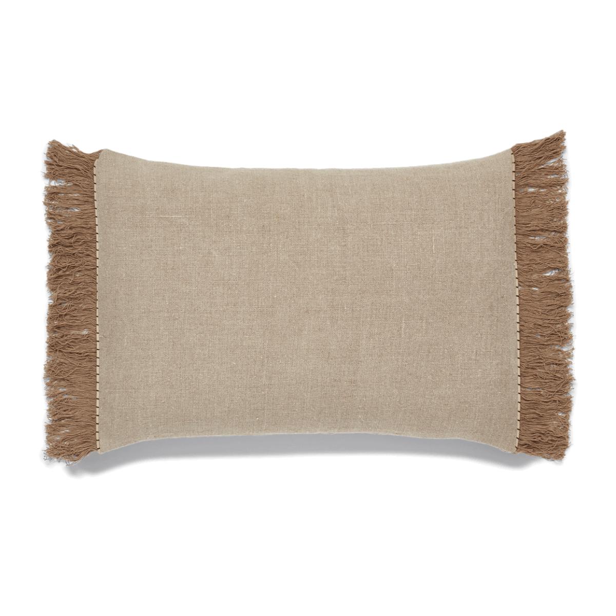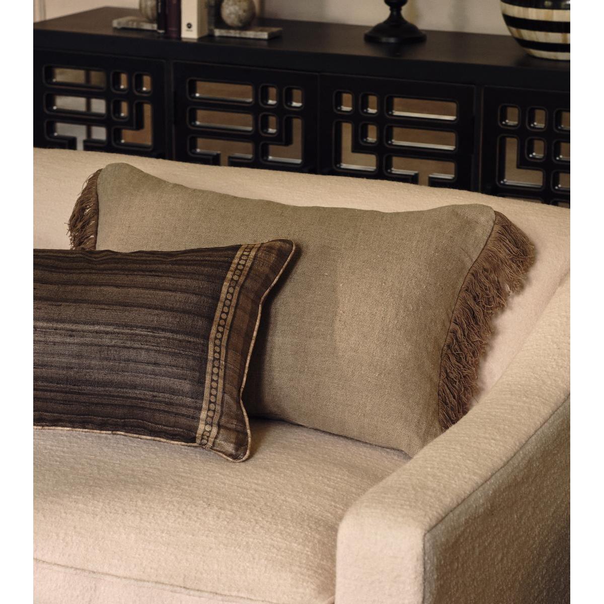Our Halara Cushion invites you to lie back and take it easy. Their rectangular shape makes them all the more perfect for lounging. This version is crafted from natural-coloured linen with matching fringing and black and natural striped piping. They are designed to fit our 68x45cm Rectangular Duck Feather-Filled Cushion Pad.