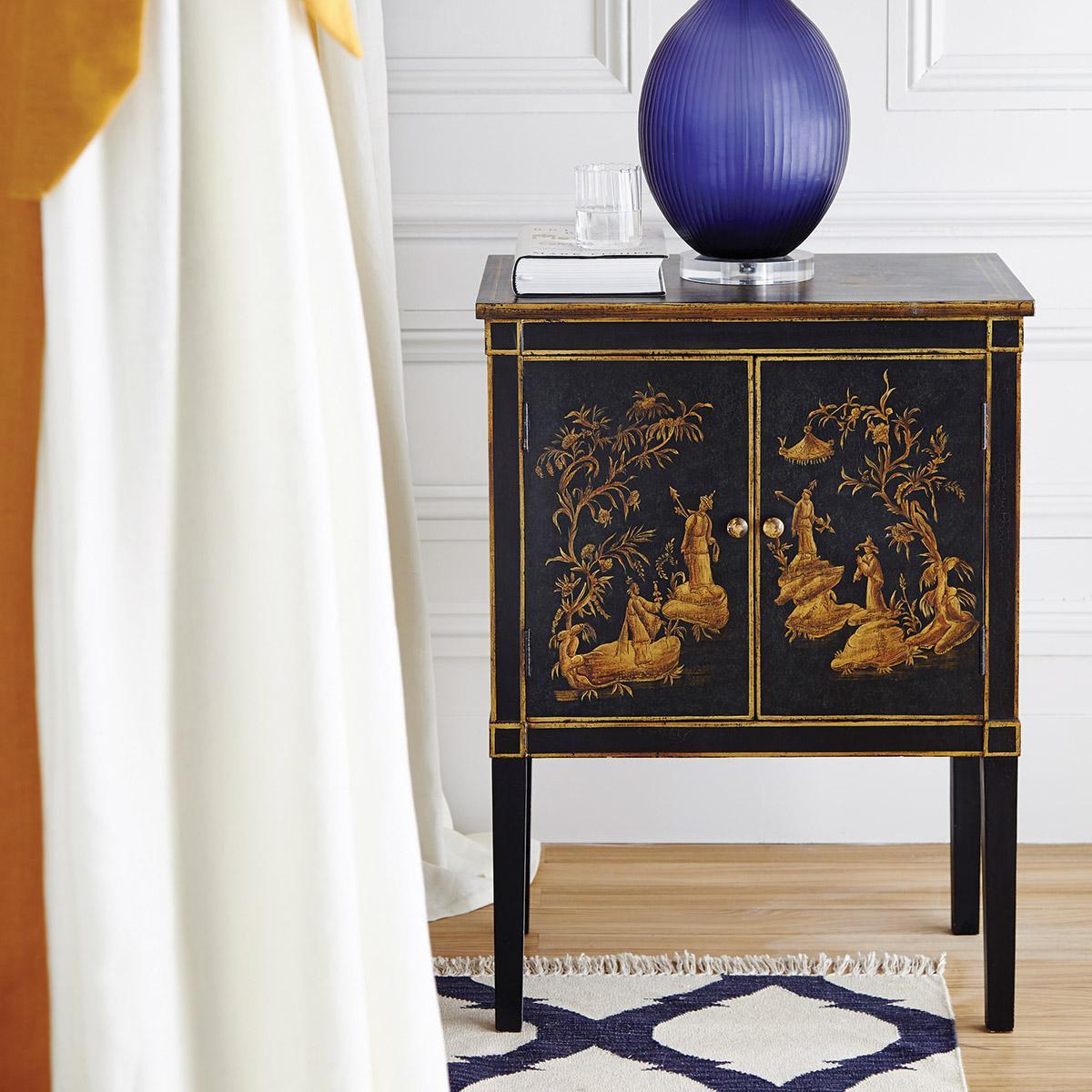 I love this chest of drawers for its striking black finish paired with intricate gold detailing, which gives it an elegant yet contemporary feel. It works well in both classic and modern interiors, especially those with Asian-inspired or eclectic accents. When styling, consider displaying minimal decorative items on top to let the design speak for itself, or pair it with soft textures like linen or velvet to create a sophisticated balance. Practical tips include using it for storage in living rooms or bedrooms, where its bold aesthetic can serve as a focal point, while its compact size ensures it stays versatile without overwhelming the space.