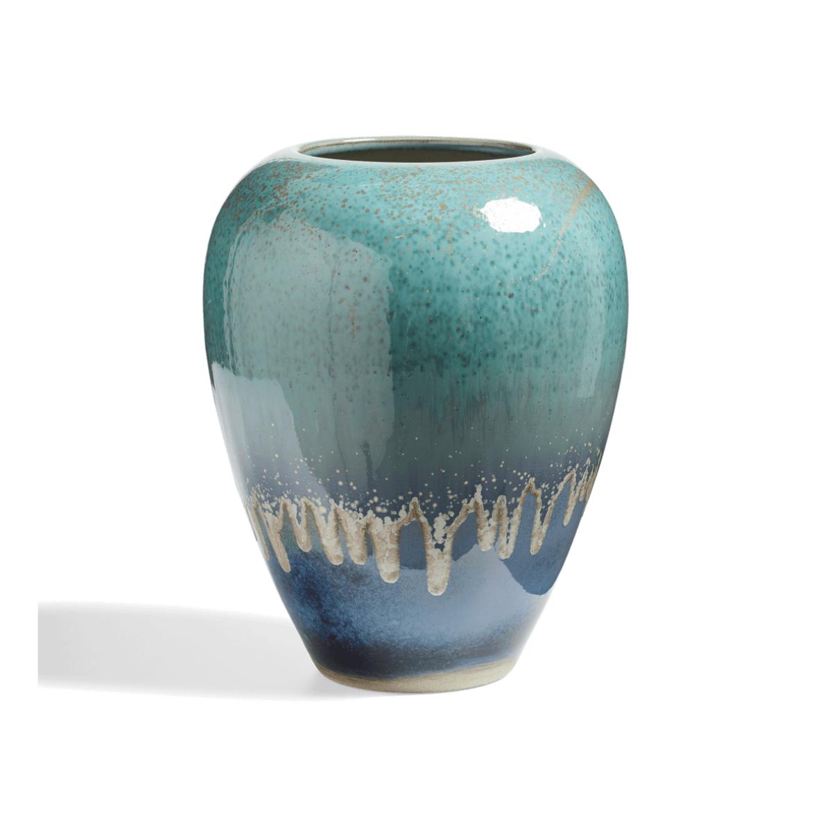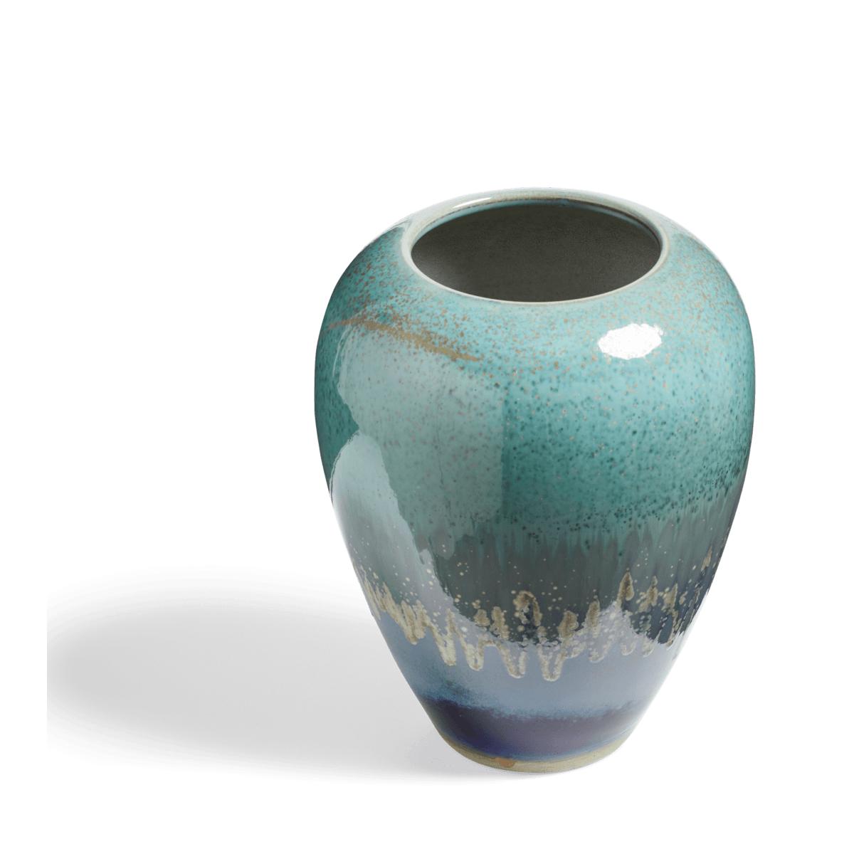 The Hervey Decorative Vase is shaped in a mould to achieve its pleasing curving form. The Aruba Blue reactive glaze features a gradient from lighter at the top, dripping into a deeper blue at the bottom. When the vase is fired in the kiln, the blues will undergo changes that bring rich tonal variation. Due to this artisanal process each piece will have individual characteristics that add to their charm.