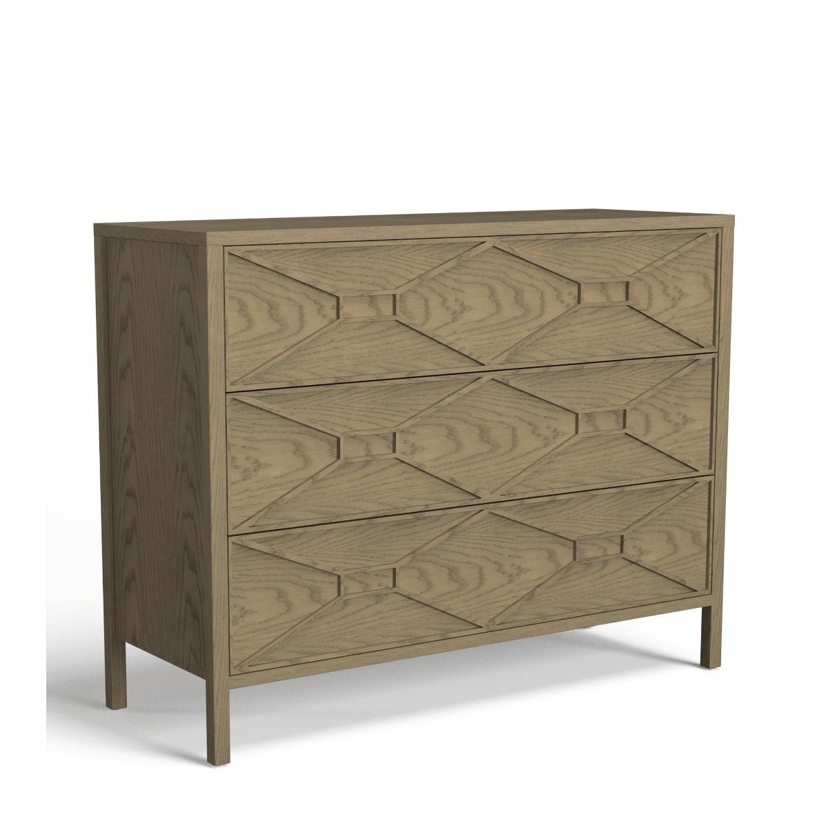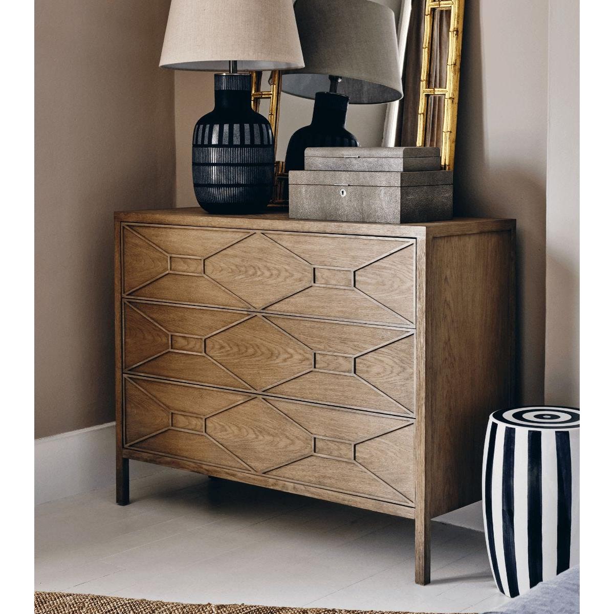 Explore the various sides – and grains – of wood with the Hester Chest of Drawers, whose façade is adorned with geometric facets, each highlighting the material's unique knots and texture. Due to the differences in the grain featured on the solid oak and natural-wood veneer, each piece is a one-of-a-kind addition to a scheme.