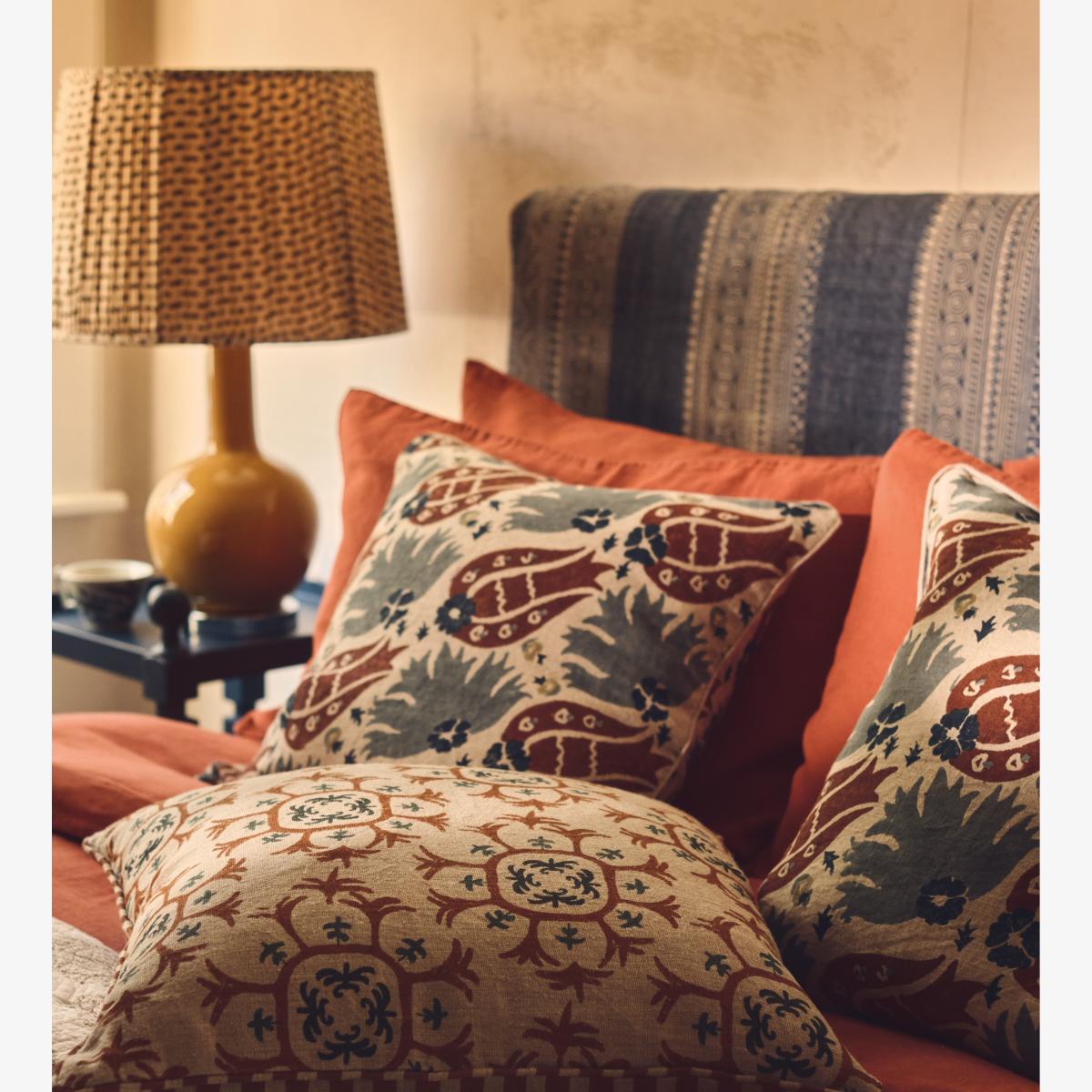 The large, leafy motifs on our Hidaya Cushion Covers are inspired by ancient Turkish suzani textiles, which take their name from the Persian word for 'needle'. We have given the design an OKA touch by block-printing the pattern by hand onto a natural linen ground. While the fine texture of the material takes the orange and blue dyes readily, we wash the fabrics to calm the vivid colour and achieve a softer look. Each piece is completed with a piped edge. Due to the nature of the fabric and the artisanal processes used to craft these cushion covers, there may be some colour and pattern variation between each piece.