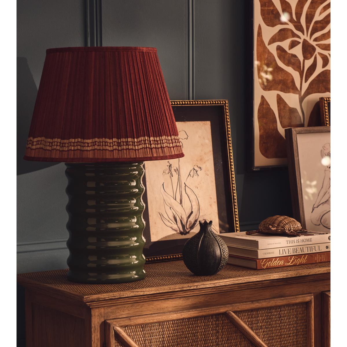 I love the Houseka table lamp for its bold yet earthy appeal, making it a versatile addition to a range of interiors. Its deep spruce tone works particularly well in nature-inspired schemes or spaces where you want to introduce a touch of colour without overpowering the rest of the room. It’s perfect on side tables or as a bedside lamp, adding both function and style. For a polished look, pair it with neutral or textured fabrics to highlight the lamp’s intricate textures and rich colour. To keep the look cohesive, style with other woodland or organic elements, and consider adding warm-toned bulbs to enhance its cosy, inviting glow.