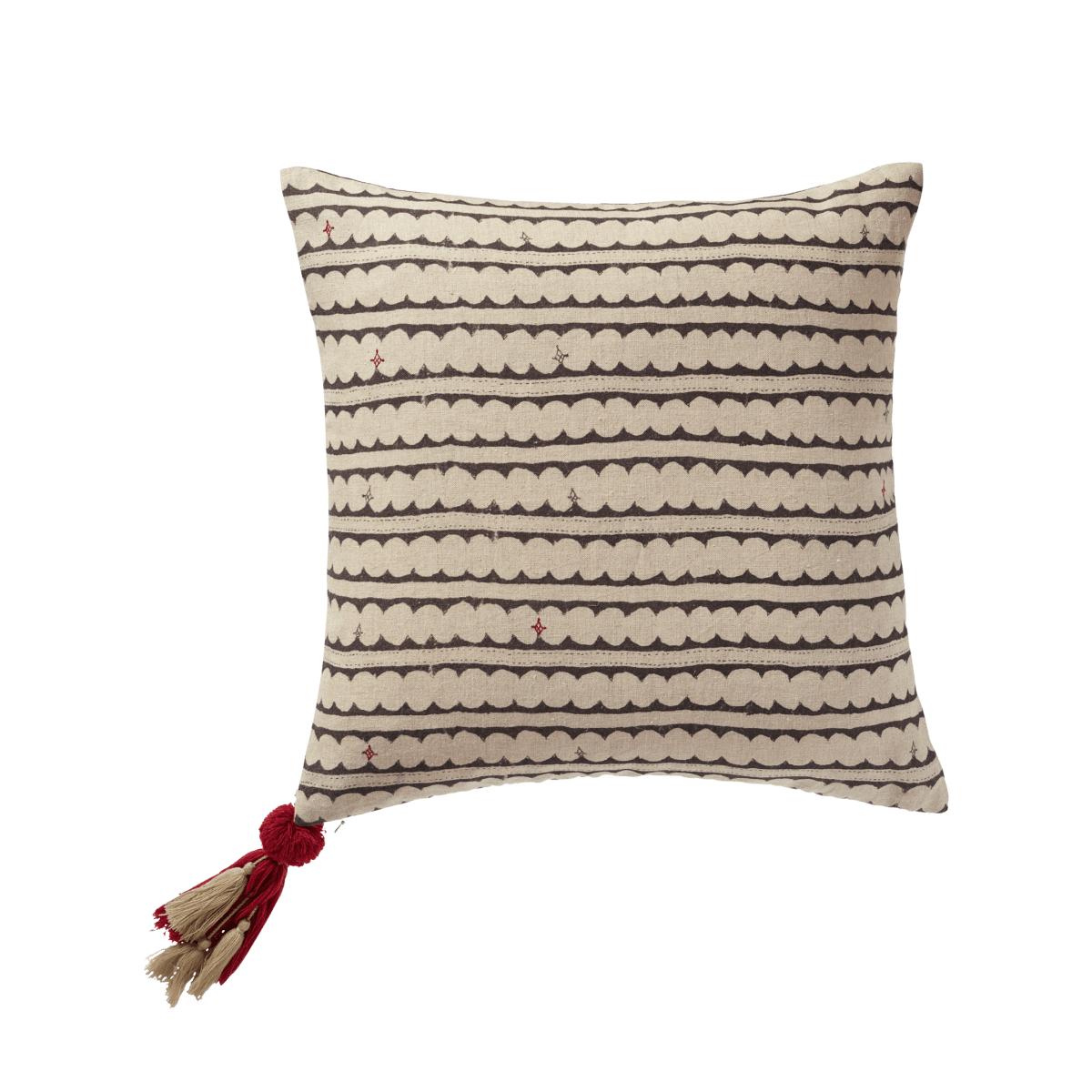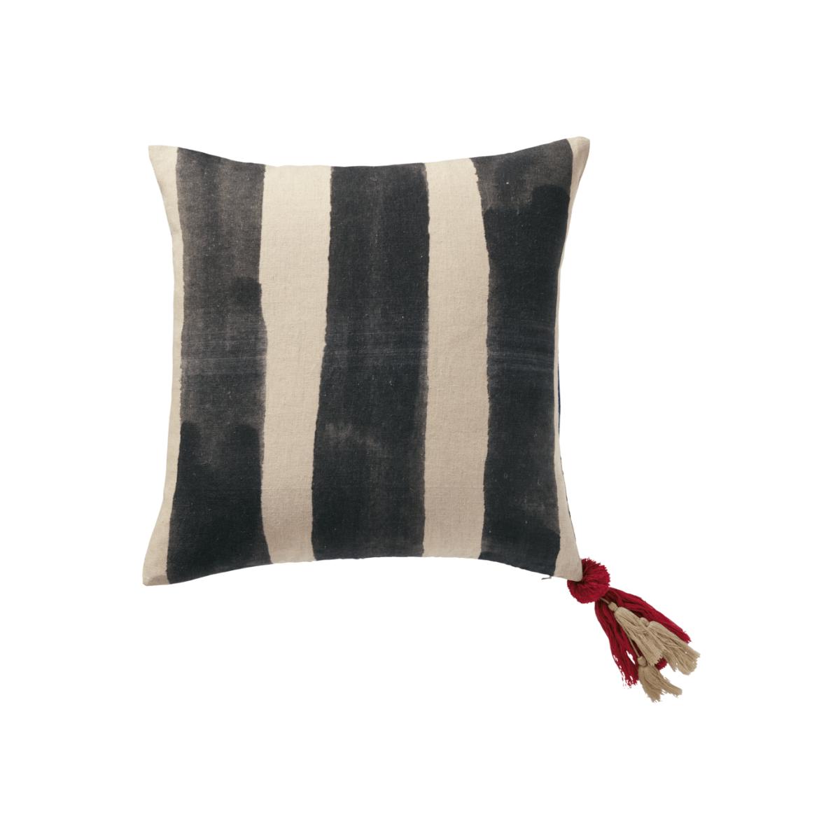 Handmade from linen, our Huaca Cushion Cover is reversible; its two designs in one make it the perfect choice if you like to switch up your sofa. One side has a wide charcoal stripe, the other has a circular striped pattern and sparse red cross-shaped embroidery. A chunky tassel adorns one corner, neatly tying these two complementary prints together.