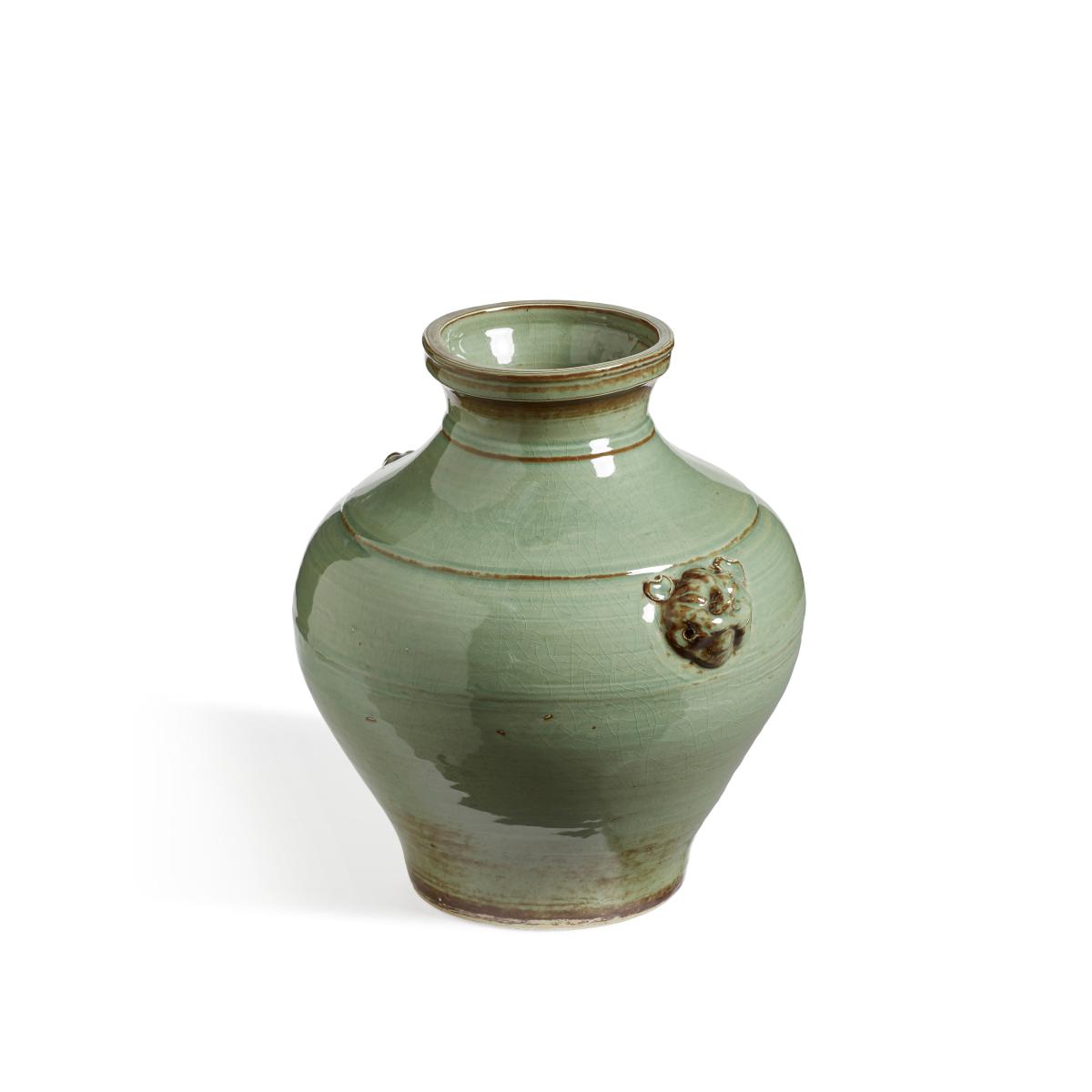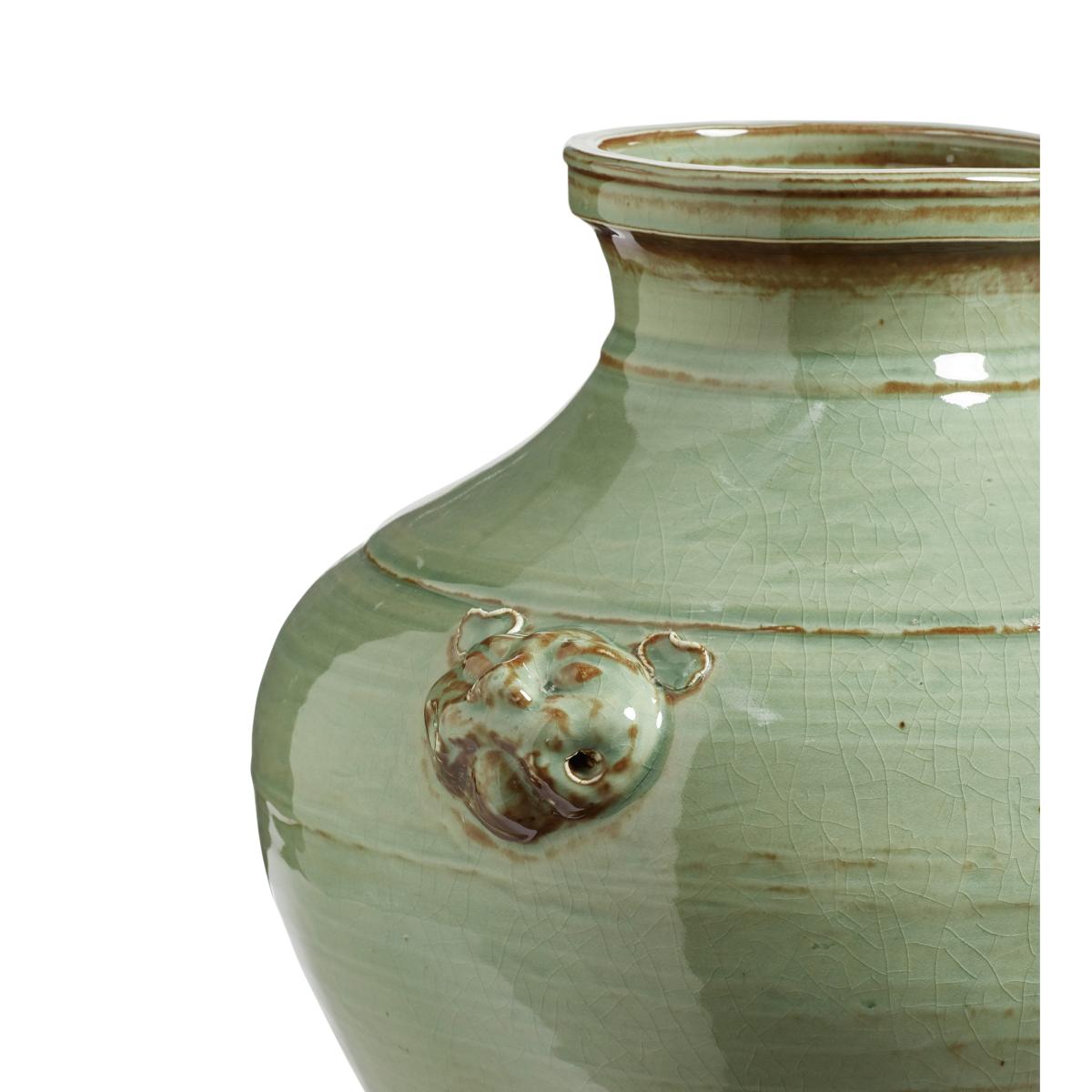 This large porcelain pot is designed in the style of traditional Chinese pottery with abstract decorative dragonhead handles. It's crafted by a small group of talented artisans who have honed their craft over many generationsin Jingdezhen, China, a city known for its rich history in traditional porcelain design. The Olive green glaze has an antique-effect finish that adds to its charm.
