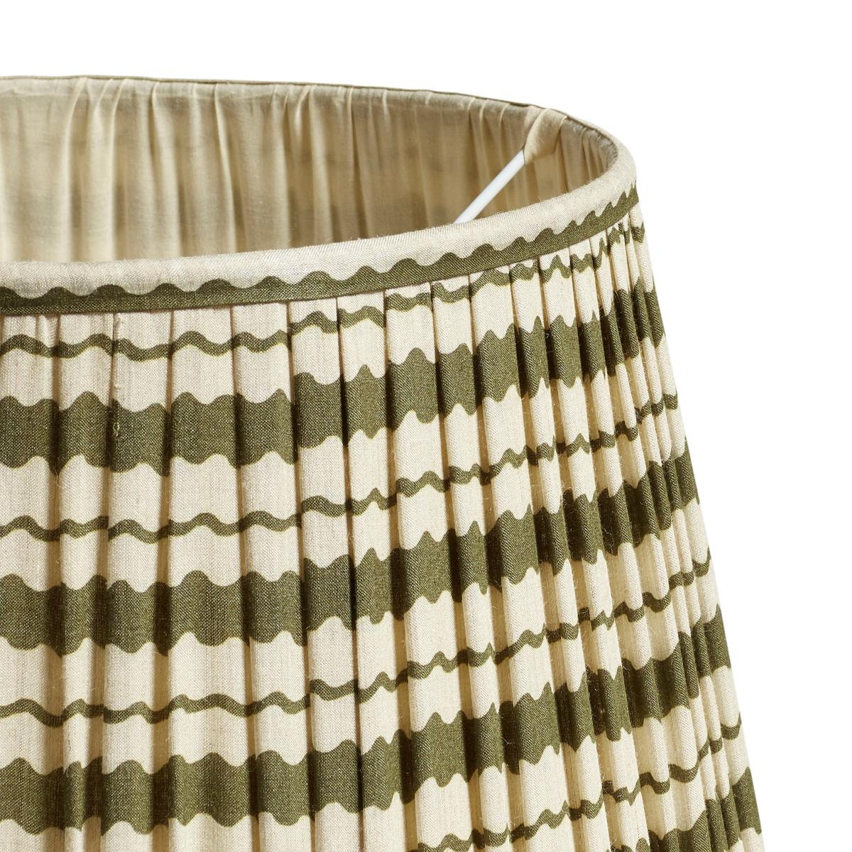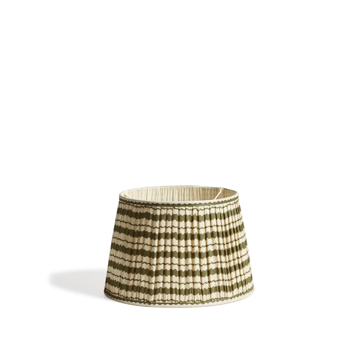 The undulating wavey stripe of our Hurley is printed in green across the ground of the silk lampshade. Lined with cream cotton, the shade will give a warm glow when lit. This is the smaller of two sizes.