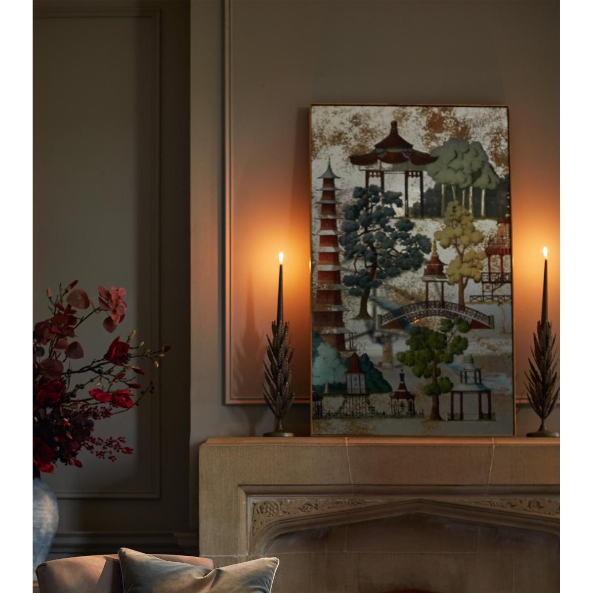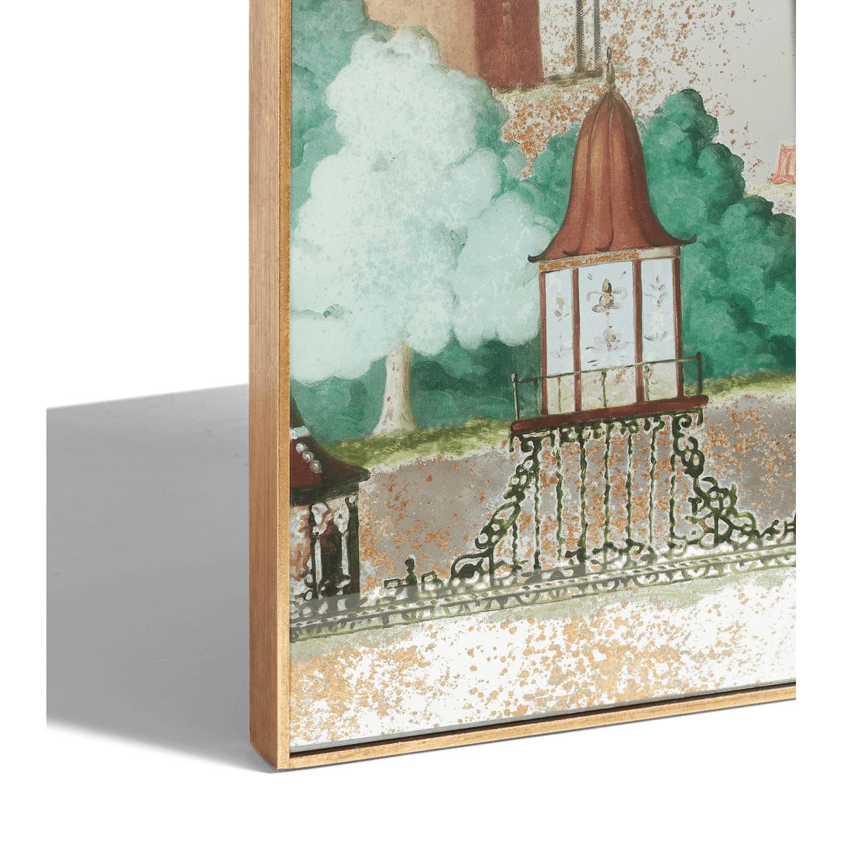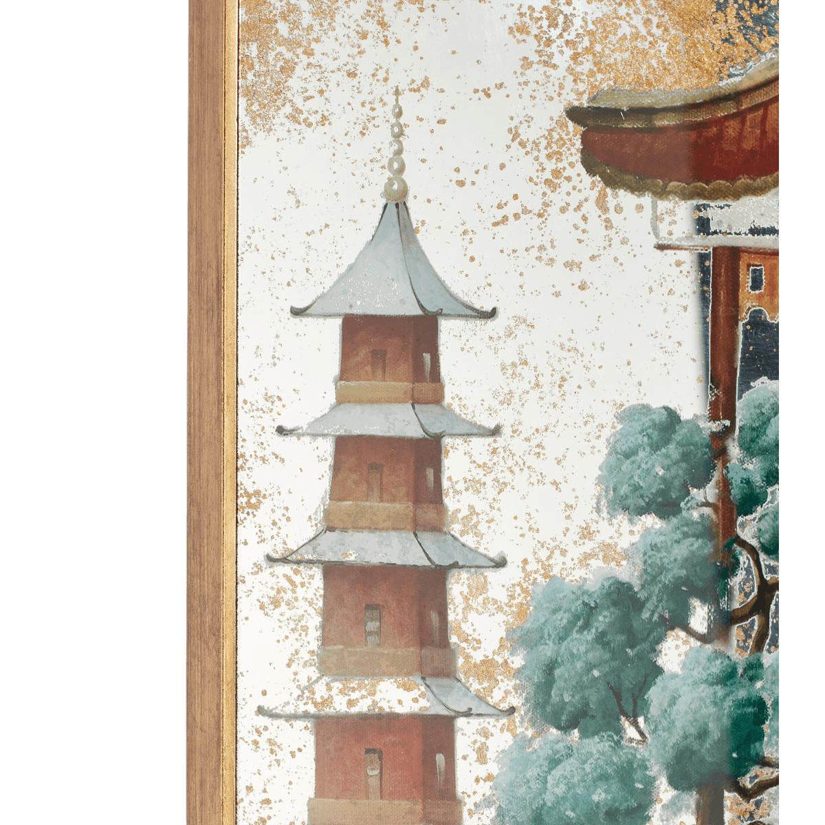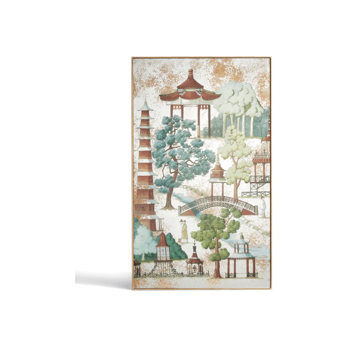 Joining our striking mirrored wall art collection is the Inaka, with a design centred around a Japanese pagoda in the tree-lined countryside. It is inspired by antique wallpaper; our team painted the scene onto vellum-style paper, then  translated it onto a sheet of glass. The piece uses gold leaf and oil paints to create an antique-style finish.