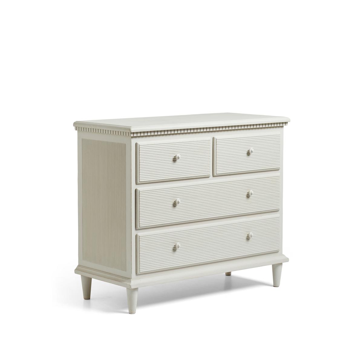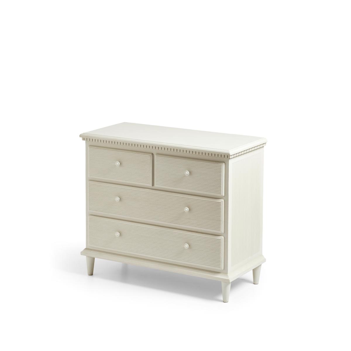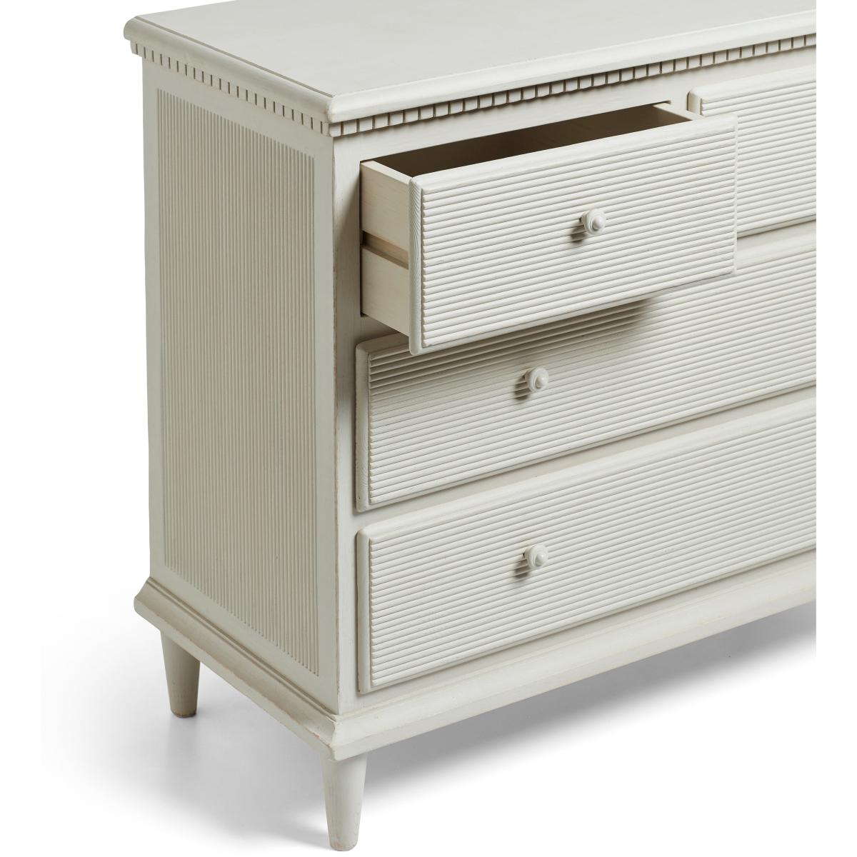 Crafted from a solid pine wood with a softly chalked finish the Ingrid Chest of Drawers is characterised by its elegant reeded front. Practical as well as stylish, it features height-adjustable feet for stability.