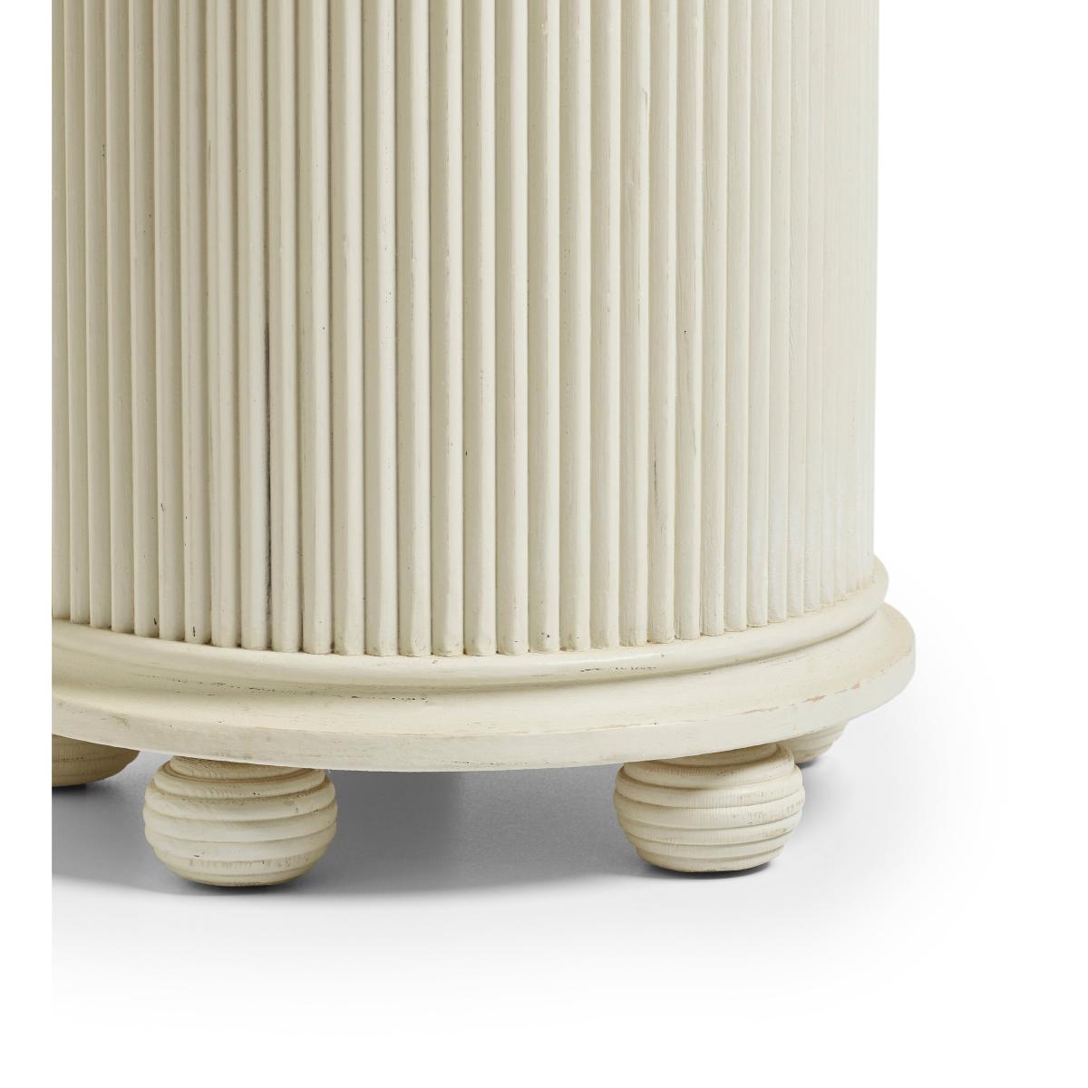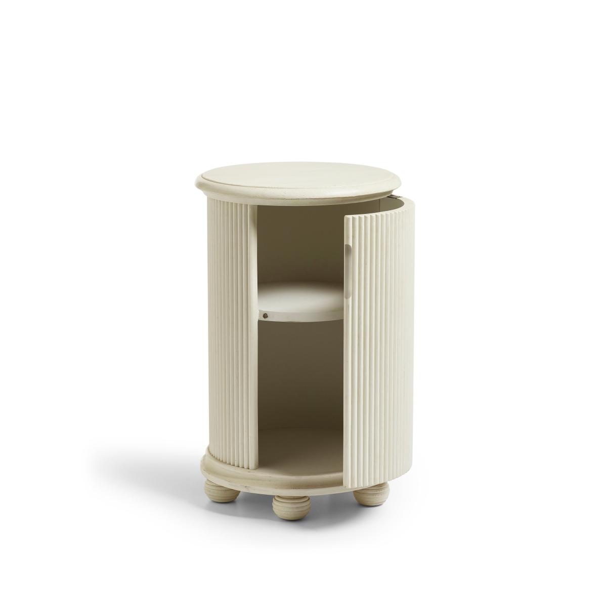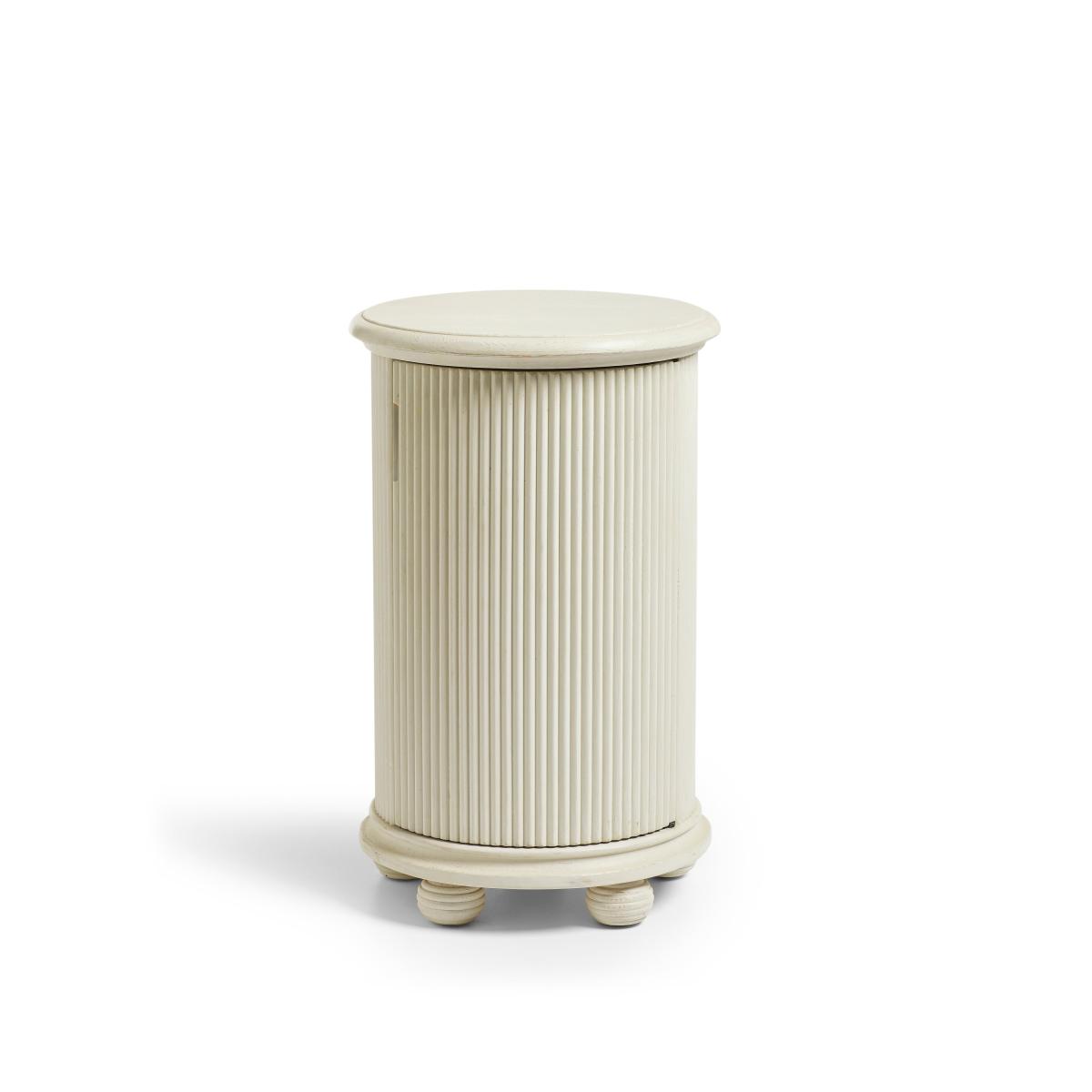 Characterised by its reeded front in a chalk finish, the Ingrid Side Table – complementing the sideboard in the same collection – is made from solid pine wood and features a cabinet with a shelf inside that offers plenty of storage. The height-adjustable feet mean the piece can be stabilised on uneven floors, while the circular design enables it to slot neatly beside sofas or beds.
