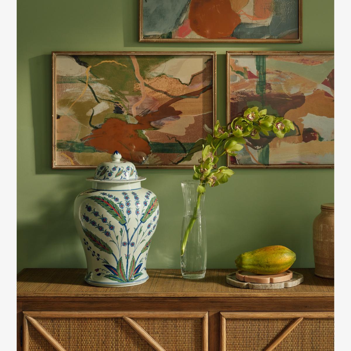I like the OKA Isphahan Lidded Jar because of its rich, decorative appeal, making it a versatile piece in many interiors. It works especially well in boho, eclectic, or global-inspired spaces, but can also add character to more traditional or contemporary settings. I’d suggest using it as a statement piece on a sideboard or console table, or even as a centrepiece filled with dried flowers or seasonal foliage for an added touch. Its multi-coloured design adds vibrancy without overwhelming the space, and the lid makes it practical for storage of small items while maintaining its decorative charm.