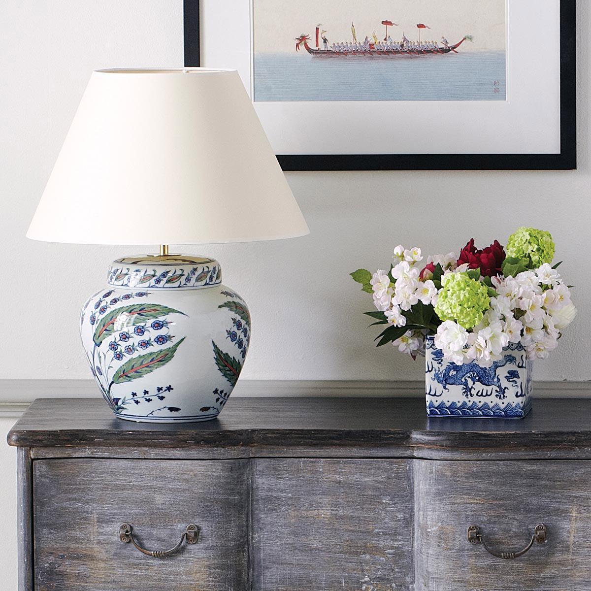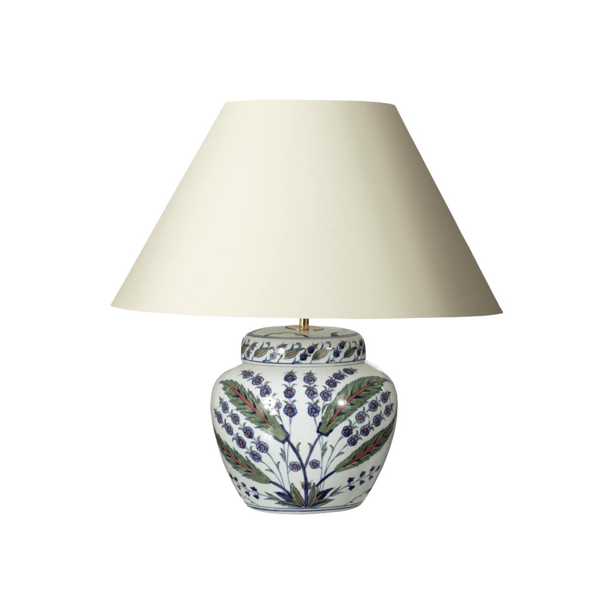 In the shape of a traditional Chinese ginger jar, and hand-painted with pretty Persian designs, our Iznik Urn lamp looks lovely in a bedroom or living room. We recommend a 40-45cm diameter shade for use with this lamp.