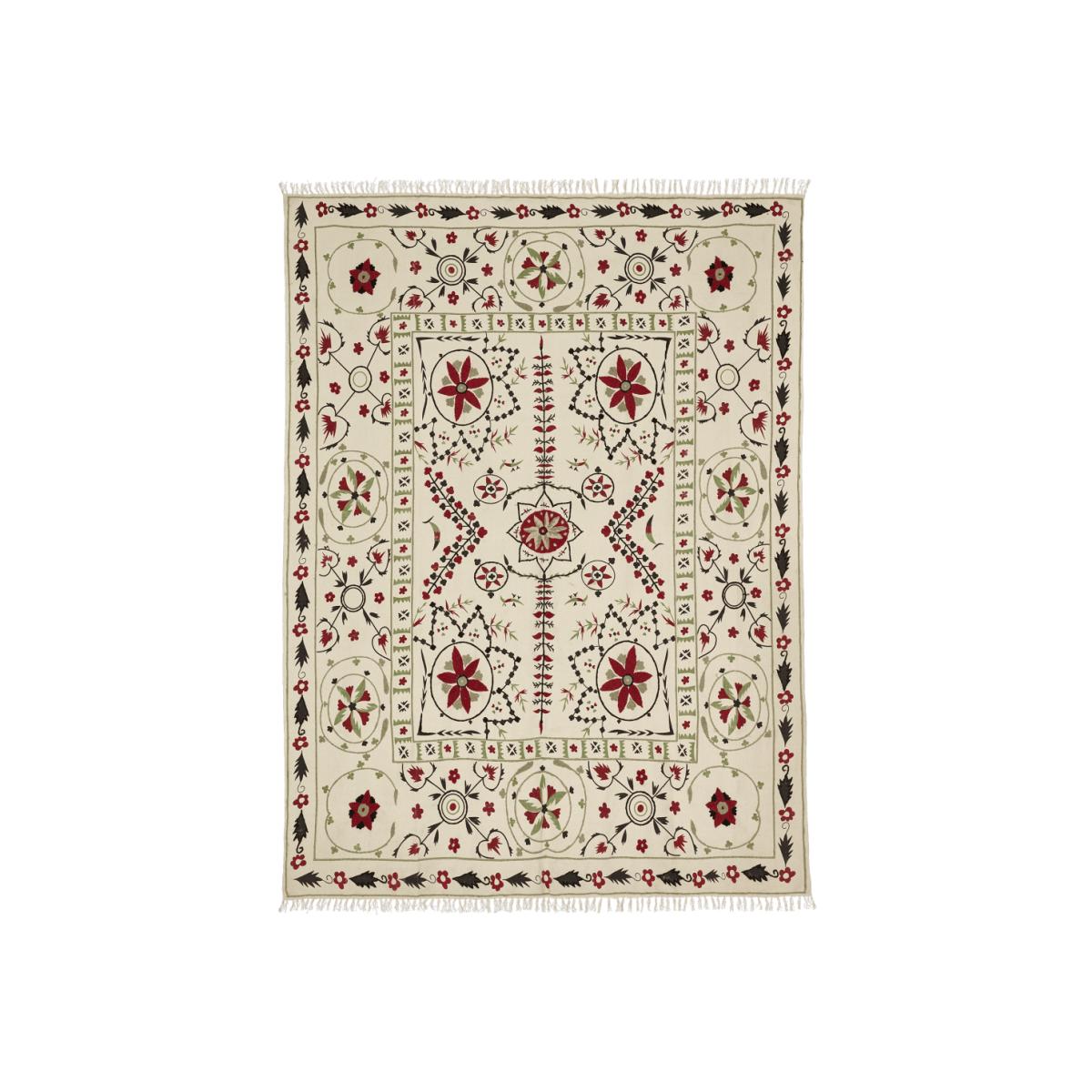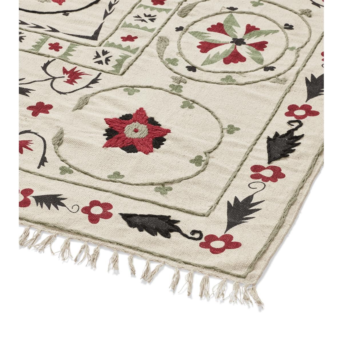 Many artisanal processes go into crafting the Ivy Rug. It is first flatwoven from cotton, before being printed with its pattern which is then embroidered by hand with wool for eye-catching embellishment. Due to the artisanal crafting, each piece will have individual characteristics that add to their charm.