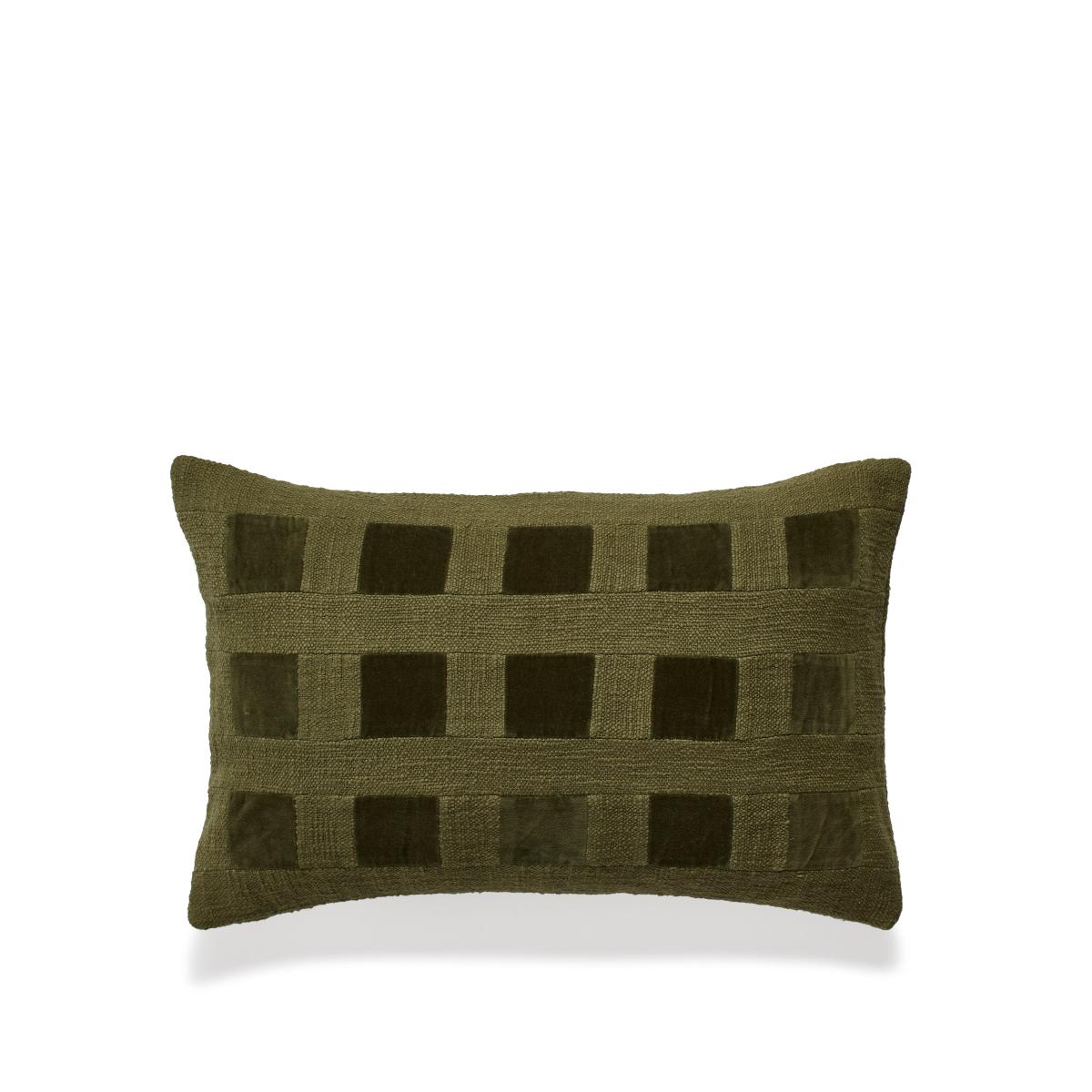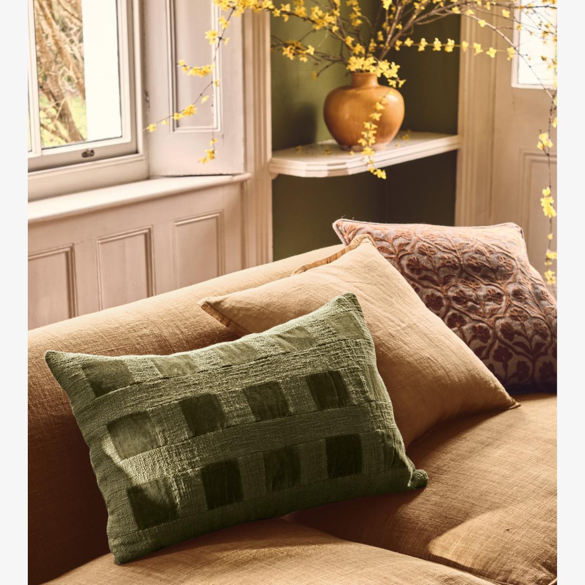 Our Janela Cushion Cover in Spruce green features a patchwork-style pattern on its front that's crafted from hand-cut velvet with matching cotton appliqué. The back remains plain with a slub-style cotton that lends the material texture.