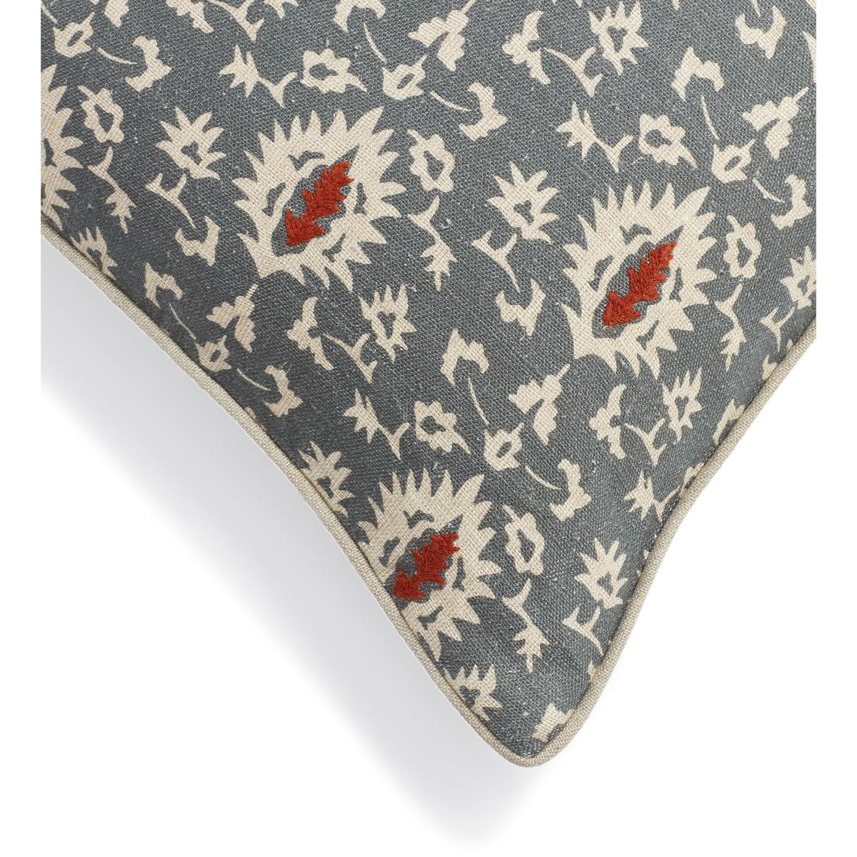 The Joti Cushion has a pretty printed design of abstract botanical motifs. This Grey Blue version has details embroidered in red thread for added texture and interest.
