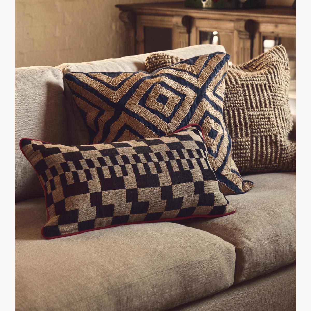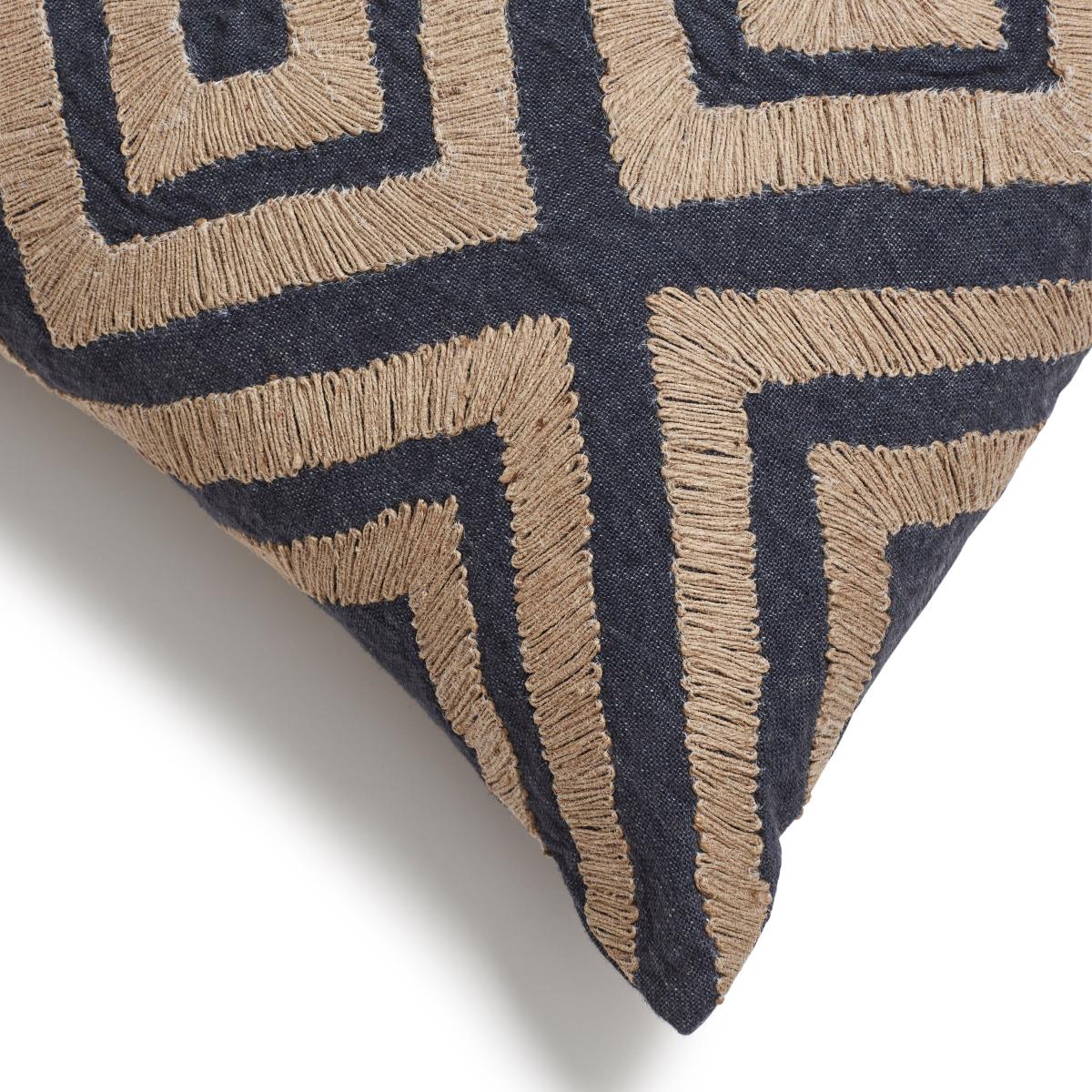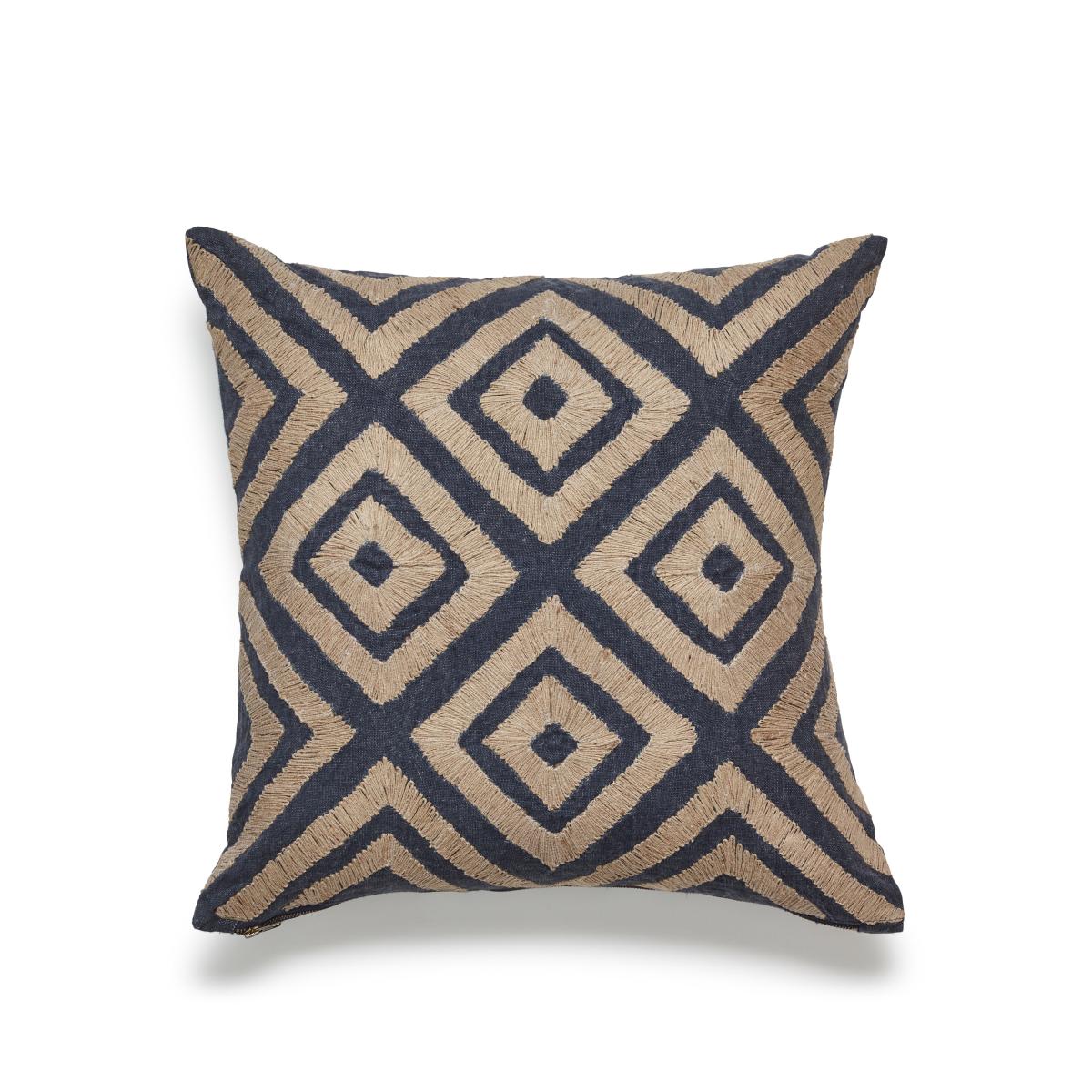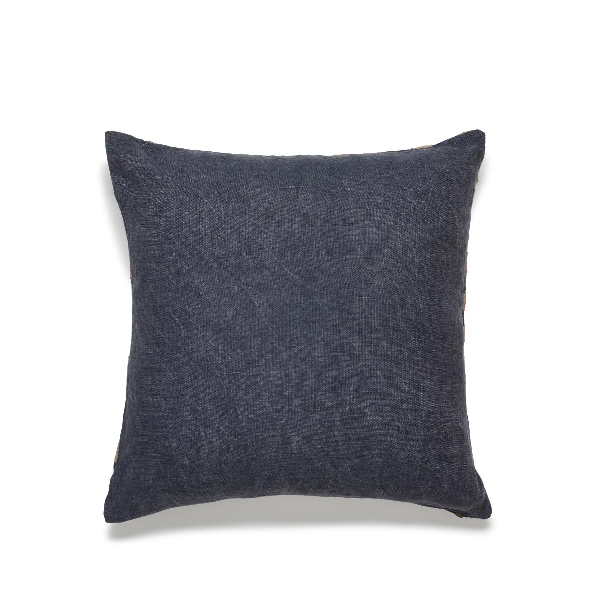 The concentric diamond pattern that graces our Jule Cushion Covers is embroidered with jute yarn onto a stonewashed Indigo linen base. Natural jute will vary in thickness which brings a wonderful individuality to each piece.