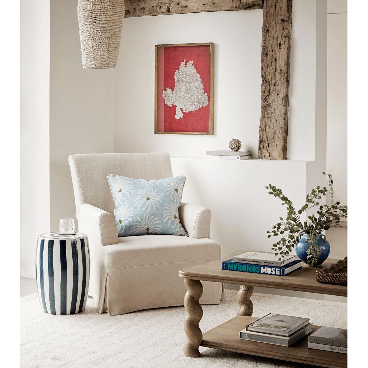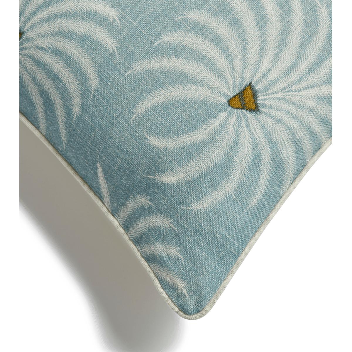 Celebrating a species of palm plant, the Jussara Cushion Cover emphasises the beautiful form of the palm’s leaves by taking inspiration from the prints of antique Indian textiles. Applied to a heavy, quality linen ground with a wonderful texture, the leafy sea-green design also features a touch of golden yellow for an extra pop of colour. Due to the artisanal processes used to create these designs, there may be some colour and pattern variation between each piece – all part of their charm.