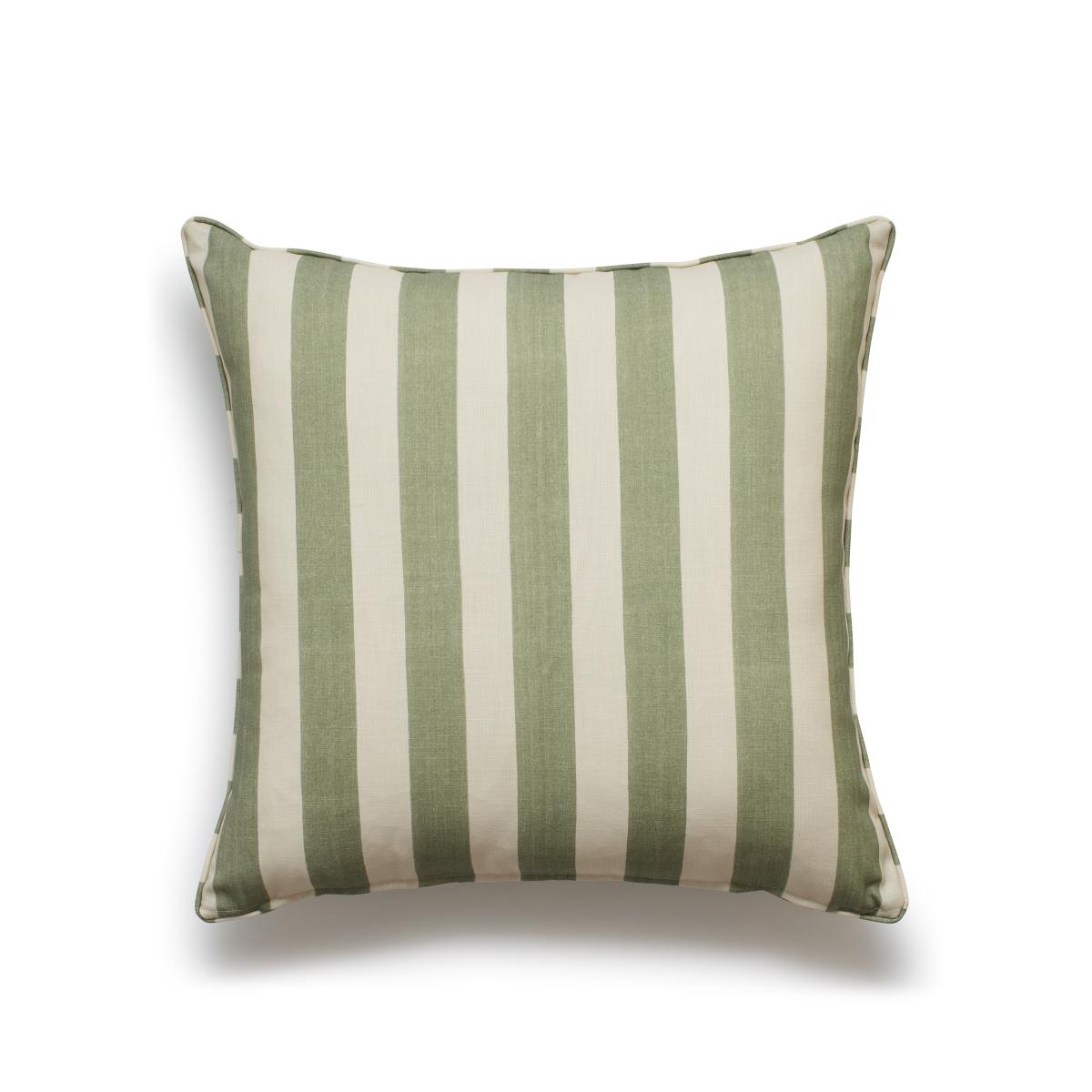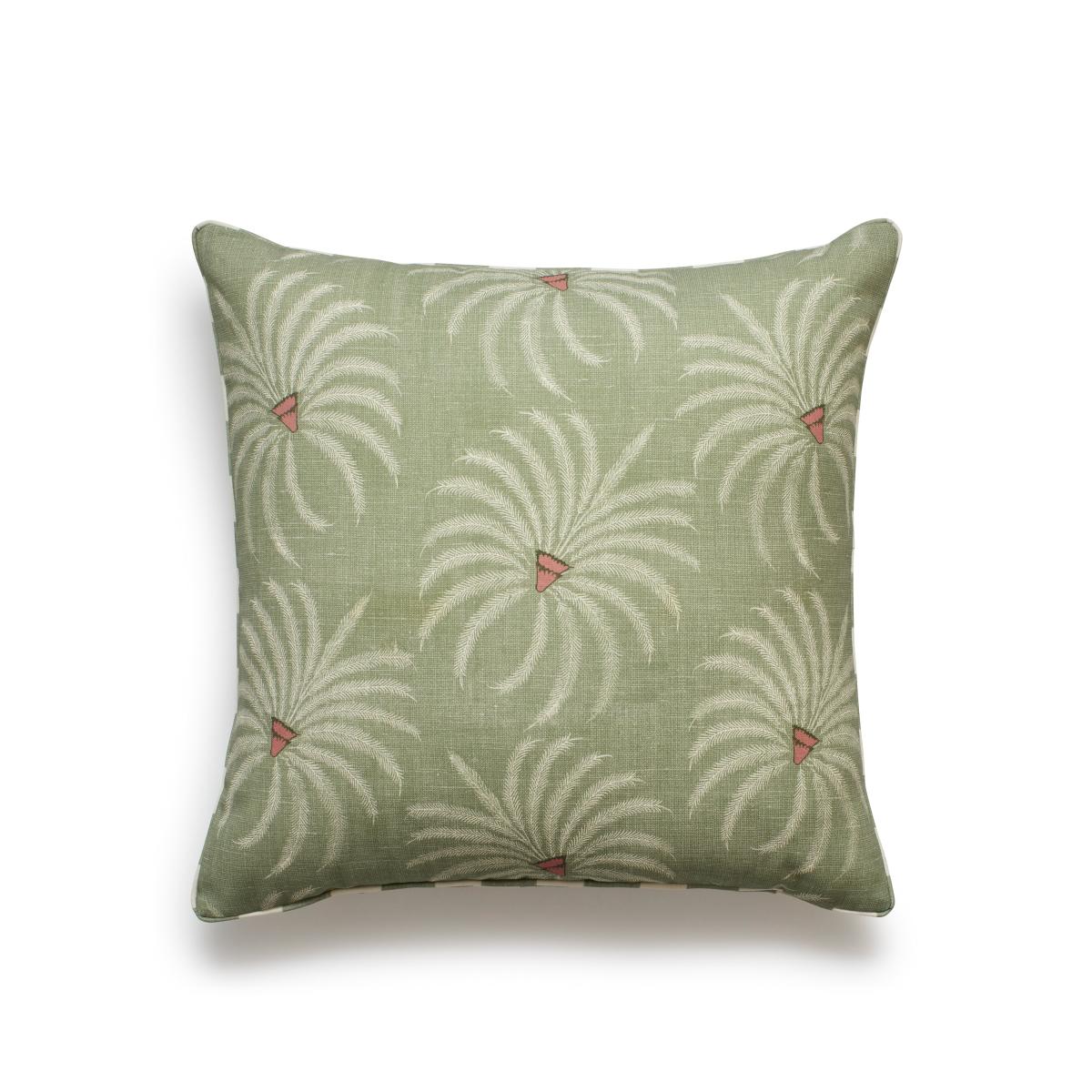 Celebrating a species of palm plant, the Jussara pattern emphasises the beautiful form of the palm's leaves by taking inspiration from the prints of antique Indian textiles. We've reimagined the print from our indoor cushion covers so that it can now be enjoyed outside. The back of the cushion features a complementary wide stripe in the same Sage Green colour.