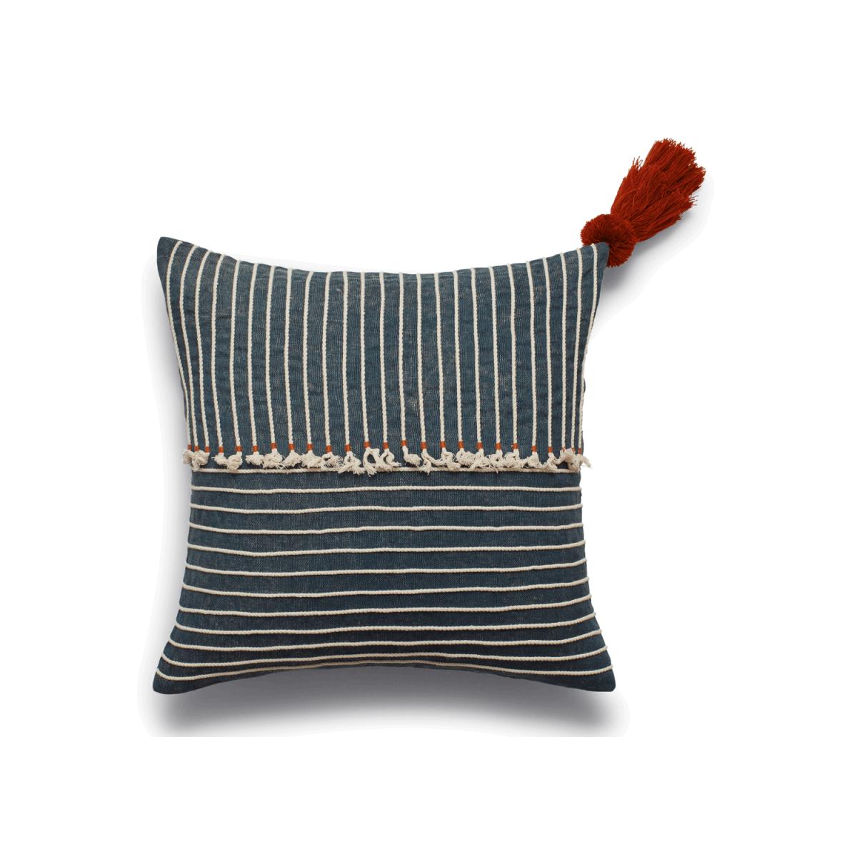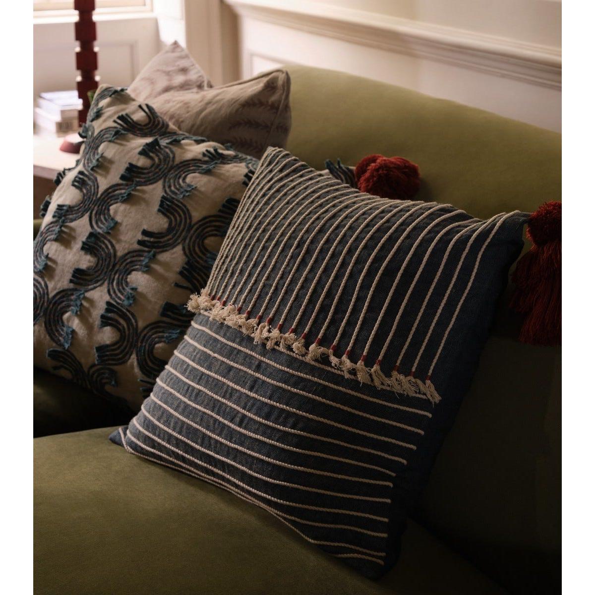 Kailani is a Hawaiian name meaning ‘sea and sky’, which perfectly encapsulates the two iterations of our Kailani Cushion Covers. This one features a nautical stripe while the other has a pleasing rainbow pattern. The chunky white cord is hand embroidered onto a dyed and mineral-washed linen base. The cushion is finished with a delightful red tassel that mimics the colour of the thread used to secure the rope-like stripes. Due to the artisanal techniques used to craft this cushion, each piece will have individual characteristics that add to their charm.