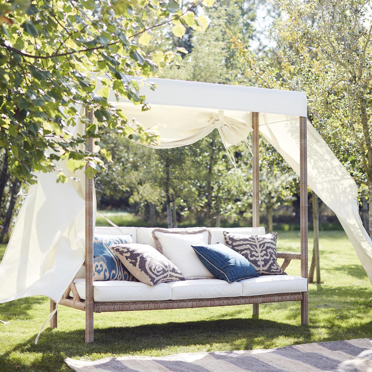 Go wild for safari chic this summer by welcoming our show-stopping Karama Daybed into your garden. This simple three-seater outdoor sofa has been transformed into a luxurious day bed using an off-white polyester canopy and curtains, the latter of which can either be rolled up when you want a cool breeze to waft through, or rolled down should you want extra shade (or a bit of privacy). Whilst we can't promise majestic views across the Savannah, we can guarantee our Karama Daybed will deliver comfort, shade and luxury to any outdoor space.