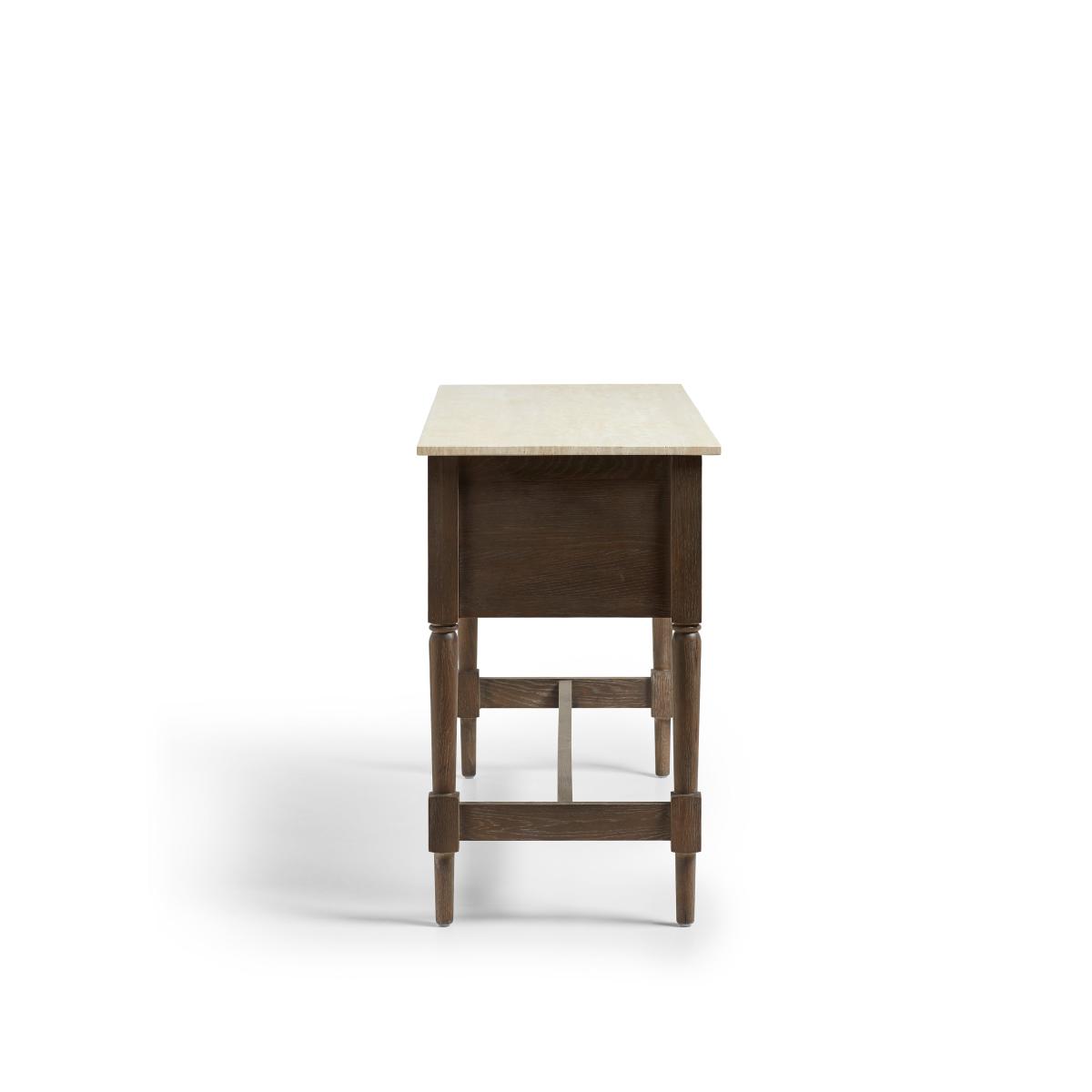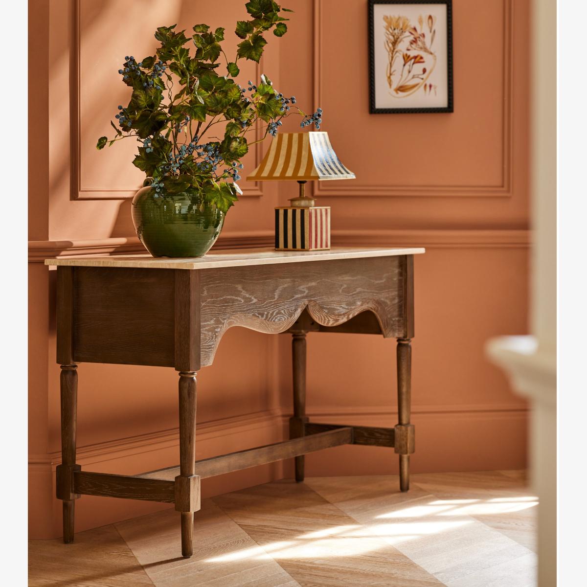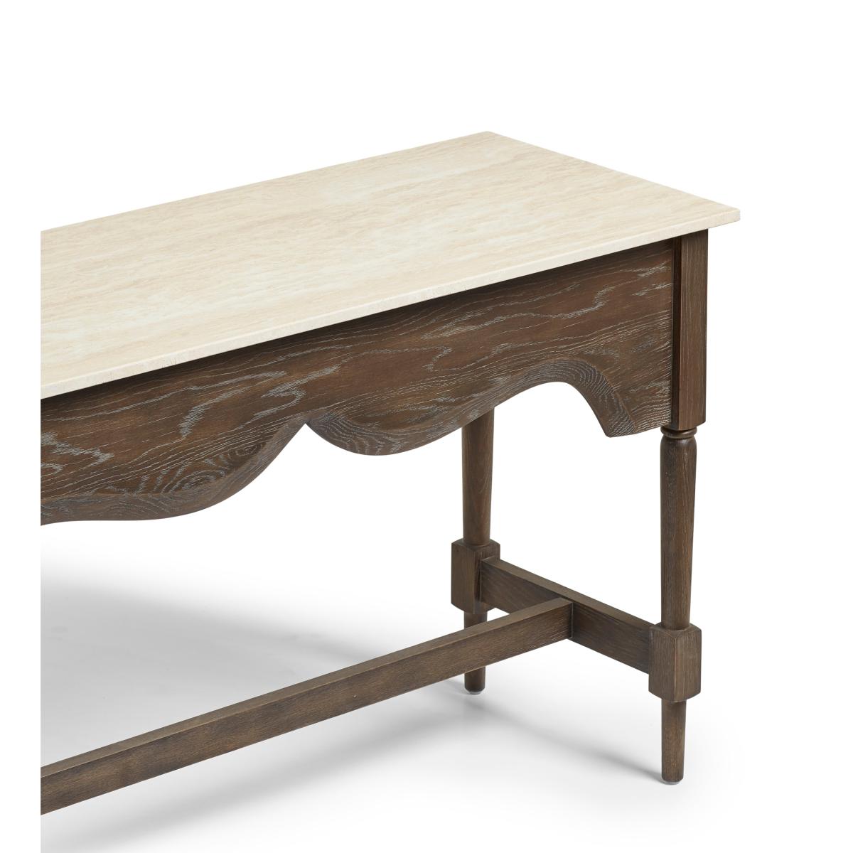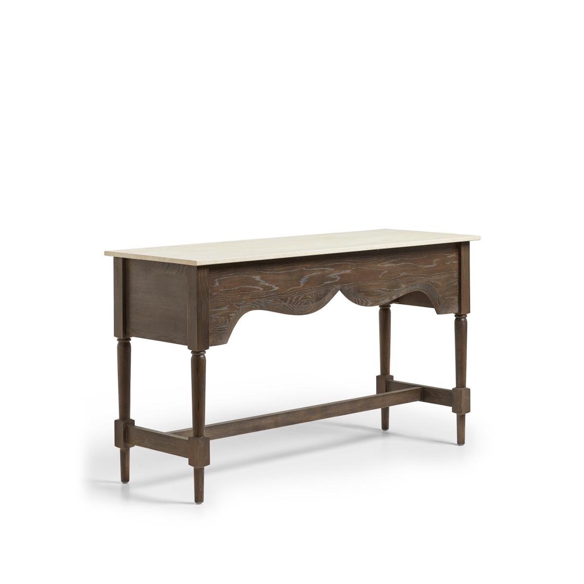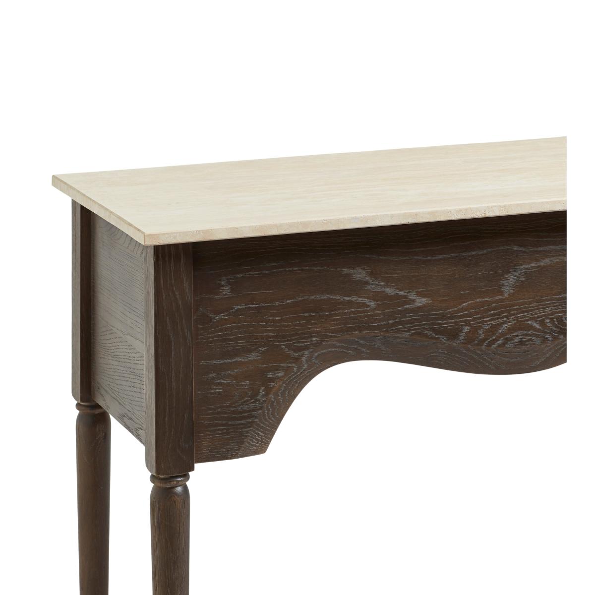 Characterised by its glamorous Travertine top and an espresso-coloured frame beautifully-crafted from solid wood, the Kemp Console Table is sure to make an entrance in your hallway. There's further attention to detail in the undulating wave shape on the front of the table.