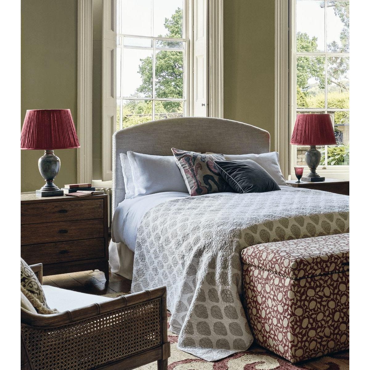 A contemporary twist on the traditional upholstered headboard, our arch-shaped Stanhope Headboard was created by Annabel Astor. Upholstered in 100% natural linen, with a smart double-studded "polished silver" border along the sides and top, the headboard requires no fixing – it simply stands between the back of the bed and the wall.