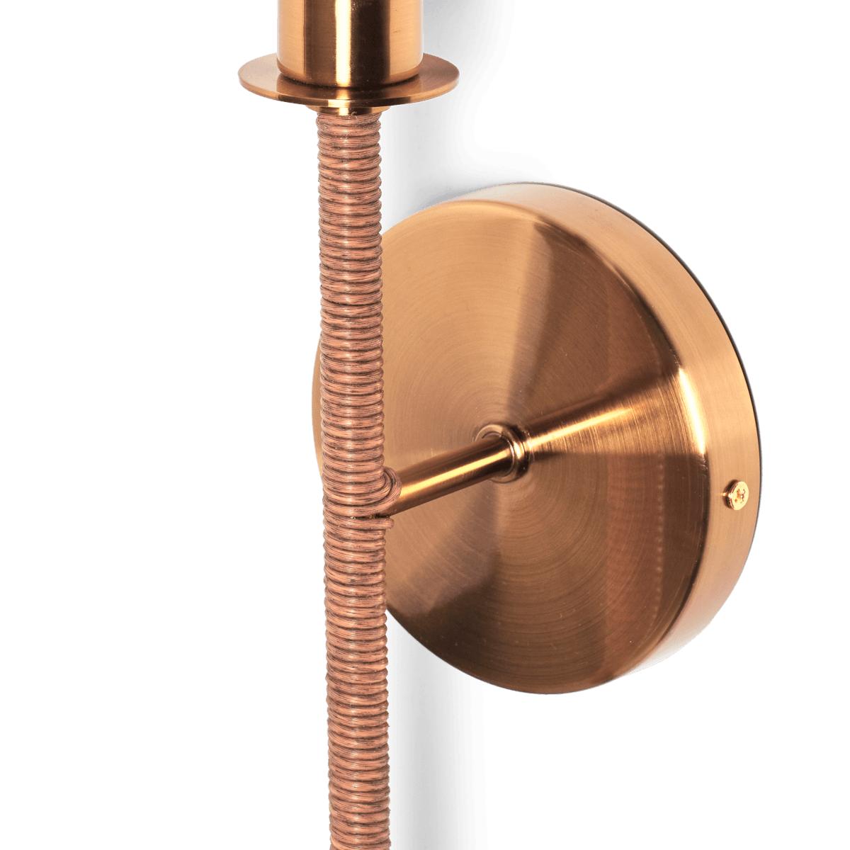 The Kirana Wall Lamp has a sophisticated appearance due to the faux rattan that wraps around its iron hardware, with the exposed metal electro-plated with a brass finish.