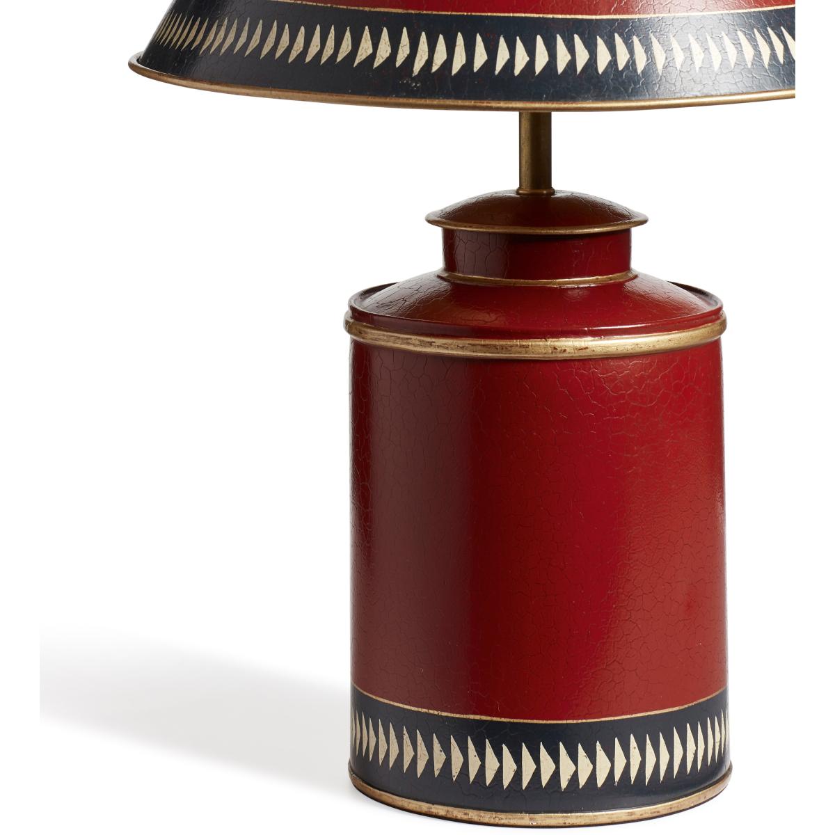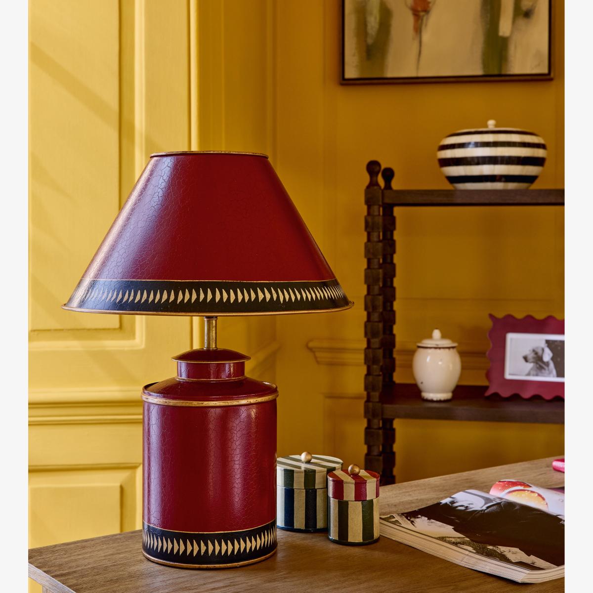 The Kolmio Table Lamp is a striking piece, handmade from iron and meticulously hand-painted in red with a repeating arrow-pattern border and bronzed edges. The shade is hand formed and hand welded, combining vintage style with Regency-era gold touches and bold, rich colours. The details are hand painted by a small group of talented artisans led by a master painter who has honed their craft over many generations to produce these beautifully layered pieces. The colour is created in a lengthy process through many layers of paint; the craftspeople wait for each layer to dry before applying the next, and finally adding a crackled effect for antique style. Due to the artisanal techniques used, each piece will have individual characteristics that add to their charm. This lamp would look beautiful tucked away in a reading corner, adding interest and colour into the darkest corners of your home or equally, front and centre as a focus of your desk or dressing table for all to see.