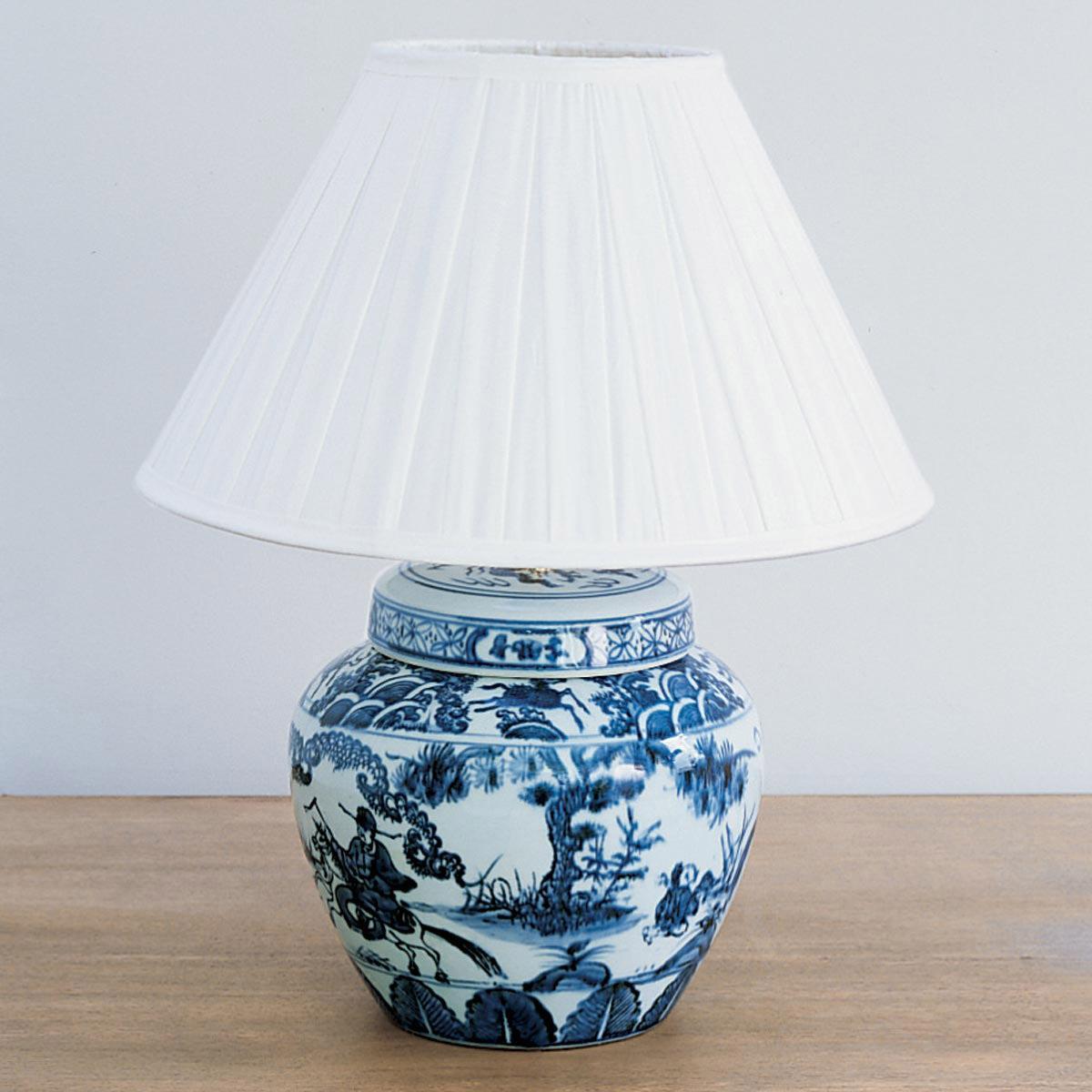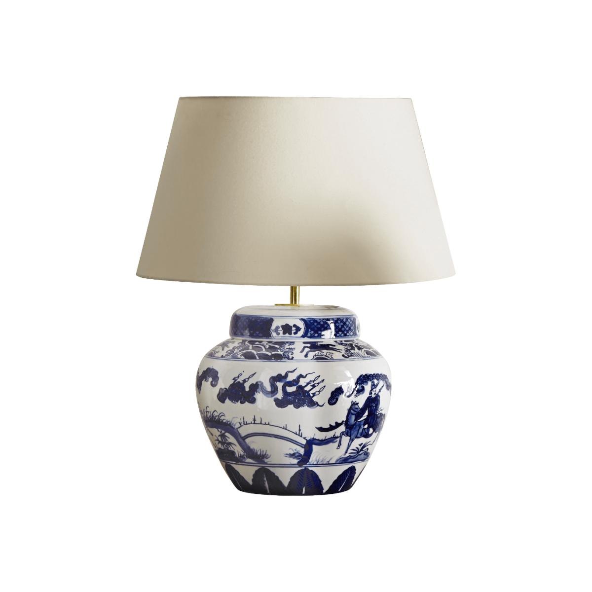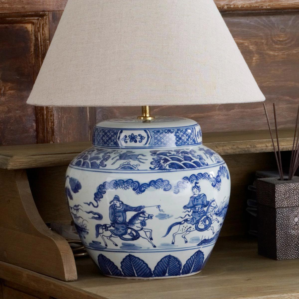 Our ginger jar shaped lamp base is hand-painted with traditional Chinese warrior scenes. A lovely feature lamp for a table or desk, we recommend a 40-45cm diameter shade for use with this lamp.
