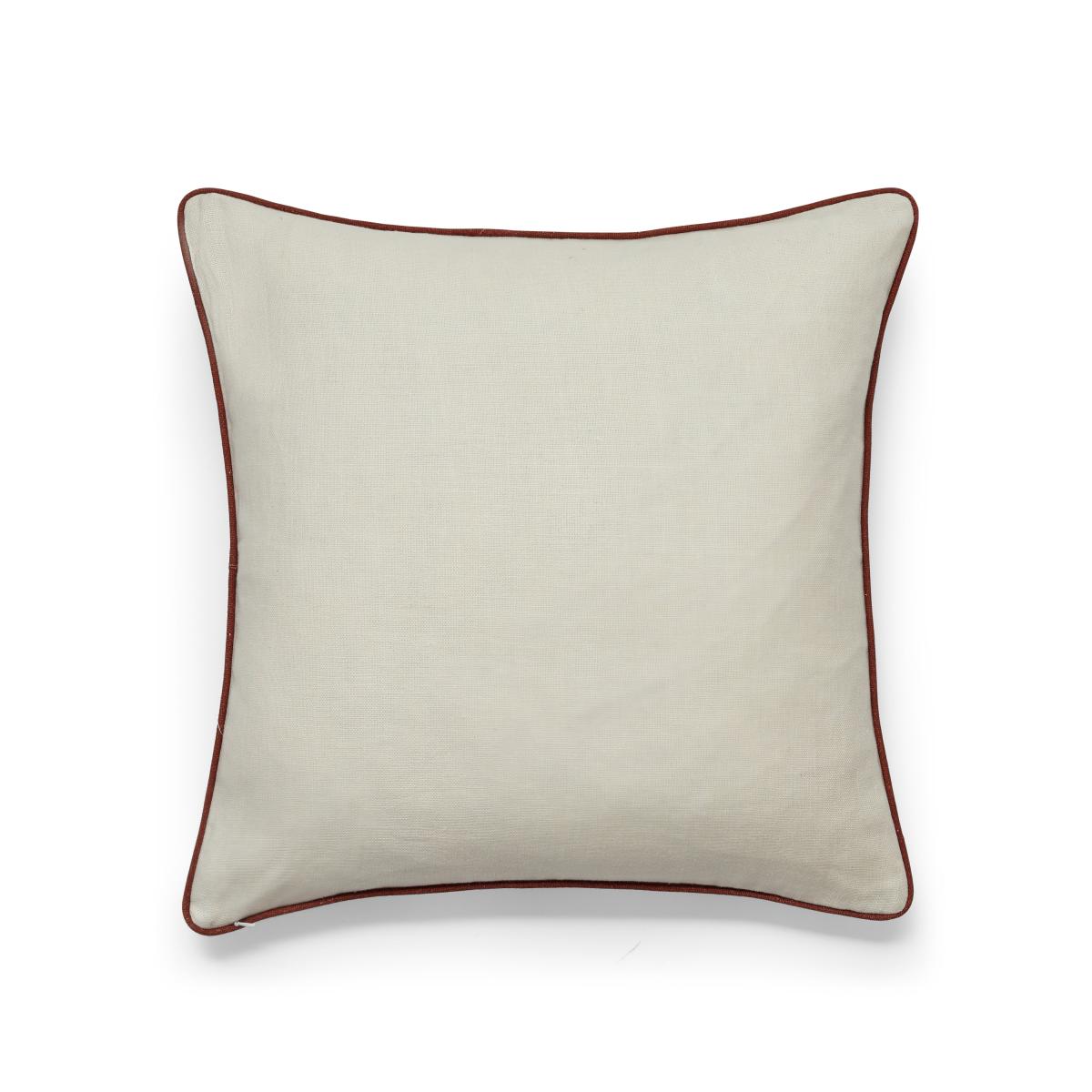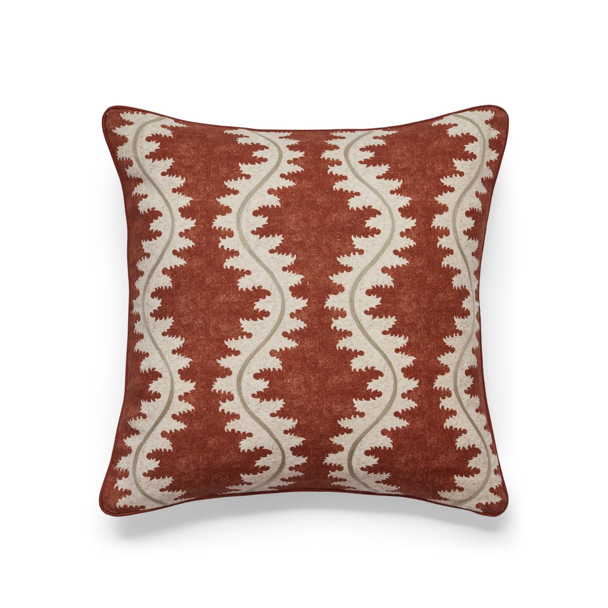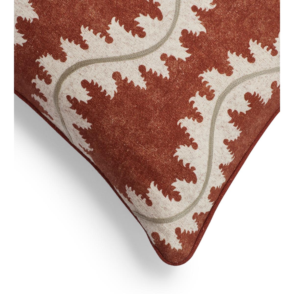 Inspired by the undulating waves of hanging Turkish tulip decorations, our square Lahar Cushion Cover adds a touch of far-flung style to any space. The distinctive pattern is digitally-printed on linen on one side with chain-stitch embroidery adding further detail and tactility. The earthy-red colourway adds warmth and complements any scheme.