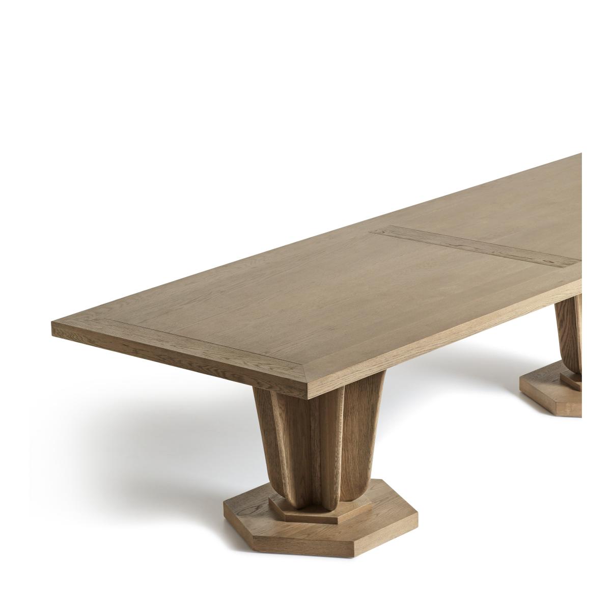 Our Allegro Dining Table features a base that flares upwards and outwards comparably to a gramophone, which lent it its musical name. This is the largest of our three rectangular versions, though it is also available in two round variations. Round tables create a more intimate experience while the linear version is a more traditional choice. All the tops feature an indentation that frames the edge, drawing attention to the character in the textured grain of the oak. This version comes in a light Weathered Oak, but it is also available in a warm Burnt Oak finish.