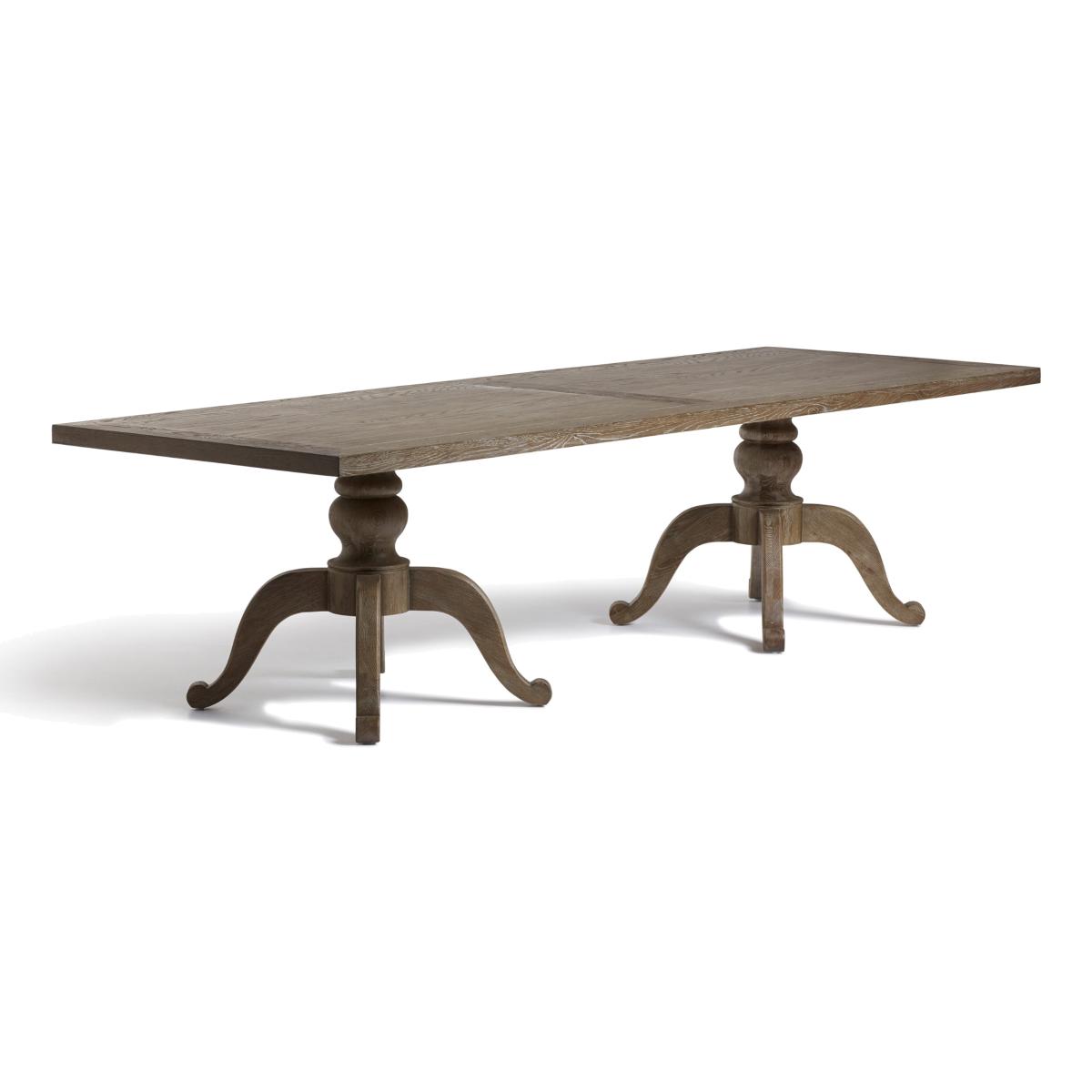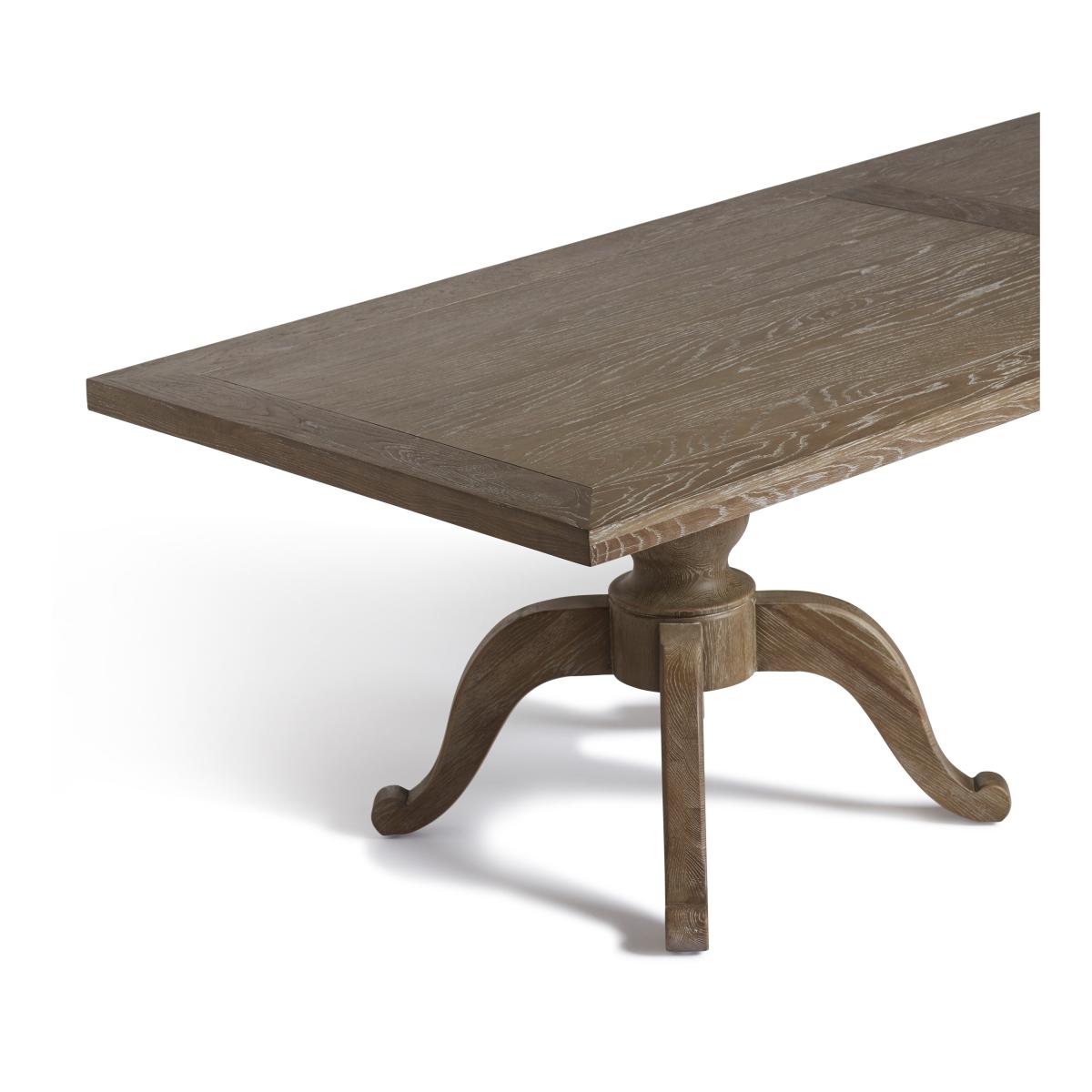 Our Arthur Dining Table features a signature curved pedestal base with tripod-style feet. This is the largest of our three rectangular versions, though it is also available in two round variations. Round tables create a more intimate experience while the linear version is a more traditional choice. All the tops feature an indentation that frames the edge, drawing attention to the character in the textured grain of the oak. This version comes in a warm Burnt Oak, but it is also available in a paler Weathered Oak finish.