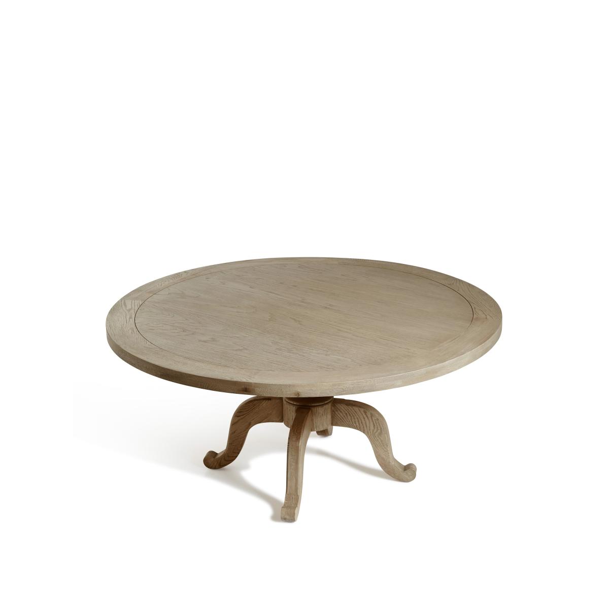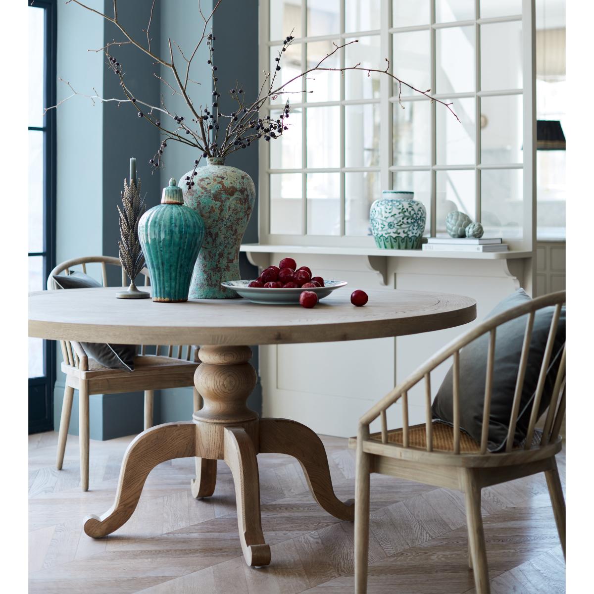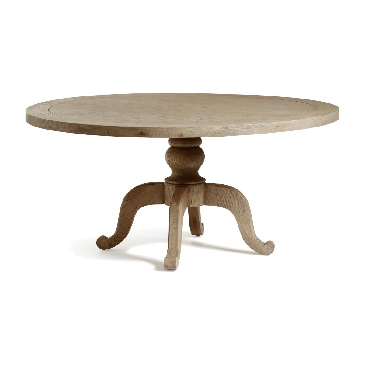 Our Arthur Dining Table features a signature curved pedestal base with tripod-style feet. This is the larger of our two round versions, though it is also available in three rectangular variations. Round tables create a more intimate experience while the linear version is more traditional. All the tops feature an indentation that frames the edge, drawing attention to the character in the textured grain of the oak. This version comes in a light Weathered Oak, but it is also available in a warm Burnt Oak finish.