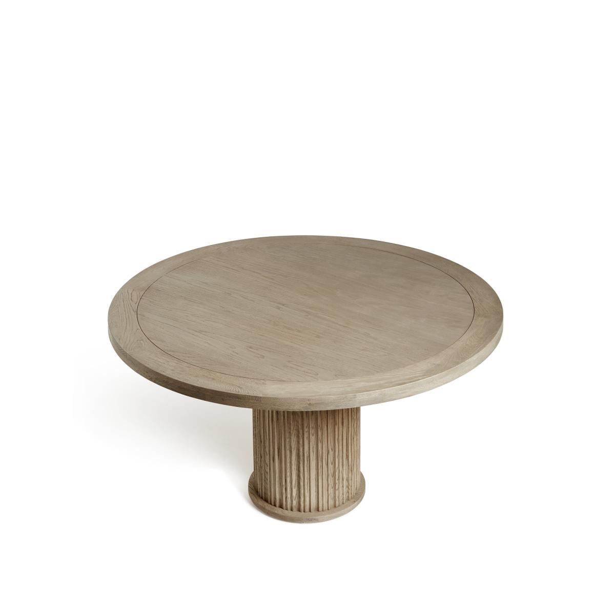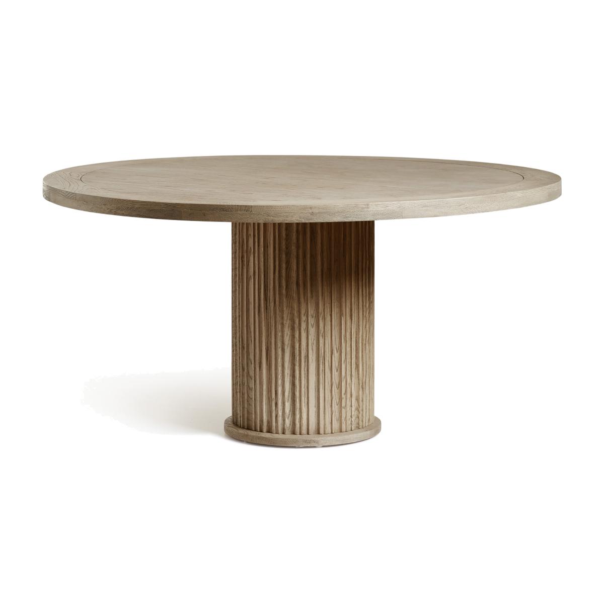 Our Marcus Dining Table features a smart, fluted column base. This is the larger of our two round versions, though it is also available in three rectangular variations. Round tables create a more intimate experience while the linear version is more traditional. All the tops feature an indentation that frames the edge, drawing attention to the character in the textured grain of the oak. This version comes in a light Weathered Oak, but it is also available in a warm Burnt Oak finish.