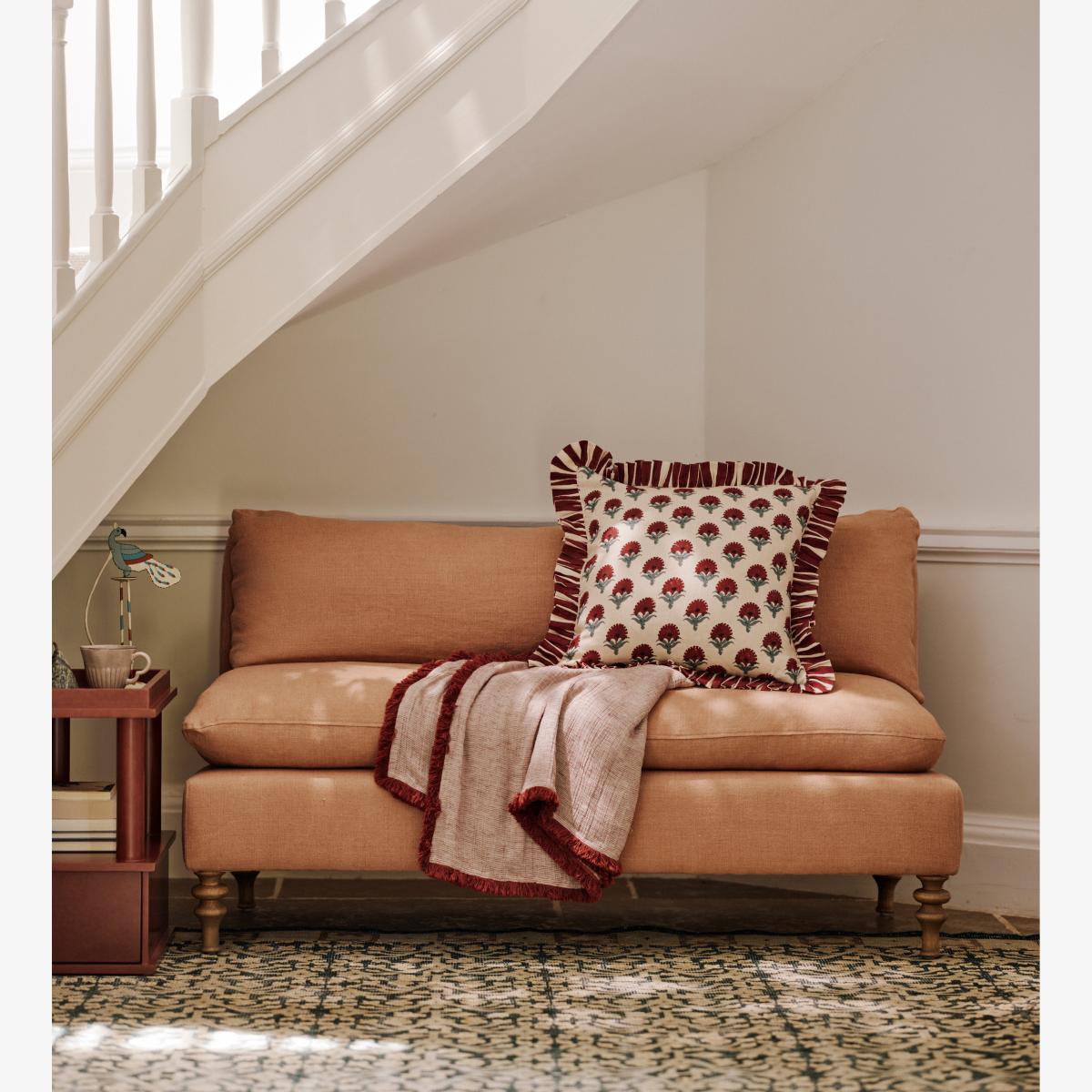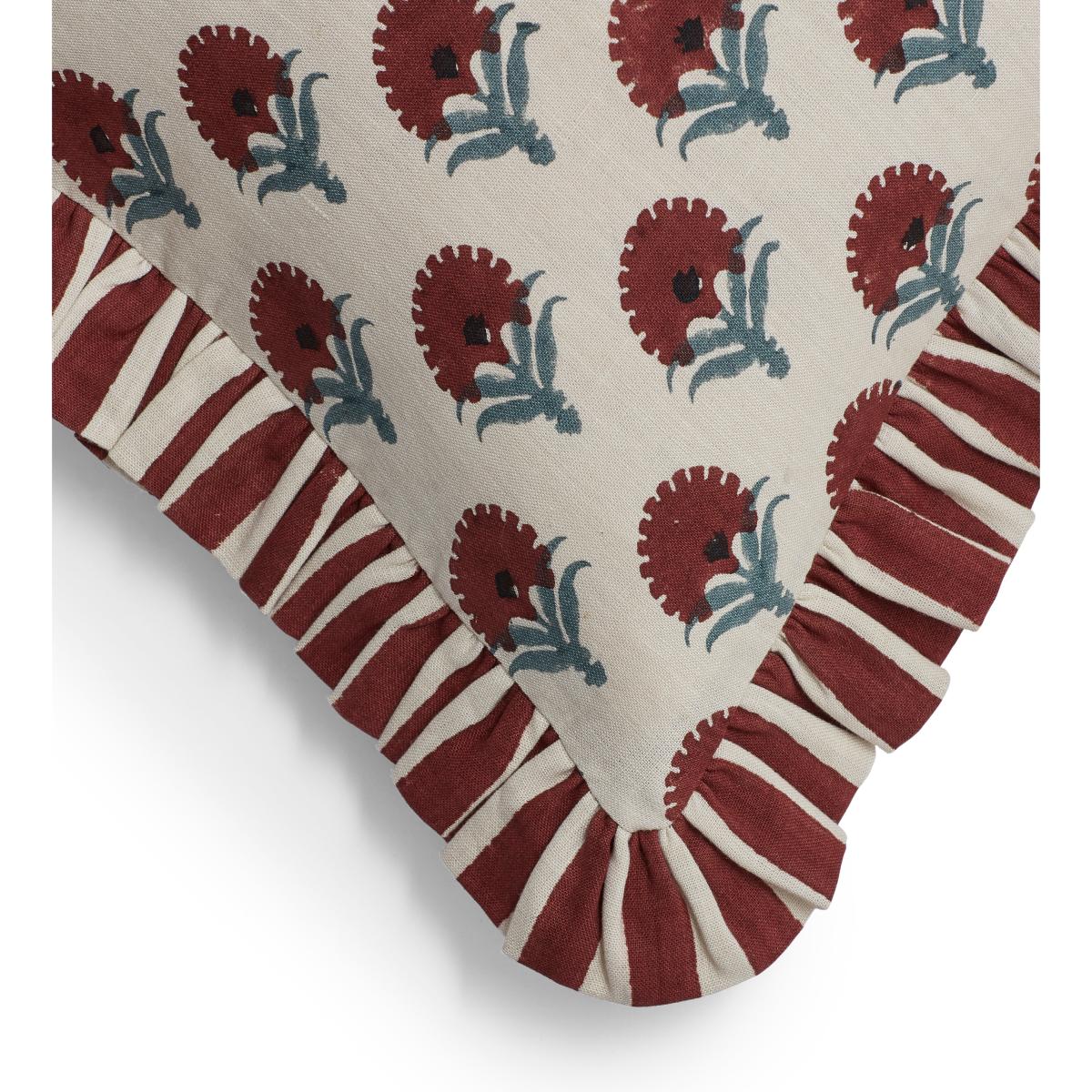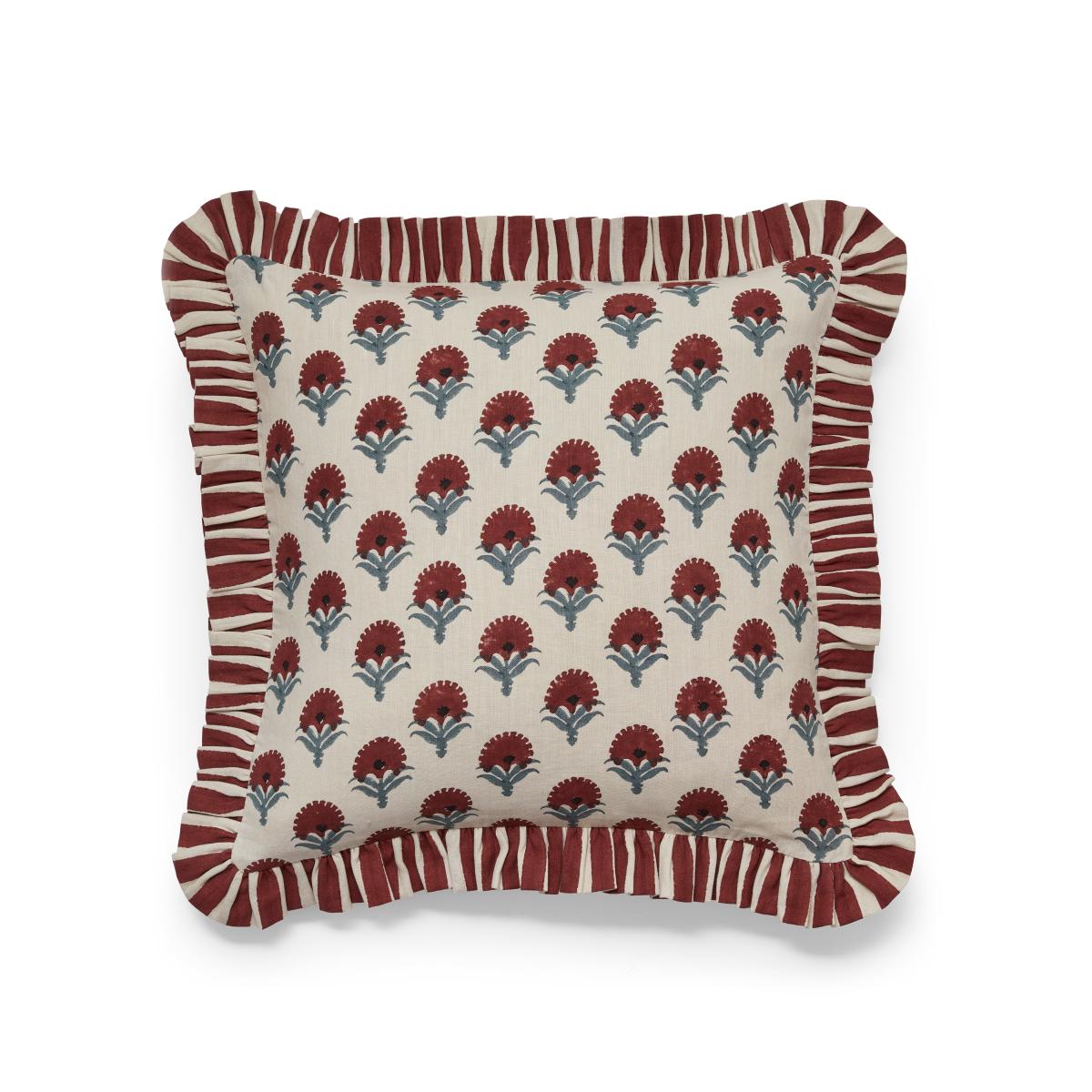 Add a touch of whimsy to your home with our square Laktan Cushion Cover. It features a stylish flower print in a blood-orange colourway that’s block-printed on 100% linen on both sides. Even more playful is the double-sided ruffle trim.
