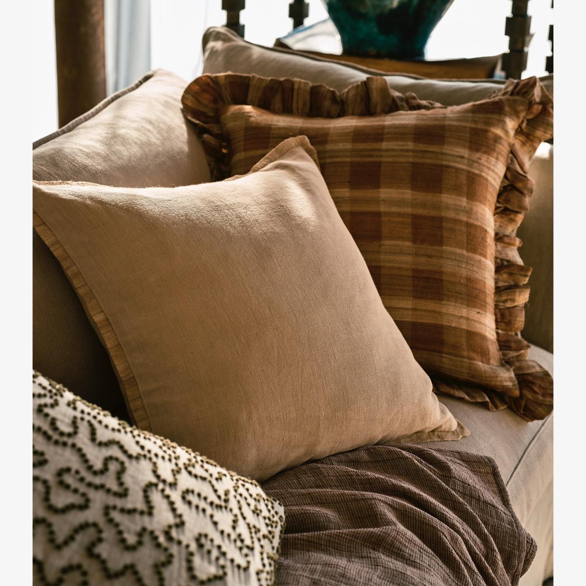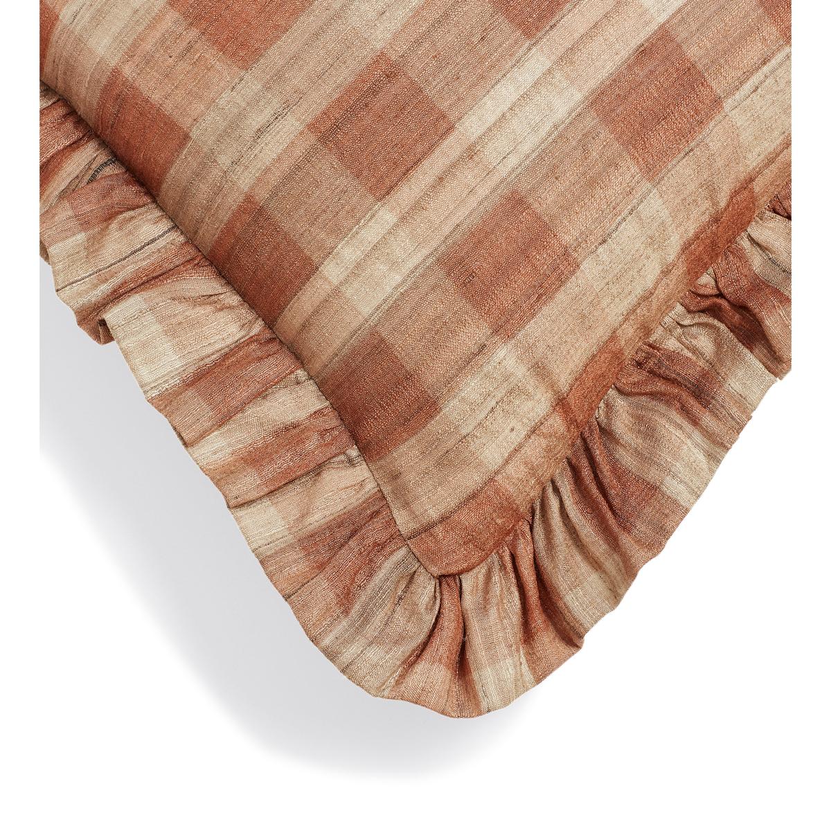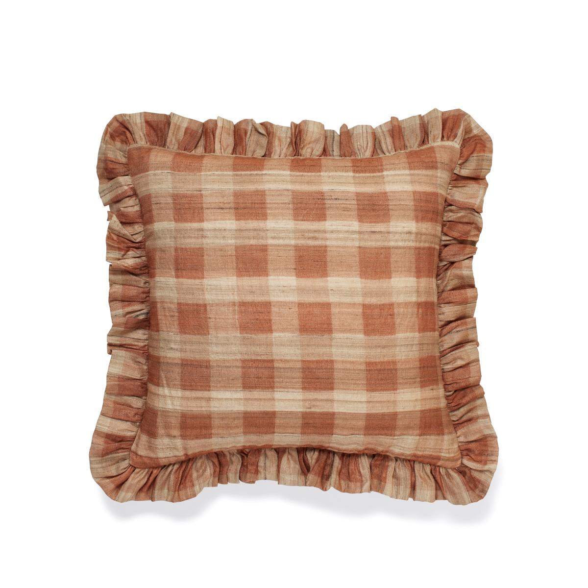 The chunky check design of our Lavanya Cushion Cover is crafted from tussar silk that's hand-screen printed in a warm Apricot hue. The natural material is cultivated in the Indian states that have been producing the yarn for centuries. Each stripe is screen printed by hand both across and down the cloth, creating layered depth. Due to the nature of the fabric and the artisanal processes that shape these cushion covers, there may be some variation in colour and texture between each piece - that, plus a ruffled border all adds to their charm.
