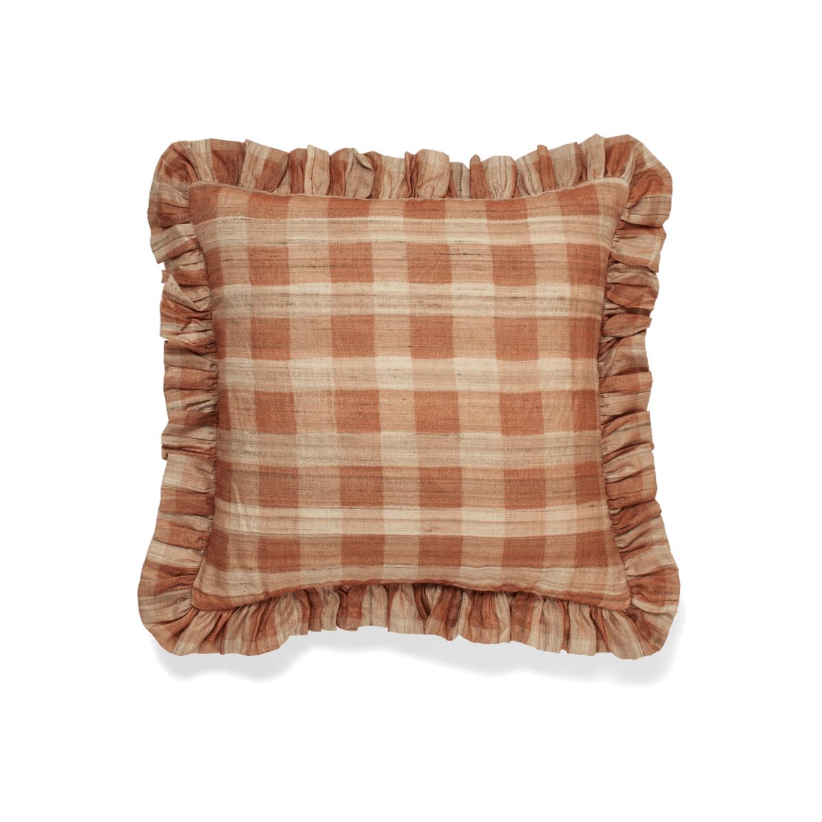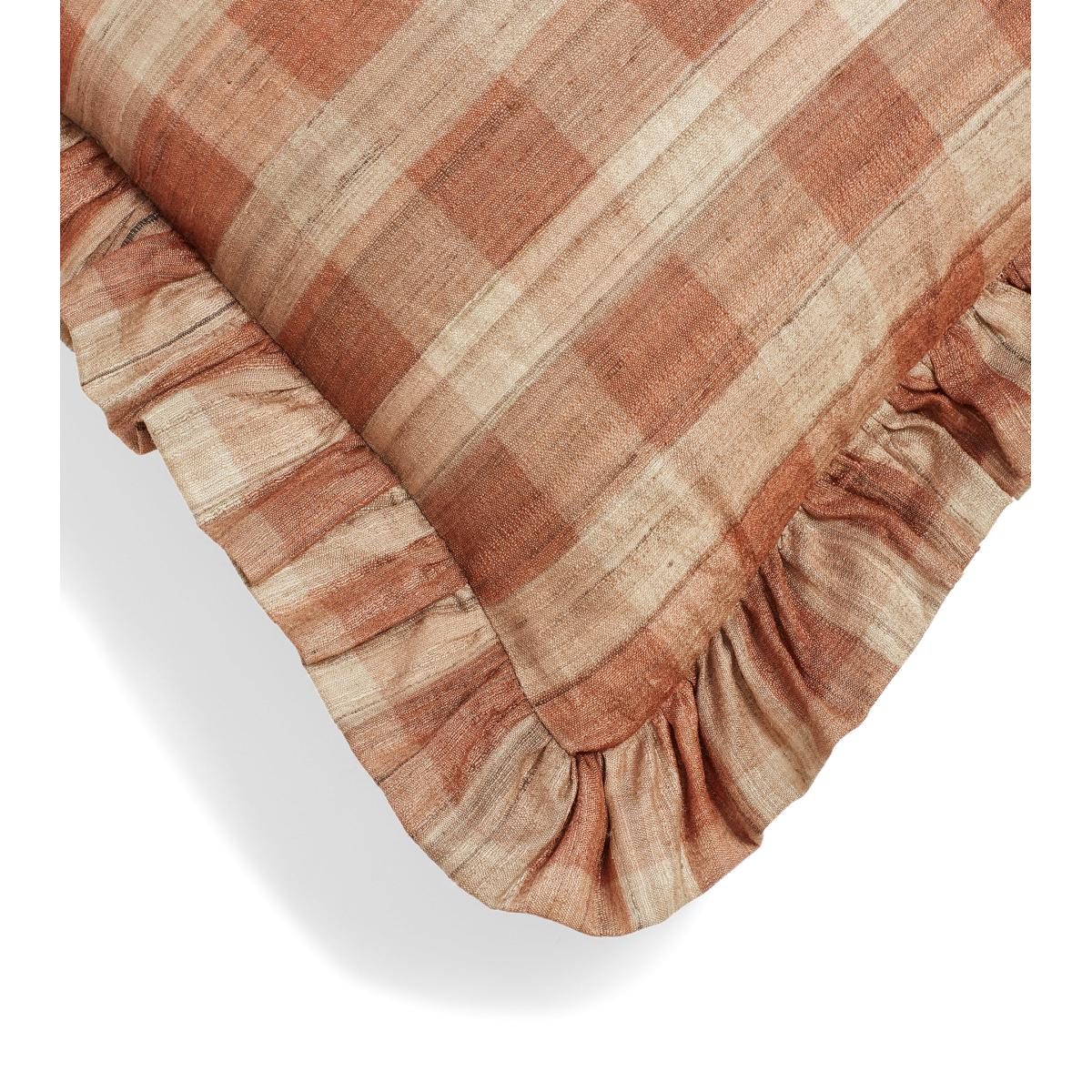 The chunky check design of our Lavanya Cushion Cover is crafted from tussar silk that’s hand-screen printed in a warm Apricot hue. The natural material is cultivated in the Indian states that have been producing the yarn for centuries. Each stripe is screen printed by hand both across and down the cloth, creating layered depth. Due to the nature of the fabric and the artisanal processes that shape these cushion covers, there may be some variation in colour and texture between each piece – that, plus a ruffled border all adds to their charm.